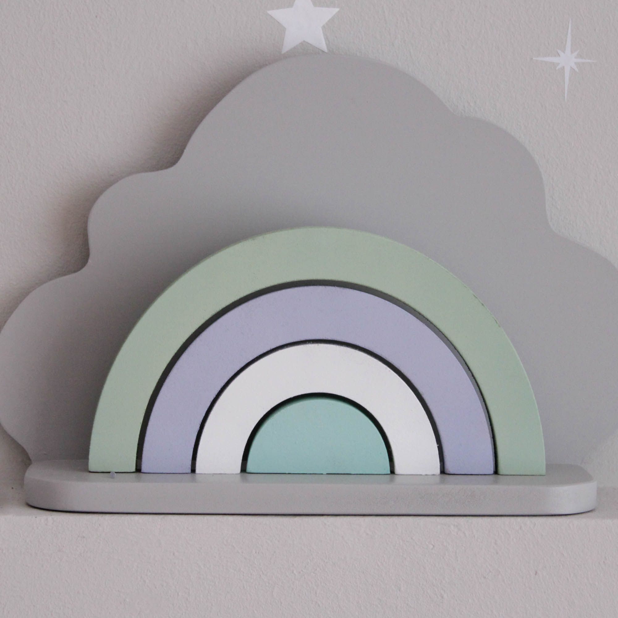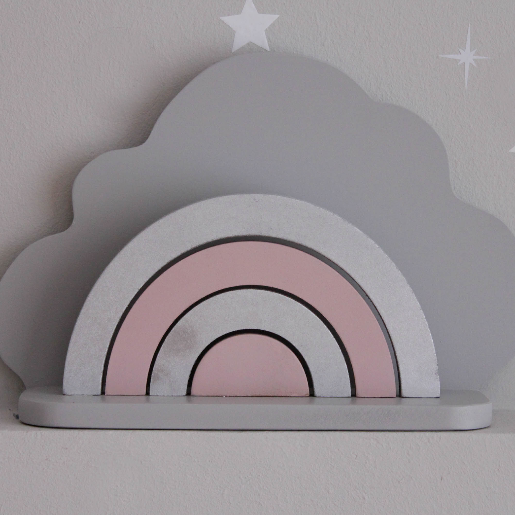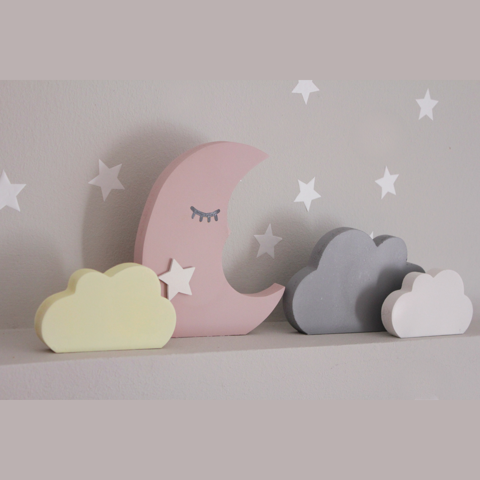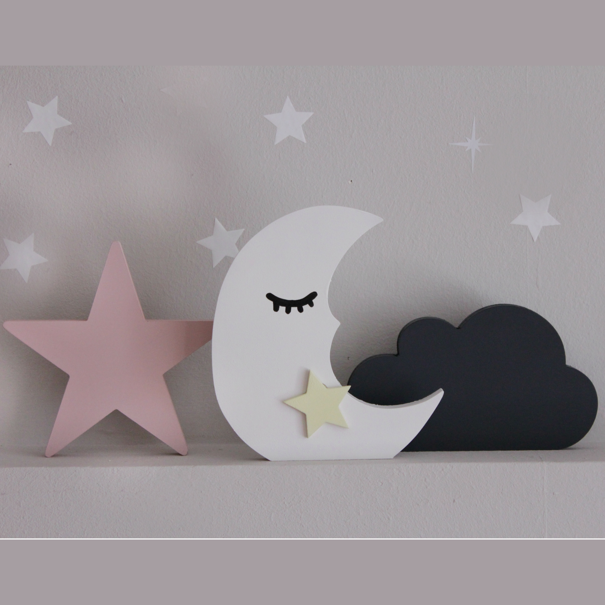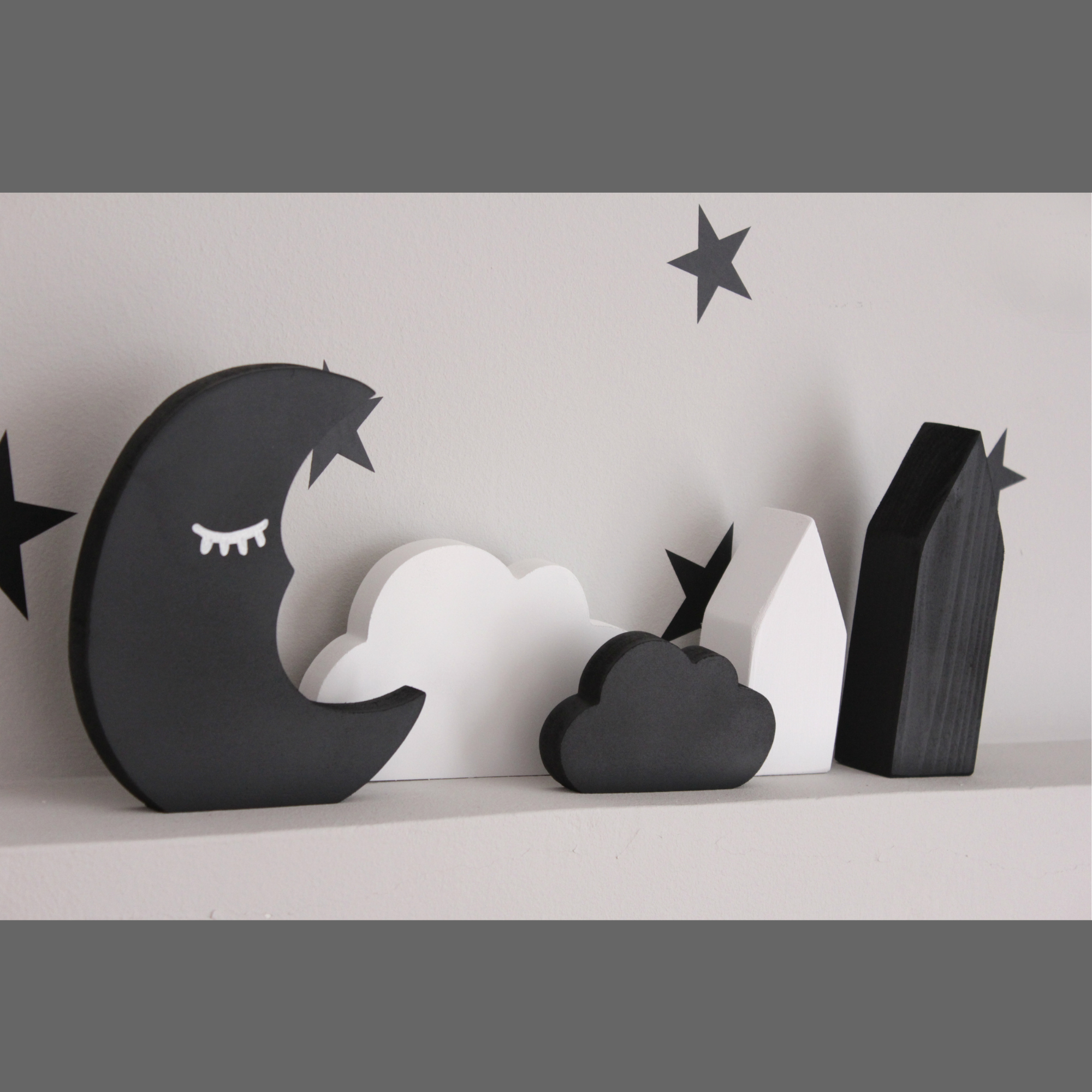 Για να πλαισιώσουμε όμορφα τα ραφάκια μας κατασκευάσαμε εξίσου ιδιαίτερα, ξύλινα διακοσμητικά που στηρίζονται μόνα τους και μπορούν να τοποθετηθούν σε οποιοδήποτε σημείο στο παιδικό δωμάτιο. Τα σχέδια που υπάρχουν είναι σχέδιο σπιτάκι σε δύο διαστάσεις, σχέδιο σύννεφο σε δύο διαστάσεις, σχέδιο φεγγάρι με ματάκι, λαγός ουράνιο τόξο και σχέδιο αστέρι σε τρεις διαστάσεις, Είναι από mdf και βαμμένα με οικολογικά χρώματα. . Δημιουργείστε τον δικό σας μοναδικό συνδυασμό!