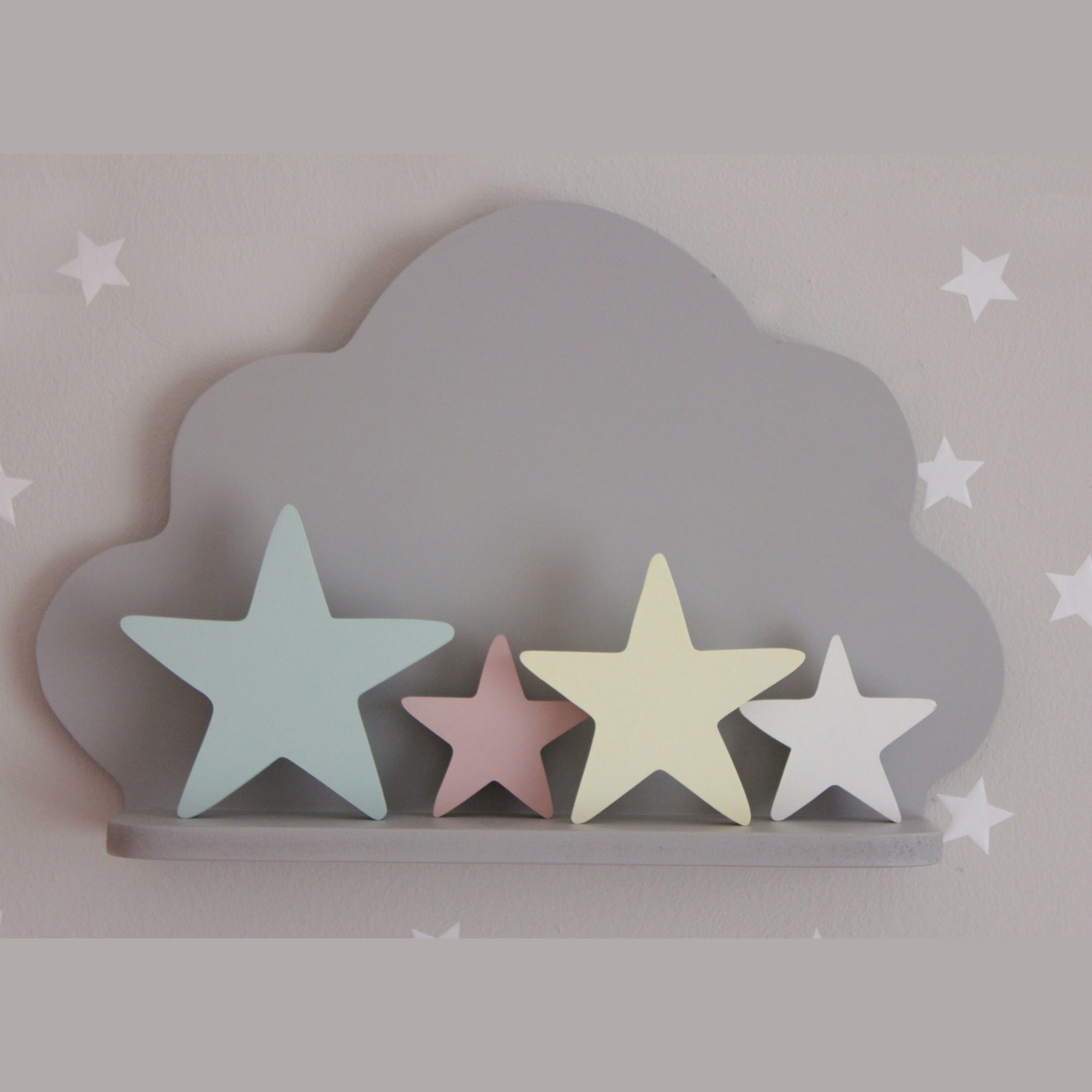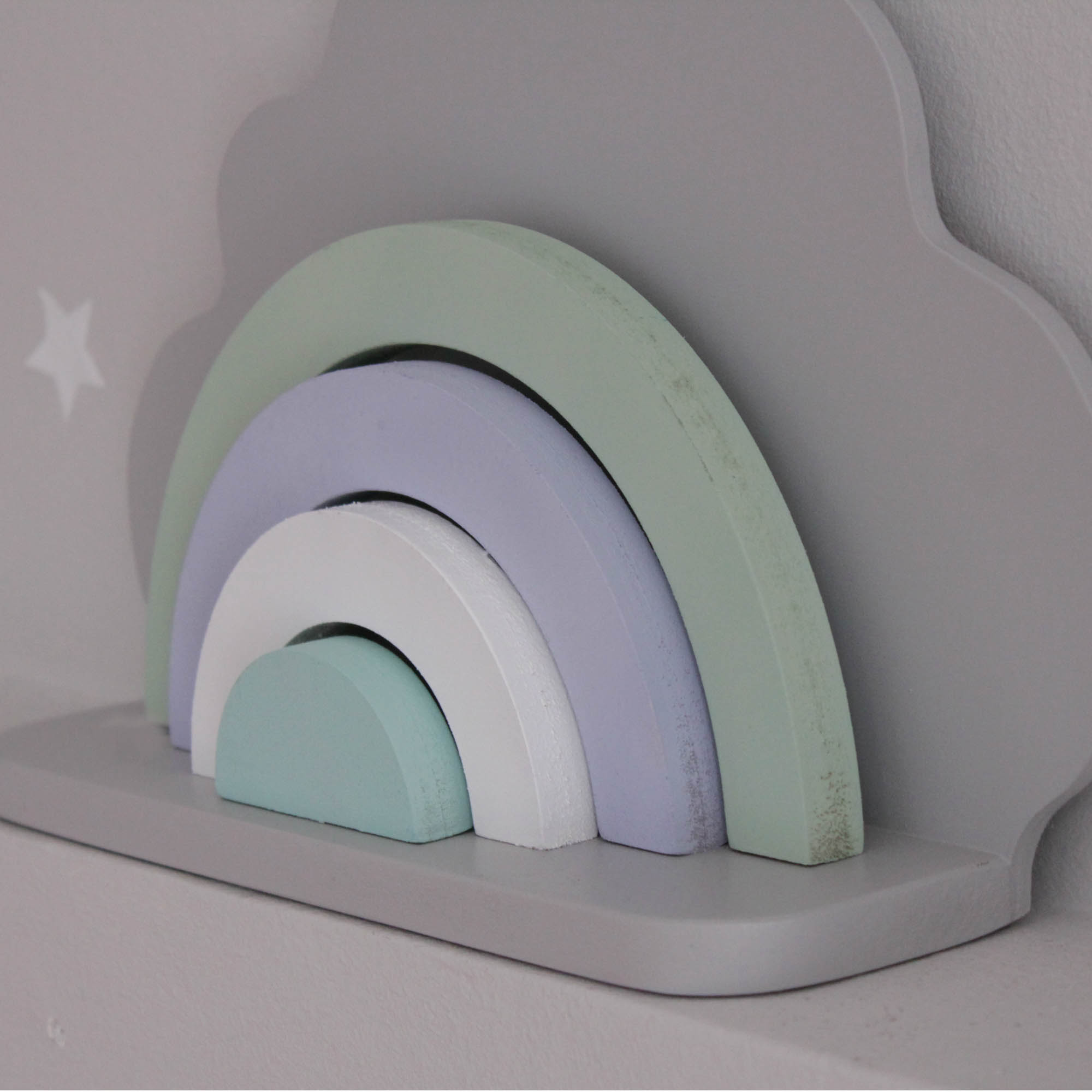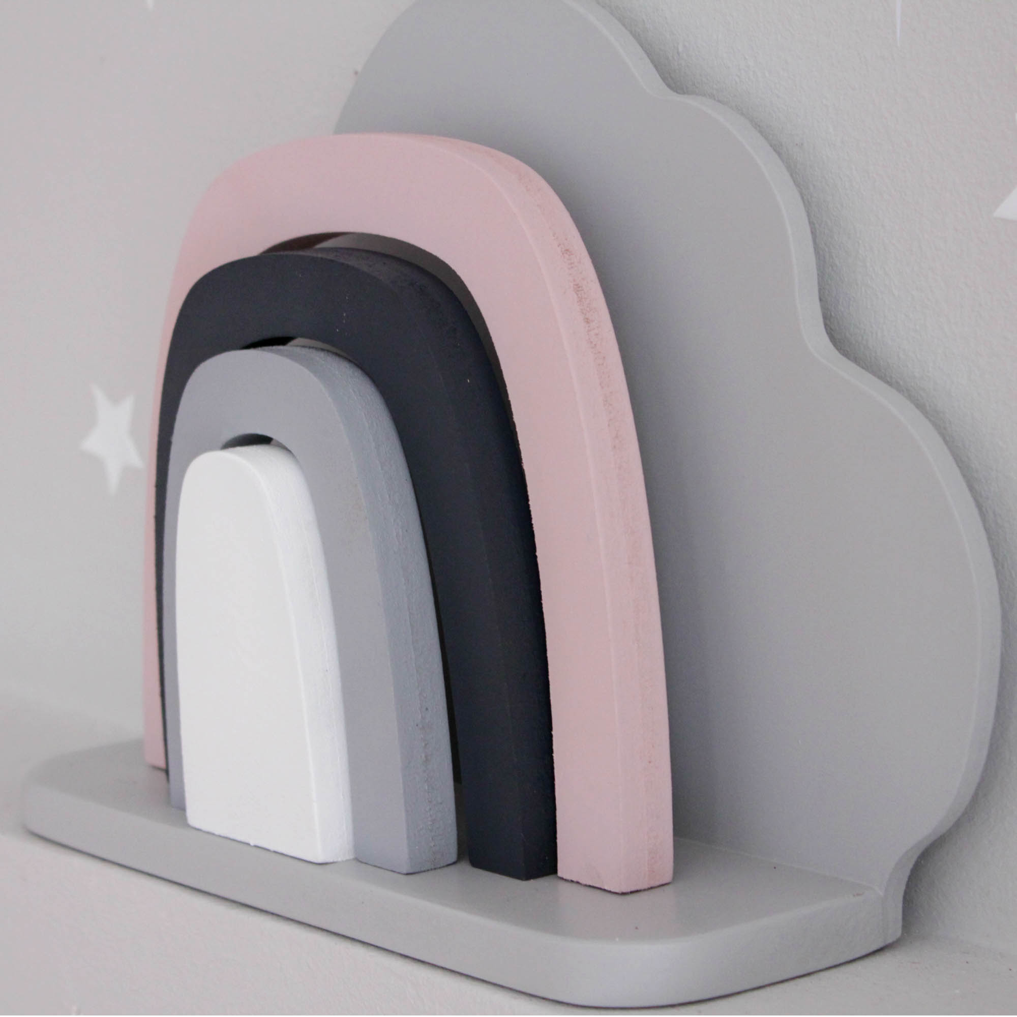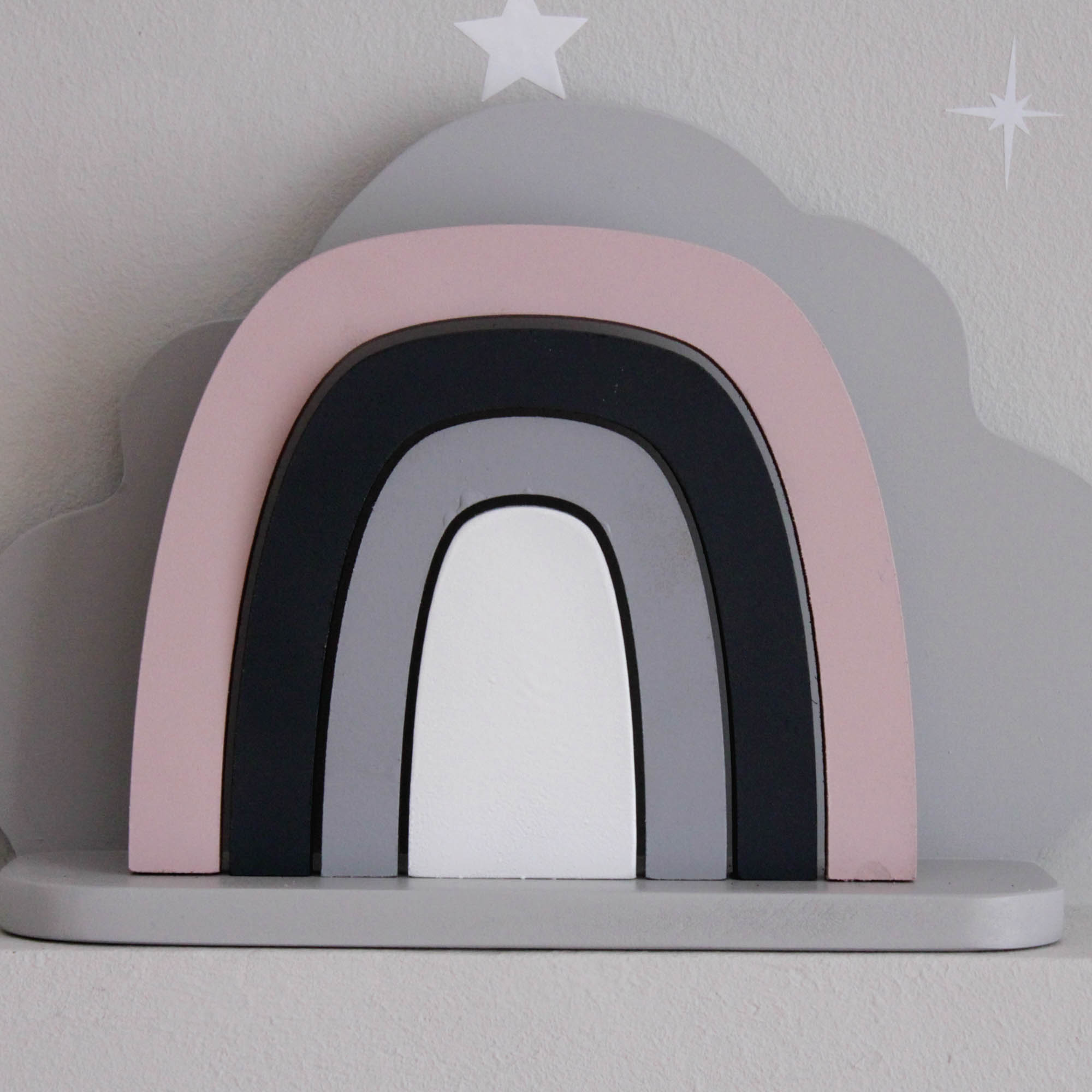 Για να πλαισιώσουμε όμορφα τα ραφάκια μας κατασκευάσαμε εξίσου ιδιαίτερα, ξύλινα διακοσμητικά που στηρίζονται μόνα τους και μπορούν να τοποθετηθούν σε οποιοδήποτε σημείο στο παιδικό δωμάτιο. Τα σχέδια που υπάρχουν είναι σχέδιο σπιτάκι σε δύο διαστάσεις, σχέδιο σύννεφο σε δύο διαστάσεις, σχέδιο φεγγάρι με ματάκι, λαγός ουράνιο τόξο και σχέδιο αστέρι σε τρεις διαστάσεις, Είναι από mdf και βαμμένα με οικολογικά χρώματα. . Δημιουργείστε τον δικό σας μοναδικό συνδυασμό!
