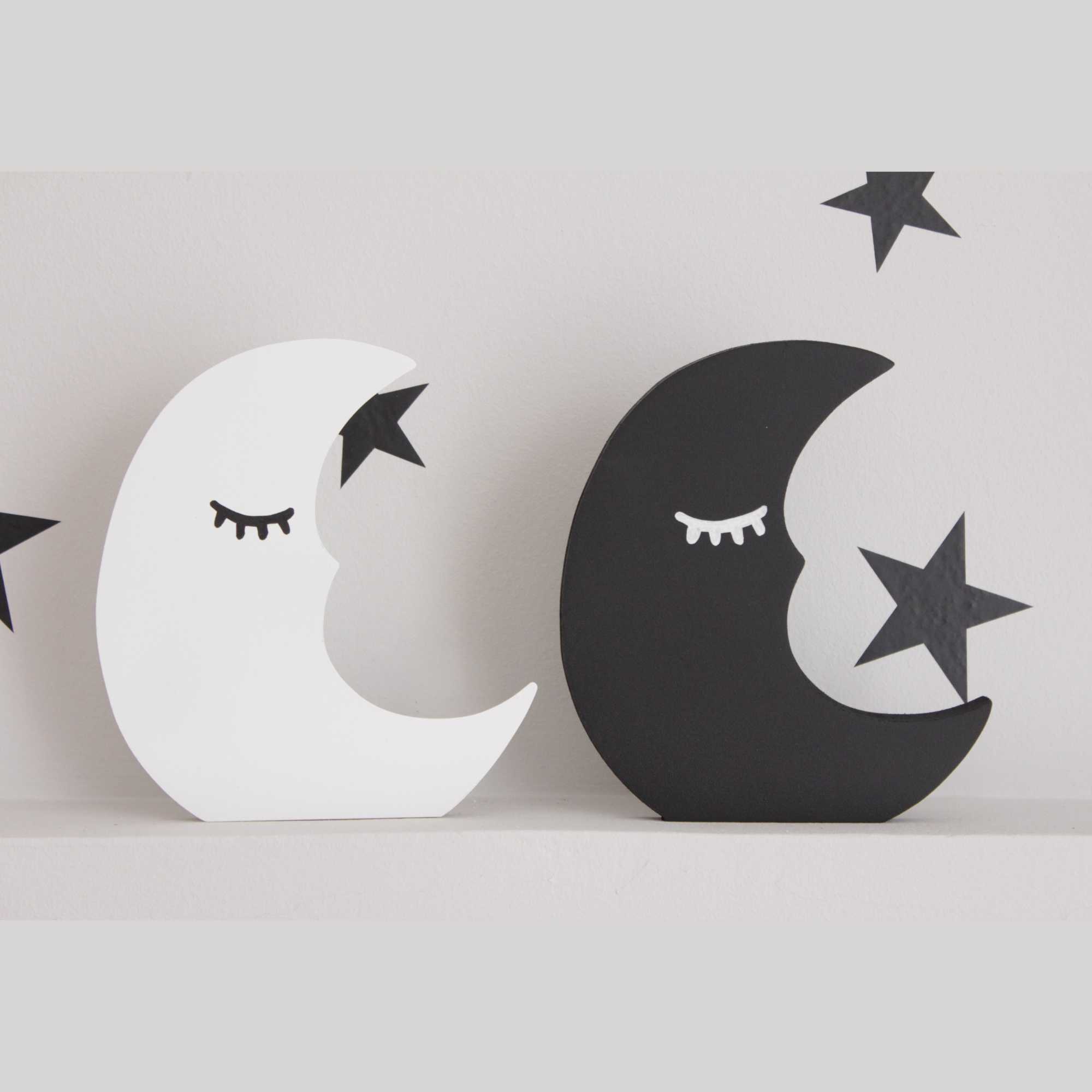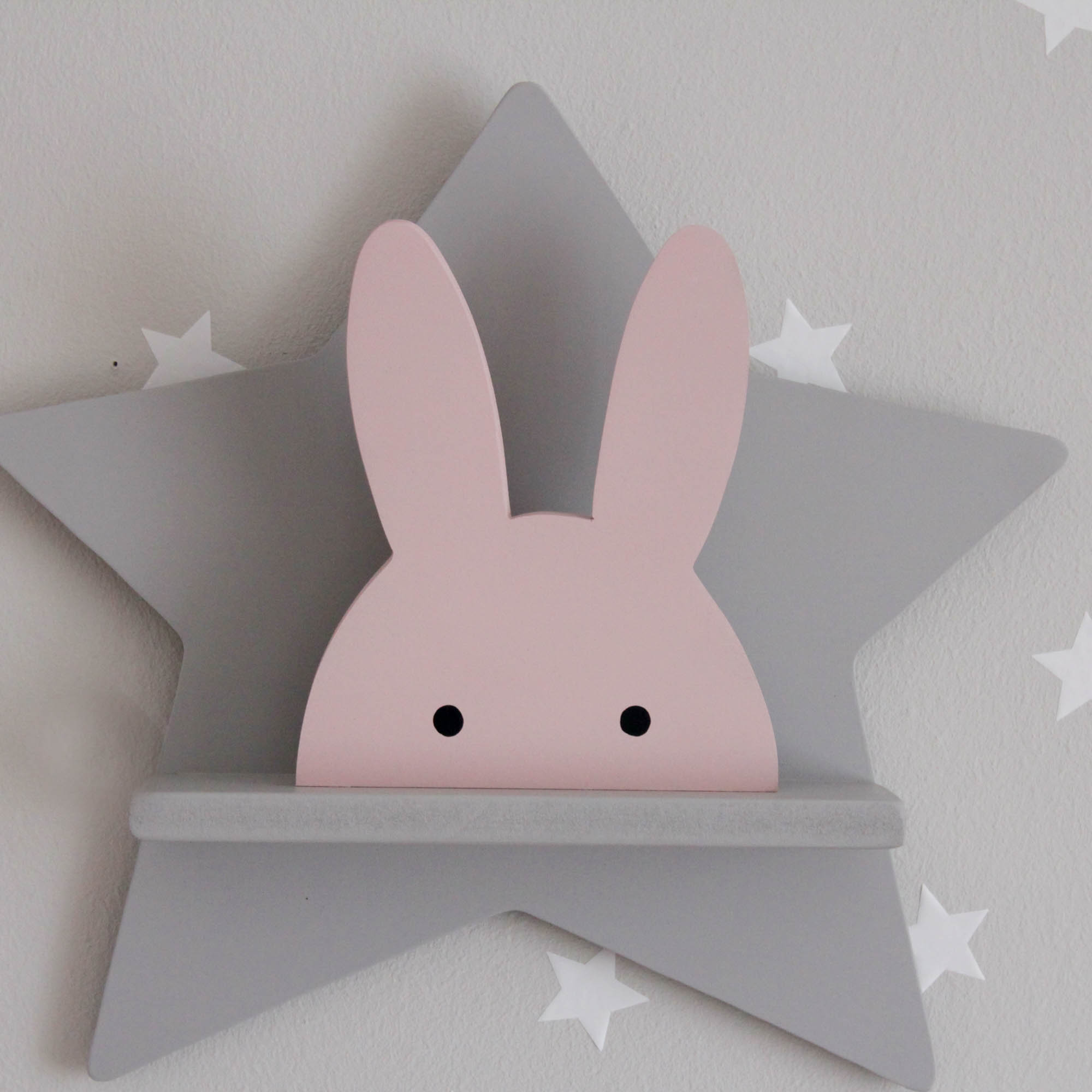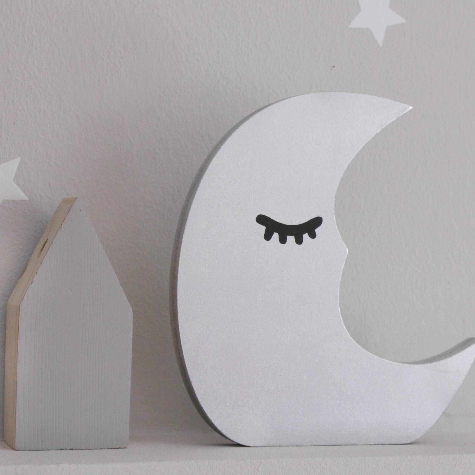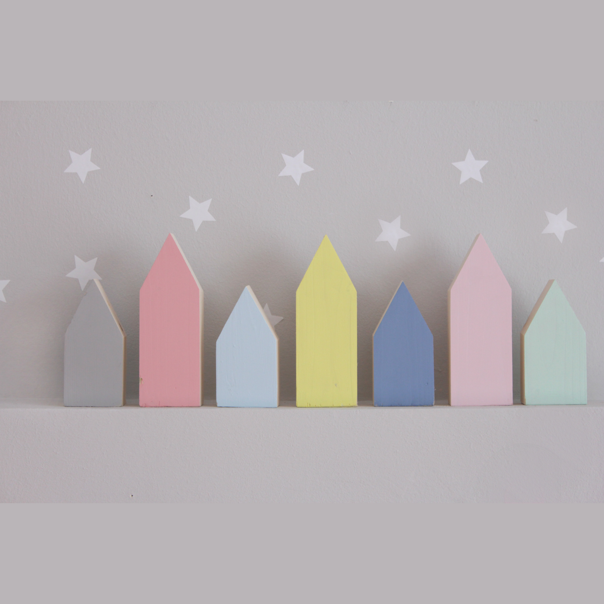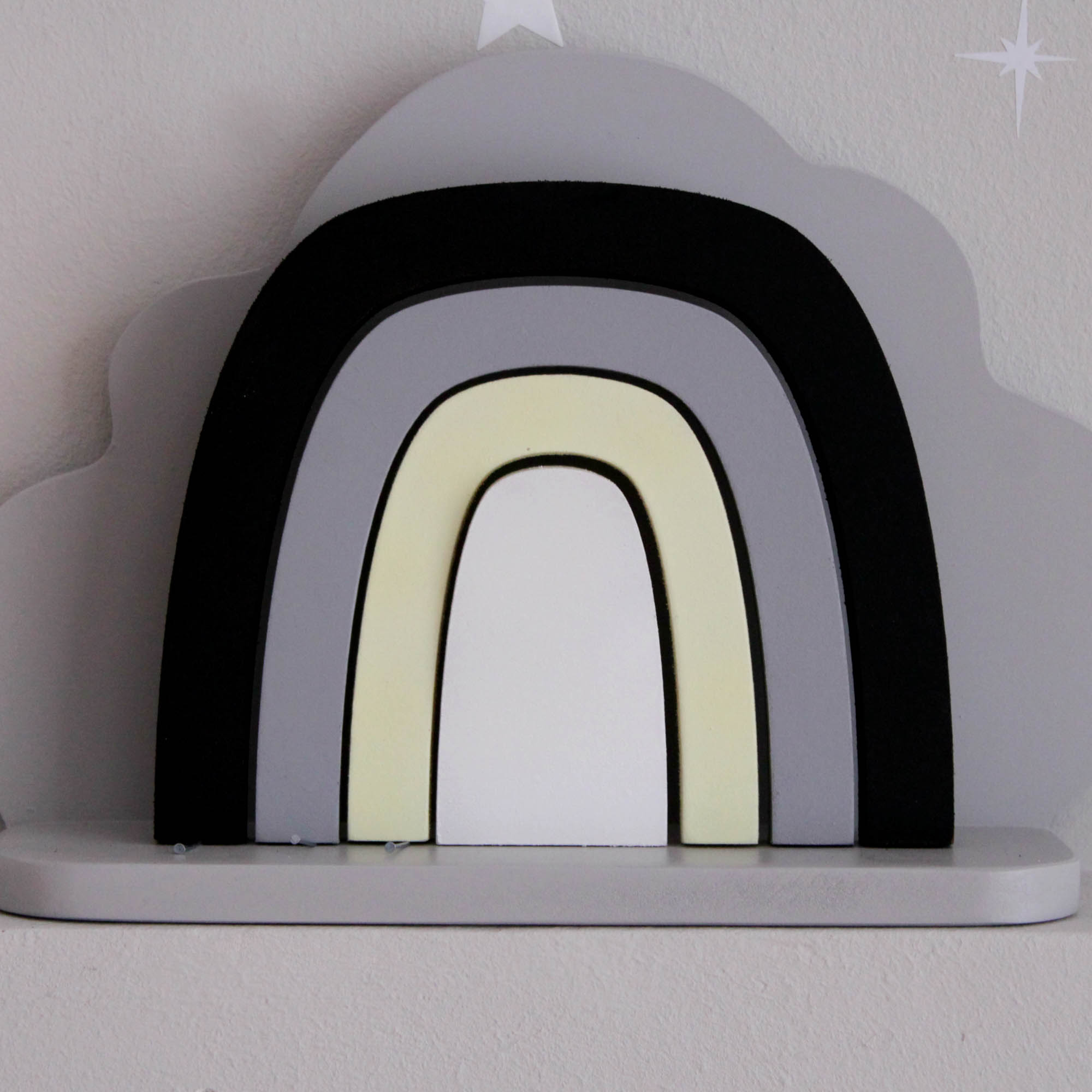 Για να πλαισιώσουμε όμορφα τα ραφάκια μας κατασκευάσαμε εξίσου ιδιαίτερα, ξύλινα διακοσμητικά που στηρίζονται μόνα τους και μπορούν να τοποθετηθούν σε οποιοδήποτε σημείο στο παιδικό δωμάτιο. Τα σχέδια που υπάρχουν είναι σχέδιο σπιτάκι σε δύο διαστάσεις, σχέδιο σύννεφο σε δύο διαστάσεις, σχέδιο φεγγάρι με ματάκι, λαγός ουράνιο τόξο και σχέδιο αστέρι σε τρεις διαστάσεις, Είναι από mdf και βαμμένα με οικολογικά χρώματα. . Δημιουργείστε τον δικό σας μοναδικό συνδυασμό!