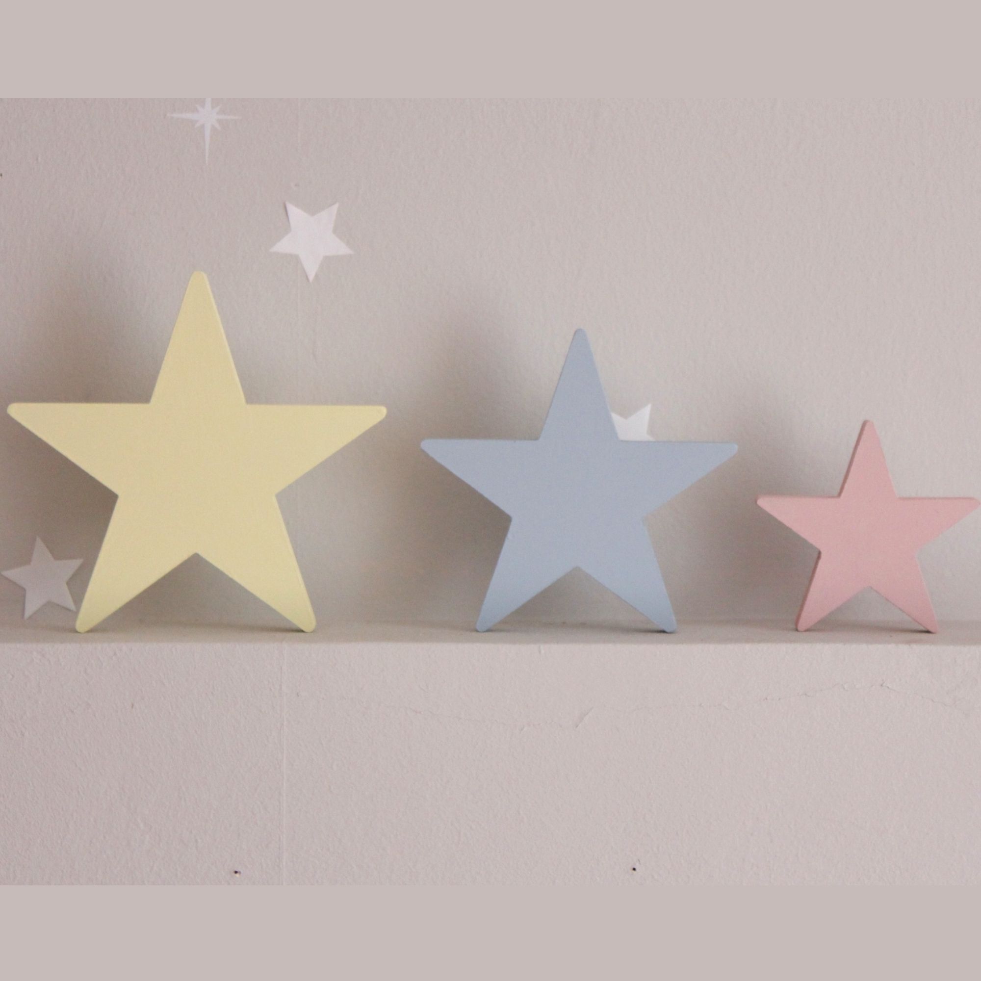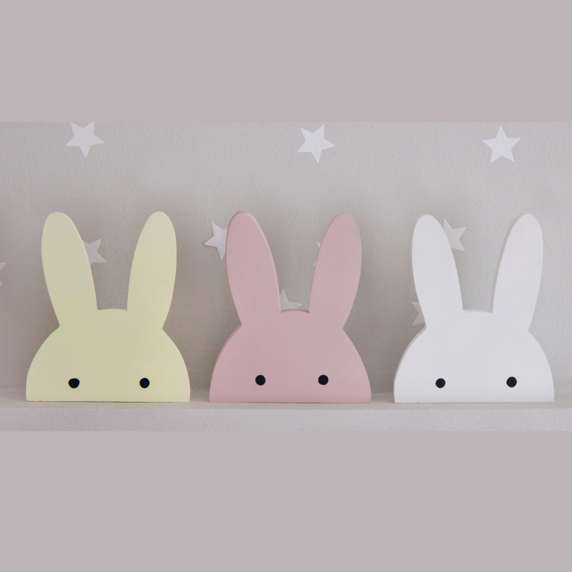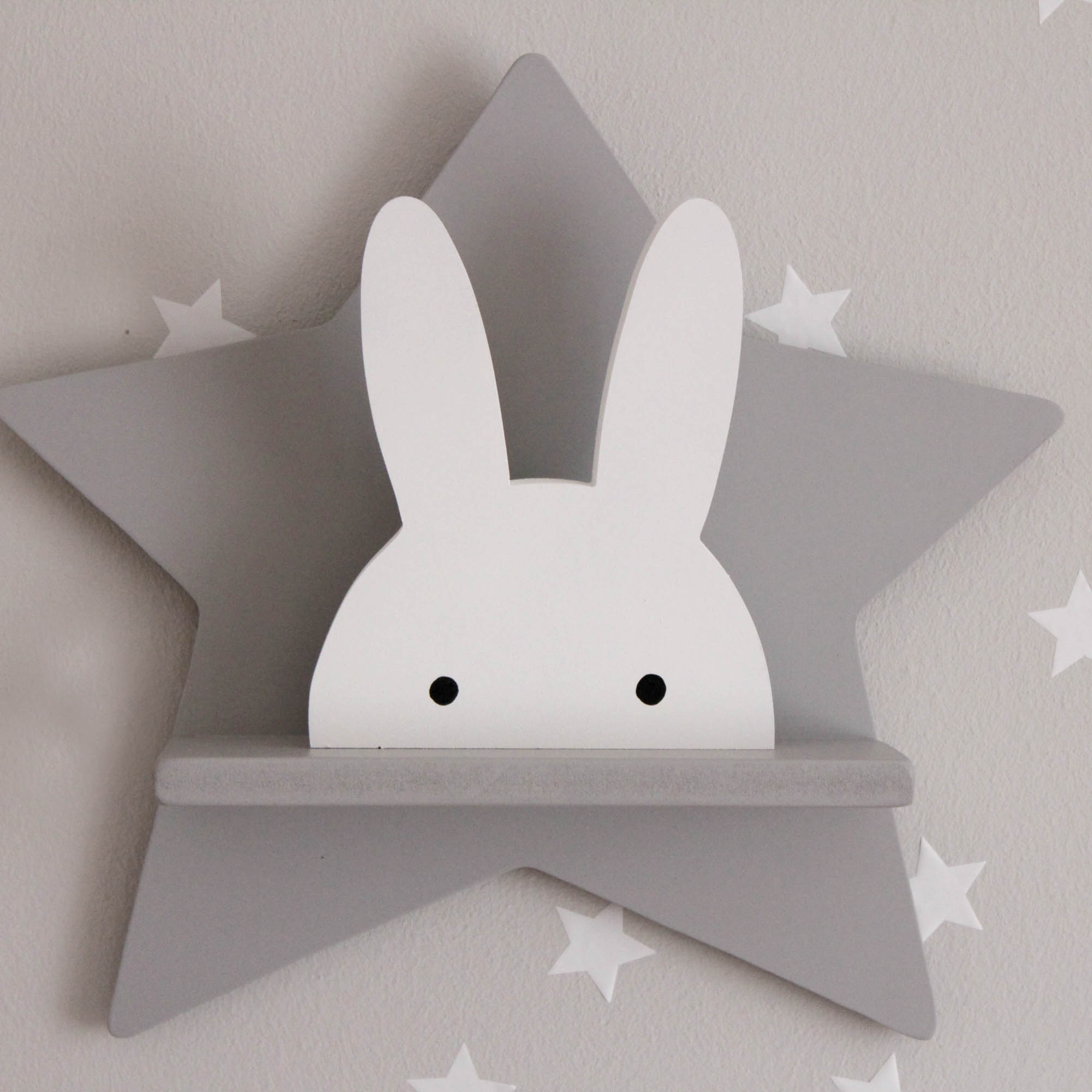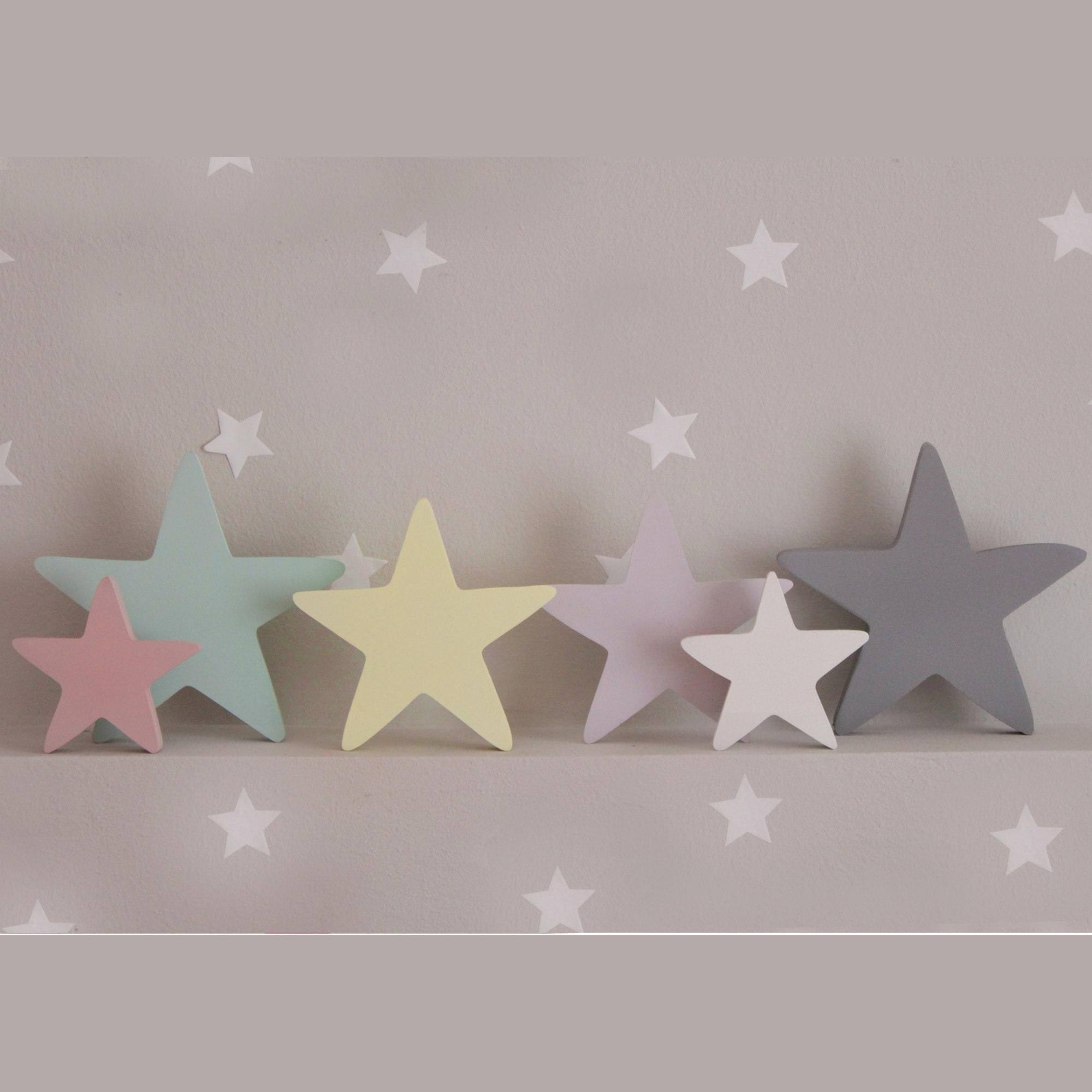 Για να πλαισιώσουμε όμορφα τα ραφάκια μας κατασκευάσαμε εξίσου ιδιαίτερα, ξύλινα διακοσμητικά που στηρίζονται μόνα τους και μπορούν να τοποθετηθούν σε οποιοδήποτε σημείο στο παιδικό δωμάτιο. Τα σχέδια που υπάρχουν είναι σχέδιο σπιτάκι σε δύο διαστάσεις, σχέδιο σύννεφο σε δύο διαστάσεις, σχέδιο φεγγάρι με ματάκι, λαγός ουράνιο τόξο και σχέδιο αστέρι σε τρεις διαστάσεις, Είναι από mdf και βαμμένα με οικολογικά χρώματα. . Δημιουργείστε τον δικό σας μοναδικό συνδυασμό!