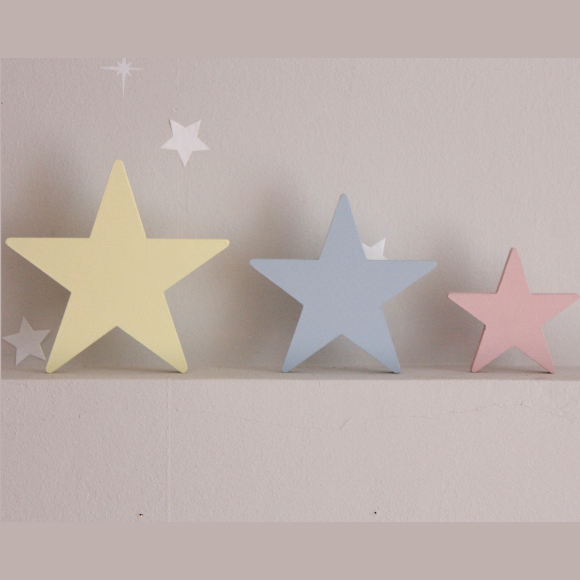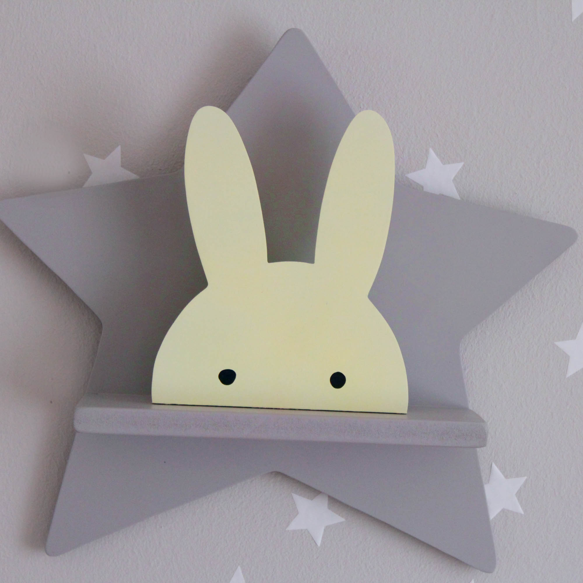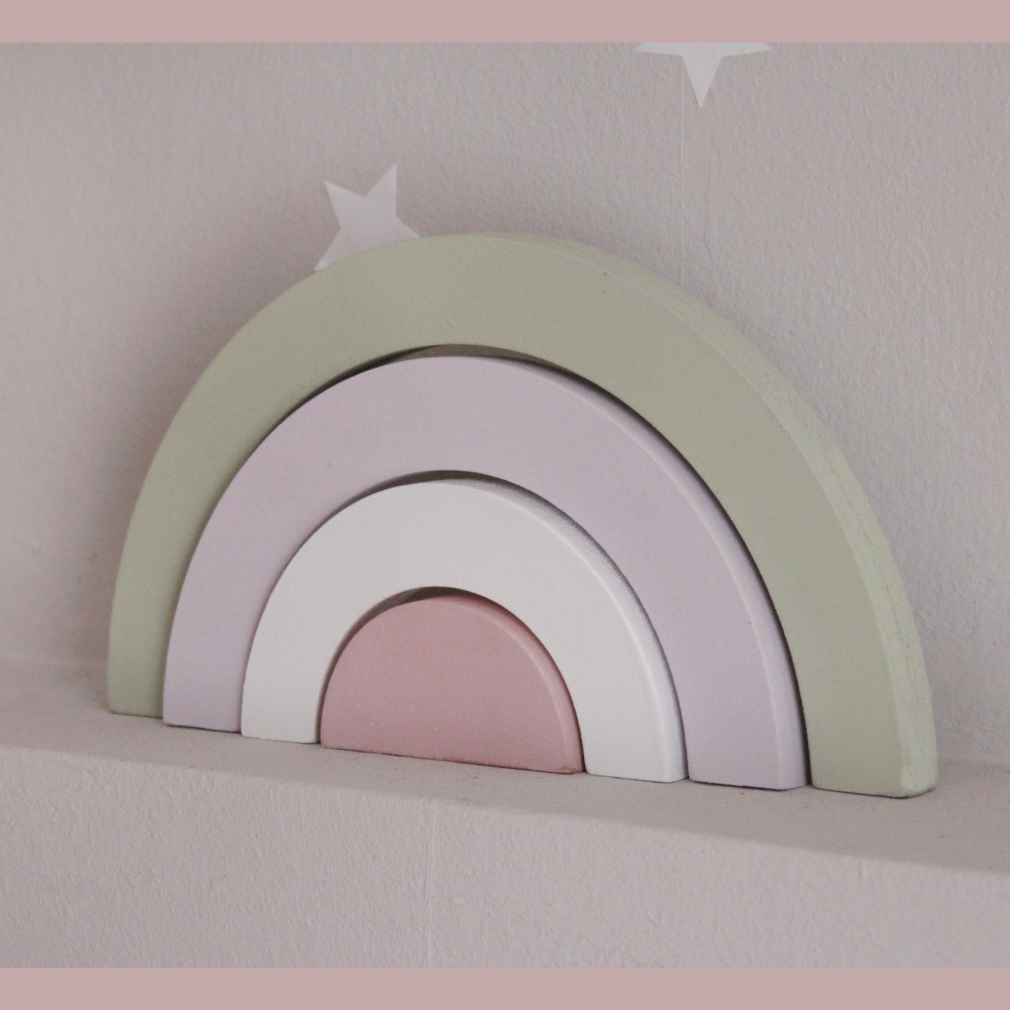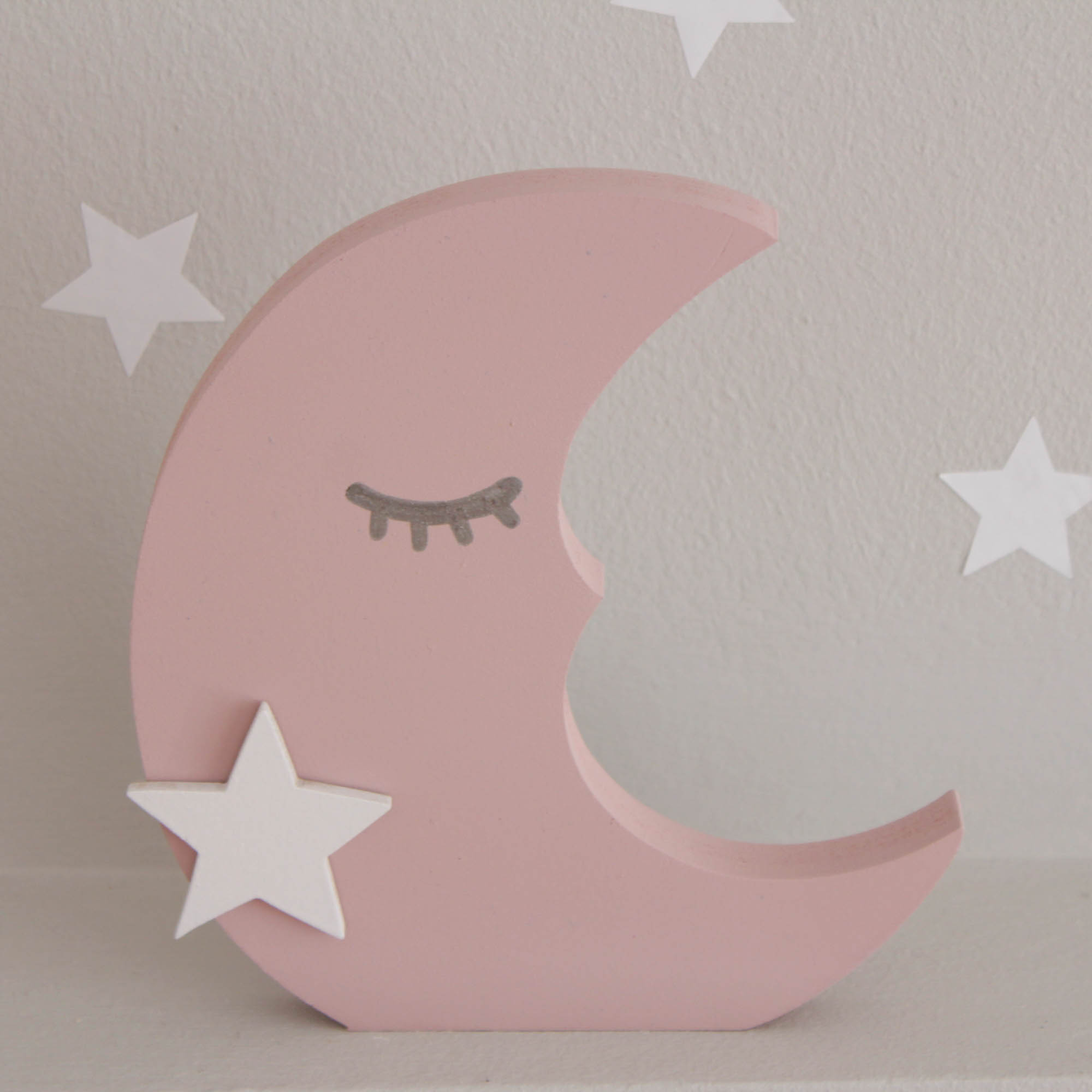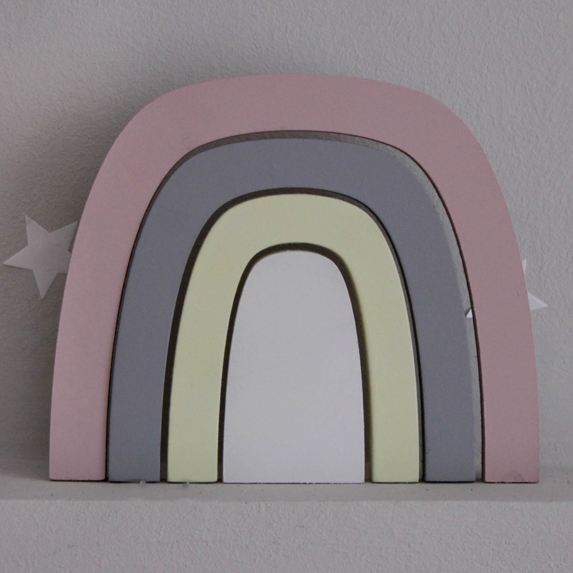 Για να πλαισιώσουμε όμορφα τα ραφάκια μας κατασκευάσαμε εξίσου ιδιαίτερα, ξύλινα διακοσμητικά που στηρίζονται μόνα τους και μπορούν να τοποθετηθούν σε οποιοδήποτε σημείο στο παιδικό δωμάτιο. Τα σχέδια που υπάρχουν είναι σχέδιο σπιτάκι σε δύο διαστάσεις, σχέδιο σύννεφο σε δύο διαστάσεις, σχέδιο φεγγάρι με ματάκι, λαγός ουράνιο τόξο και σχέδιο αστέρι σε τρεις διαστάσεις, Είναι από mdf και βαμμένα με οικολογικά χρώματα. . Δημιουργείστε τον δικό σας μοναδικό συνδυασμό!