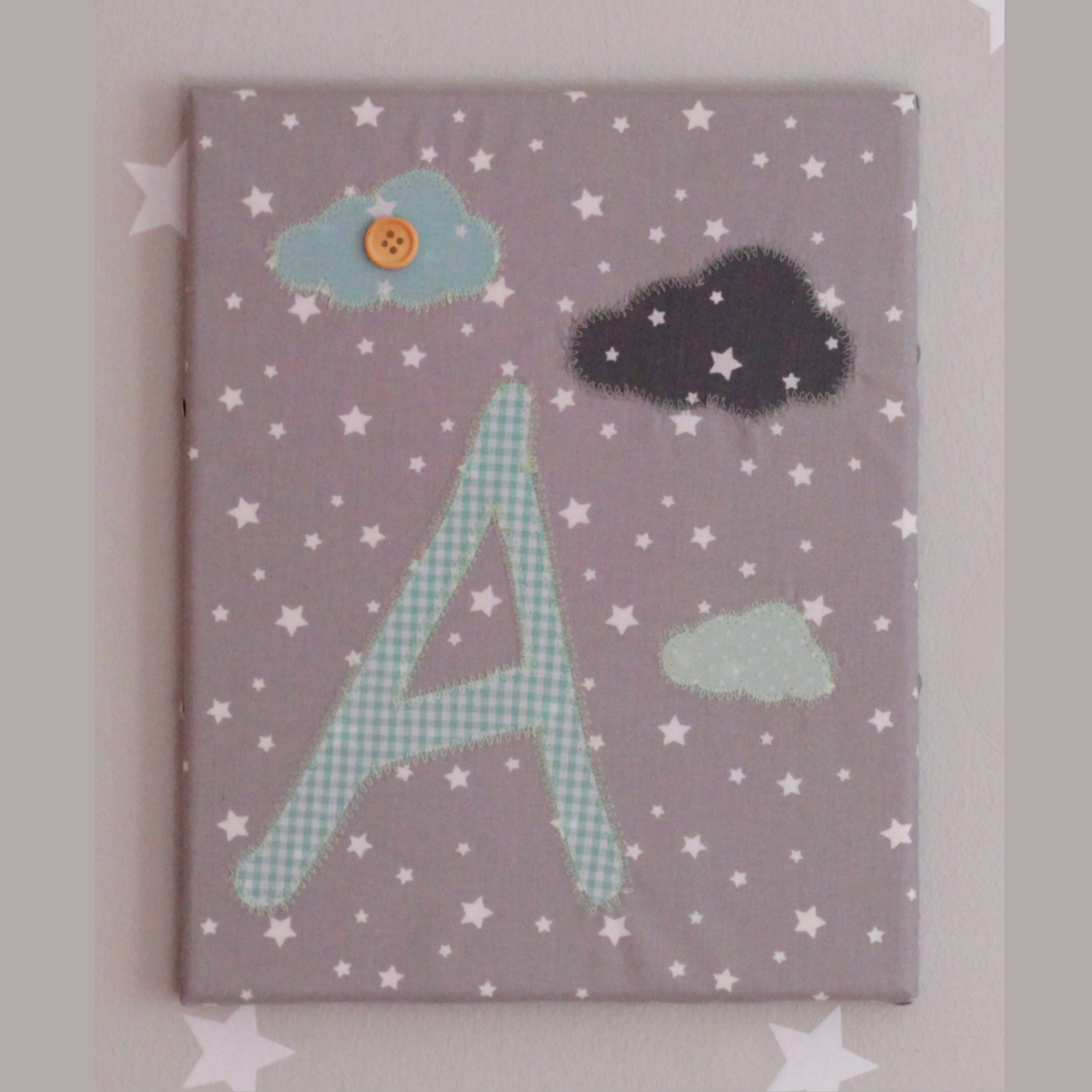 Καμβάς σε βαμβακερό ύφασμα με απλικέ μονόγραμμα της επιλογής σας σε αποχρώσεις του γκρι και της μέντας. Ένα υπέροχο διακοσμητικό τοίχου που θα πλαισιώσει μοναδικά το παιδικό δωμάτιο! Σε περίπτωση που θέλετε αλλαγή στα υφάσματα/χρώματα ή και μέγεθος μπορείτε να επικοινωνήσετε μαζί μας να φτιάξουμε τον δικό σας μοναδικό συνδυασμό!