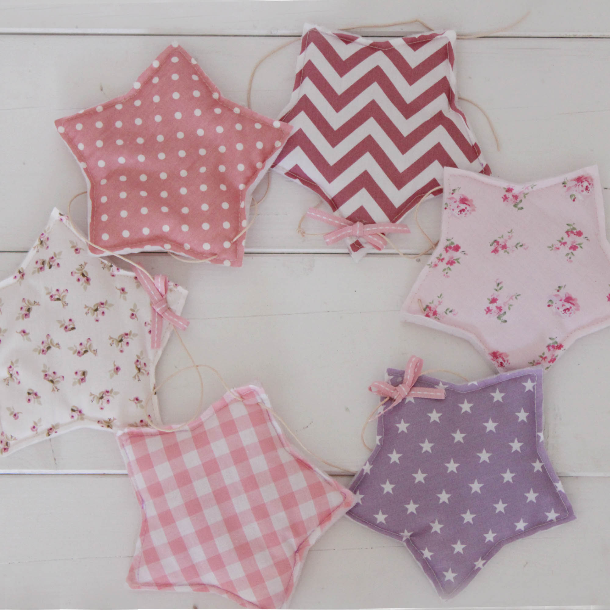 Χαρούμενα και γλυκά μπανεράκια που κάθε δωμάτιο πρέπει να έχει! Γιρλάντα σε σχέδιο puffy αστέρι που αποτελείται από 6 στοιχεία/αστέρια σε αποχρώσεις του μωβ και του ροζ . Μπορούν να τοποθετηθούν στην κούνια, στον τοίχο ή σε οποιοδήποτε άλλο σημείο του δωματίου και να το κάνουν μοναδικό! Είναι από βαμβακερά υφάσματατα και υποαλλεργική γέμιση.
