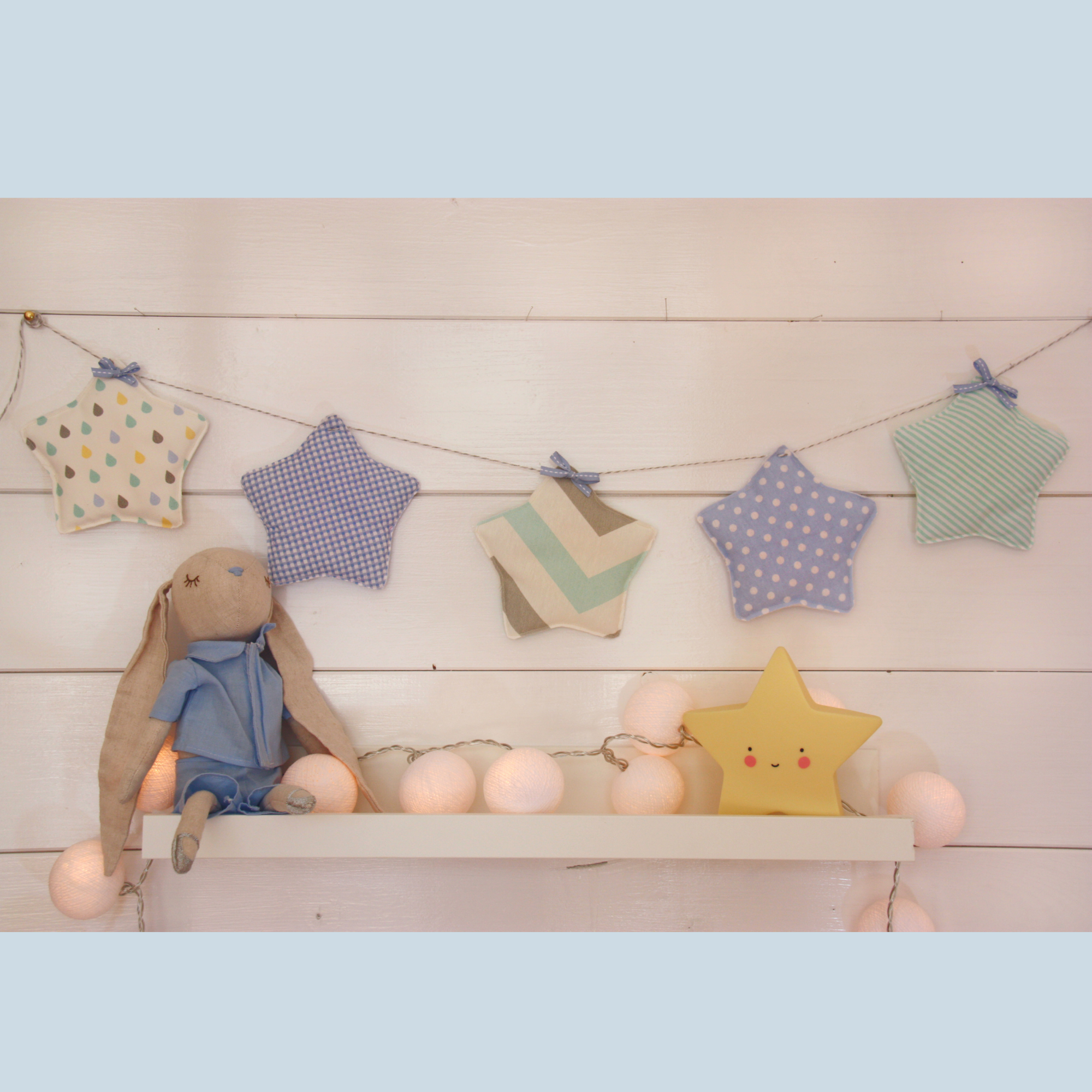 Χαρούμενα και γλυκά μπανεράκια που κάθε δωμάτιο πρέπει να έχει! Γιρλάντα σε σχέδιο puffy αστέρι που αποτελείται από 5 στοιχεία/αστέρια σε αποχρώσεις του θαλασσί,της μέντας και του γκρι . Μπορούν να τοποθετηθούν στην κούνια, στον τοίχο ή σε οποιοδήποτε άλλο σημείο του δωματίου και να το κάνουν μοναδικό!  Είναι από βαμβακερά υφάσματατα και υποαλλεργική γέμιση.