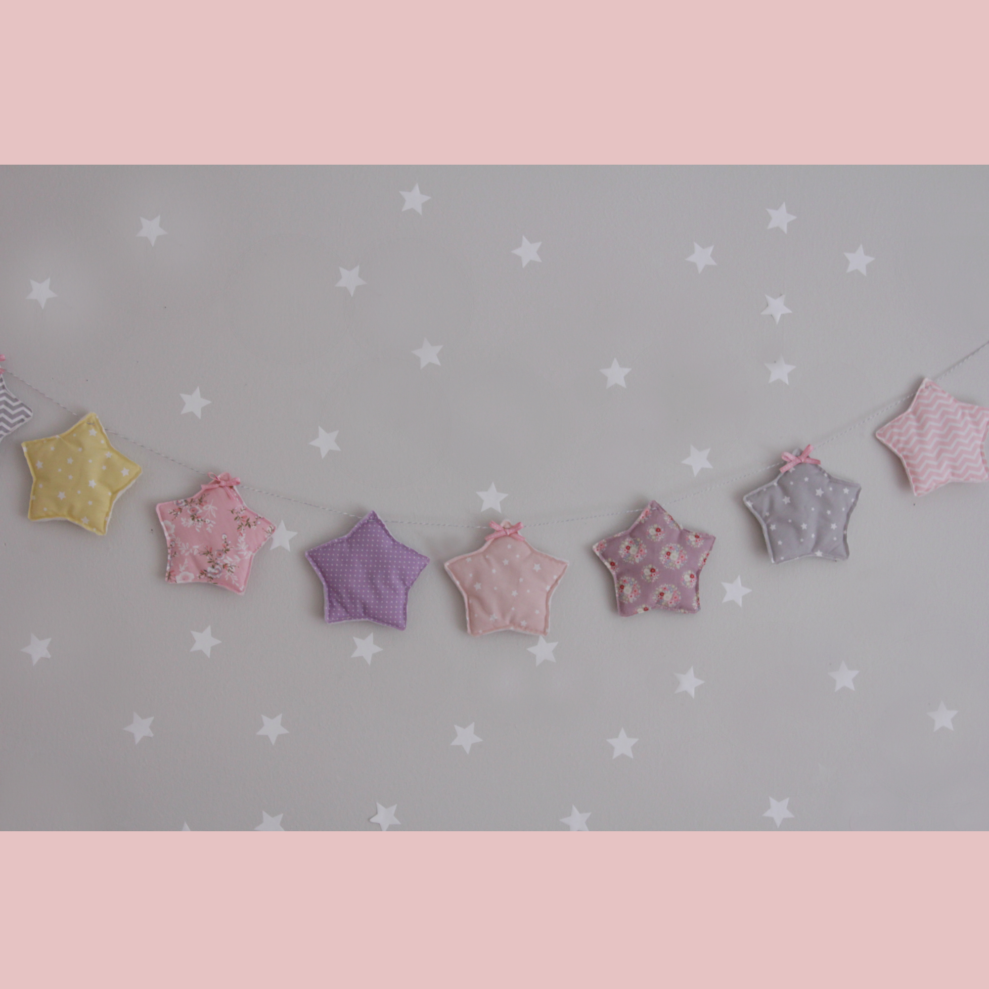 Χαρούμενα και γλυκά μπανεράκια που κάθε δωμάτιο πρέπει να έχει! Γιρλάντα σε σχέδιο puffy αστέρι που αποτελείται από 7 στοιχεία/αστέρια σε αποχρώσεις του μωβ,κίτρινου γκρι και του ροζ . Μπορούν να τοποθετηθούν στην κούνια, στον τοίχο ή σε οποιοδήποτε άλλο σημείο του δωματίου και να το κάνουν μοναδικό! Είναι από βαμβακερά υφάσματατα και υποαλλεργική γέμιση.