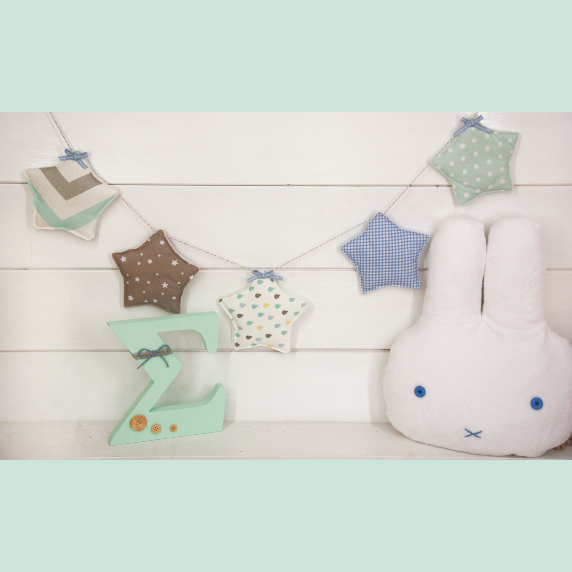 Χαρούμενα και γλυκά μπανεράκια που κάθε δωμάτιο πρέπει να έχει! Γιρλάντα σε σχέδιο puffy αστέρι που αποτελείται από 5 στοιχεία/αστέρια σε αποχρώσεις του θαλασσί,γκρι και της μέντας . Μπορούν να τοποθετηθούν στην κούνια, στον τοίχο ή σε οποιοδήποτε άλλο σημείο του δωματίου και να το κάνουν μοναδικό! Είναι από βαμβακερά υφάσματατα και υποαλλεργική γέμιση.