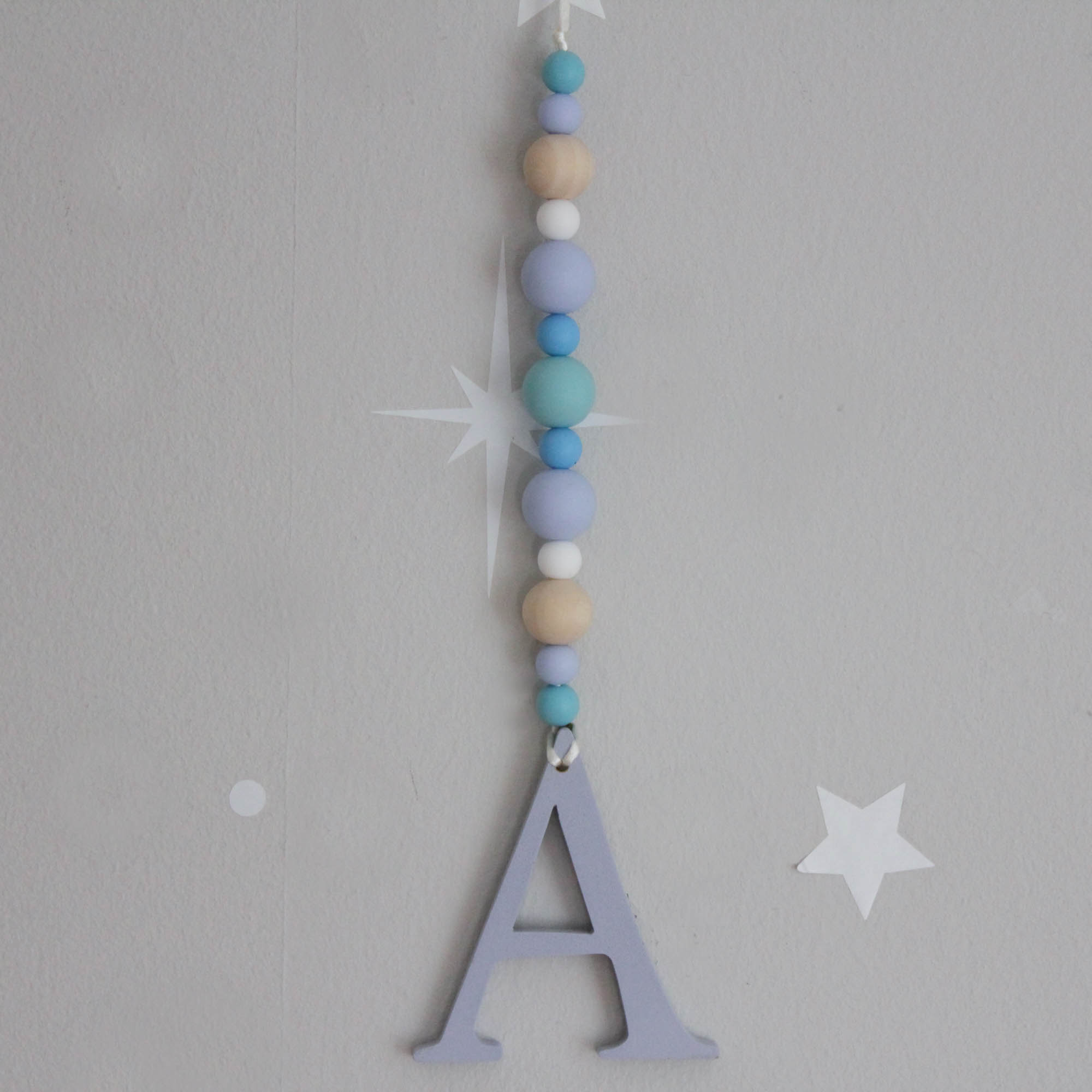 Κρεμαστό διακοσμητικό σε αποχρώσεις του θαλασσί με τελείωμα ξύλινο μονόγραμμα. Οι χάντρες είναι από ξύλο οξιάς ή και από σιλικόνη και τα χρώματα που χρησιμοποιούμε οικολογικά.