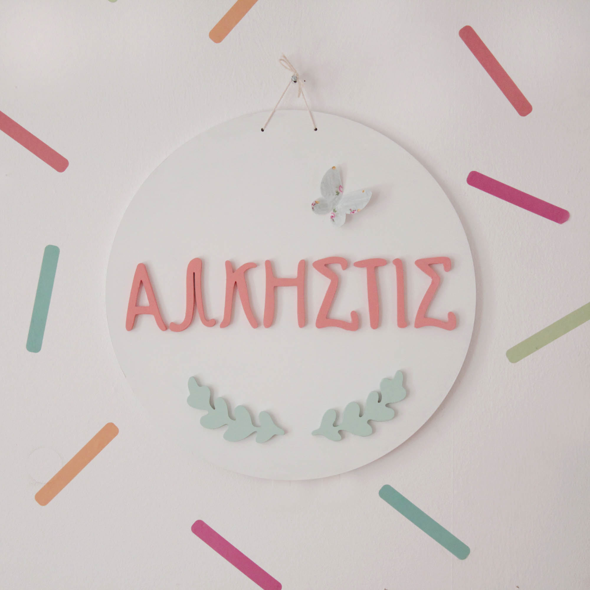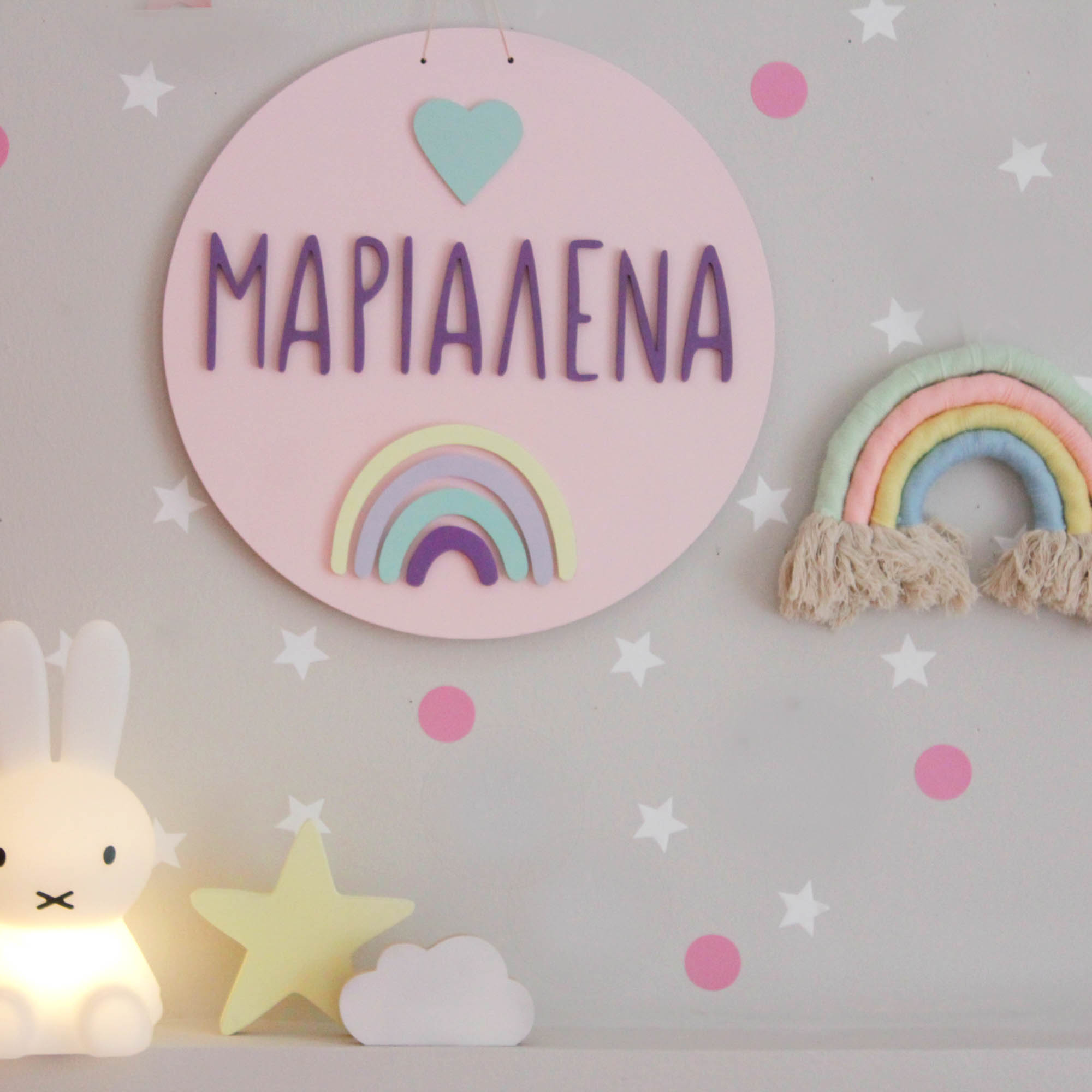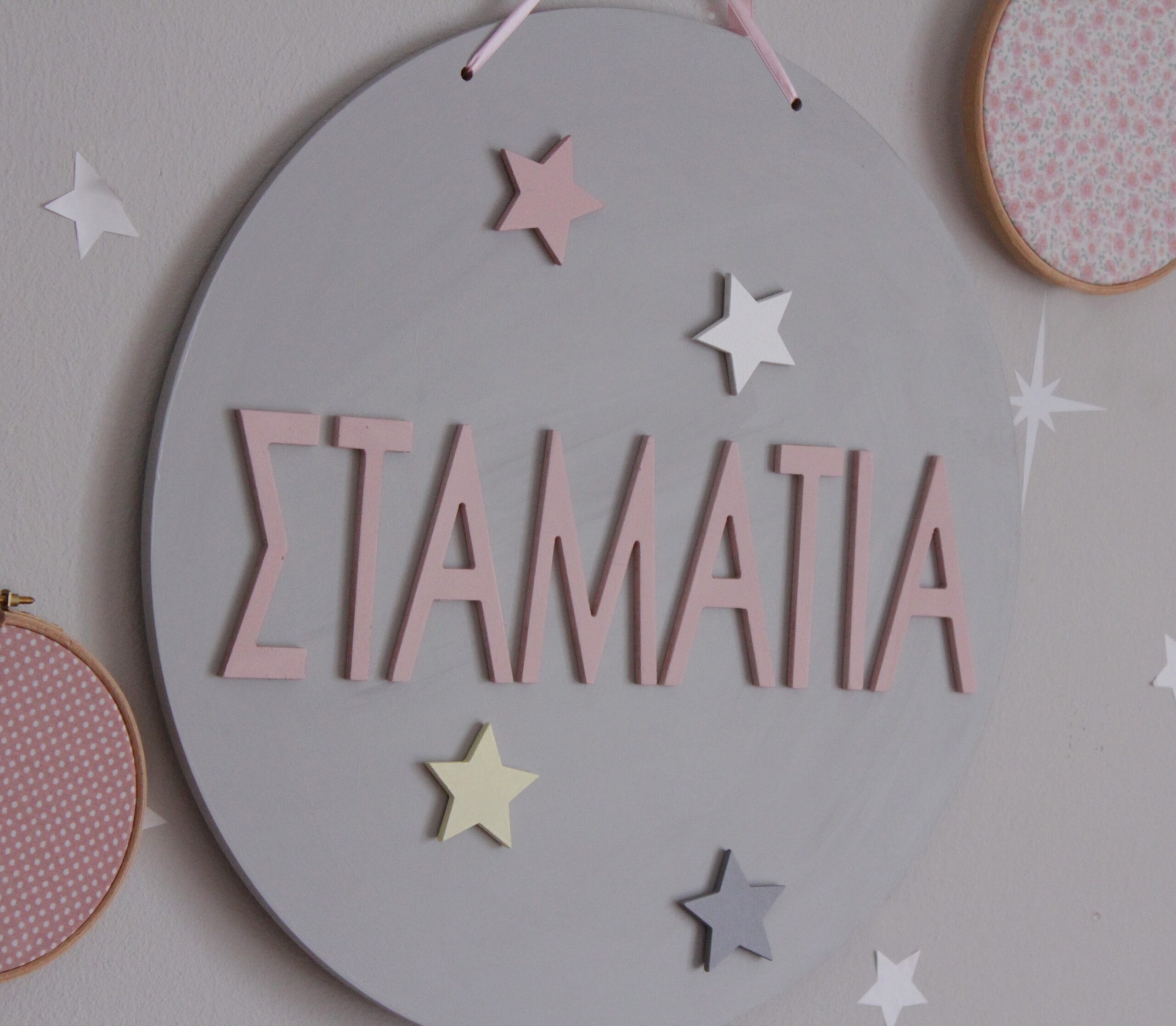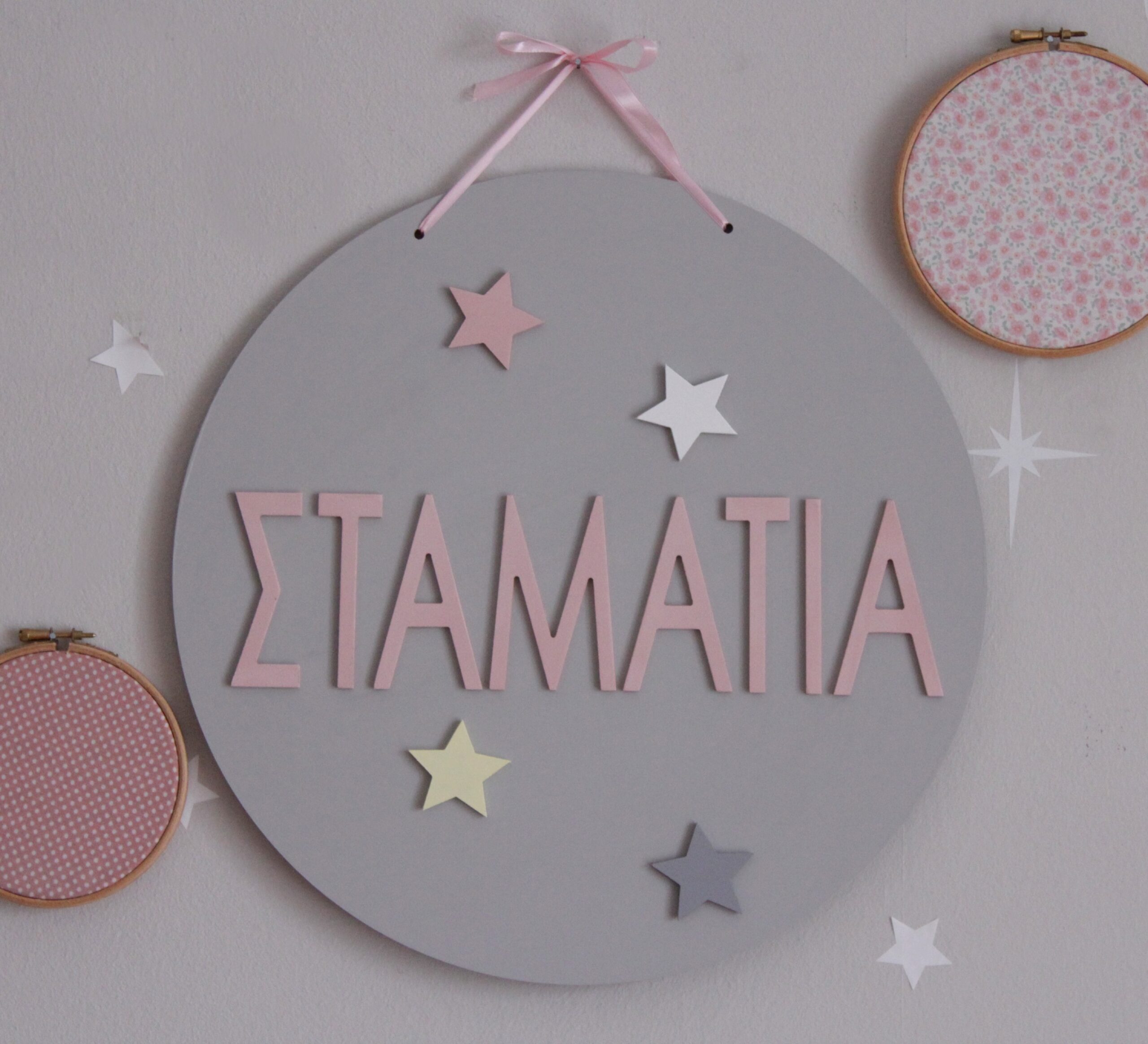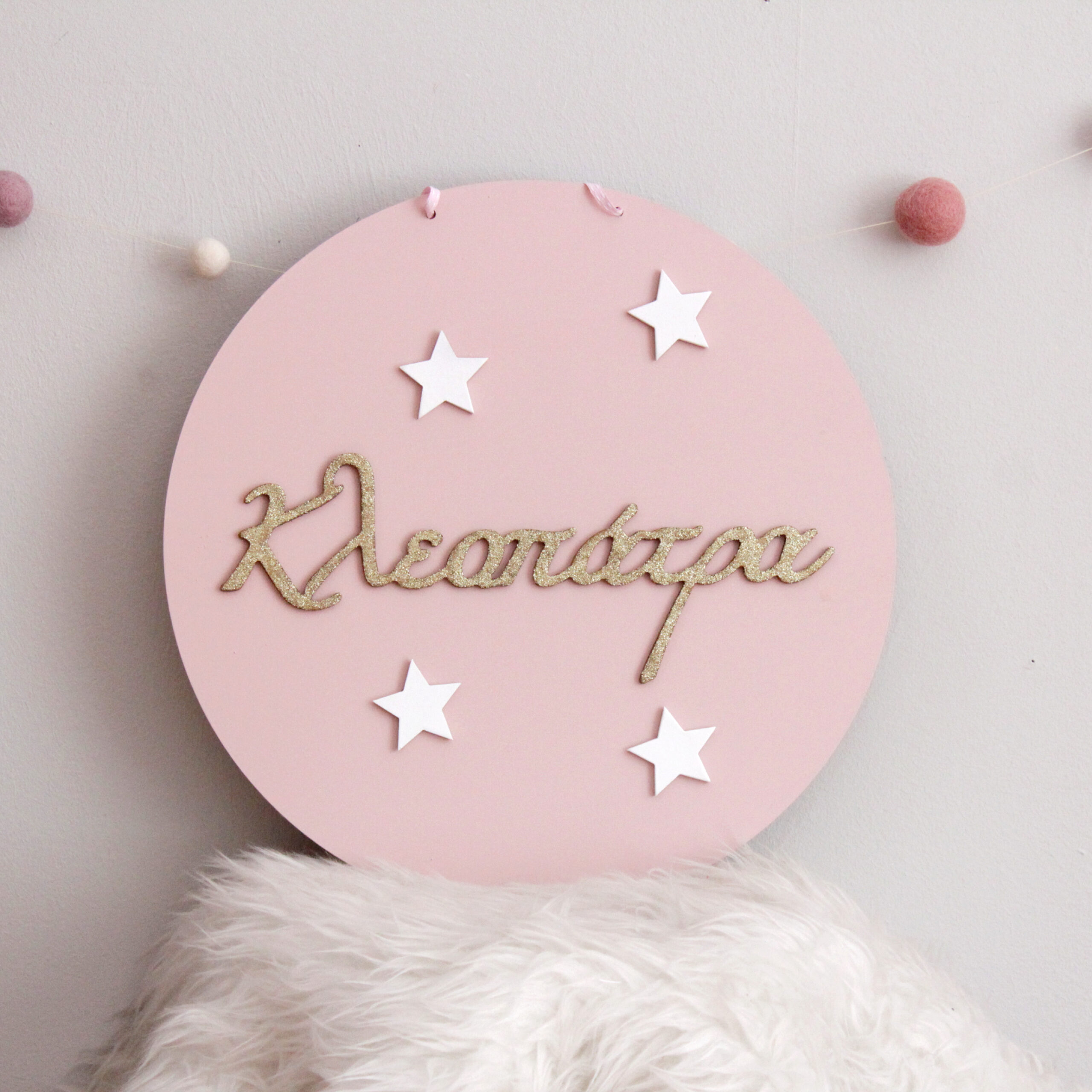 Γλυκό στρογγυλό ξύλινο διακοσμητικό τοίχου από MDF με το όνομα του παιδιού και διακοσμητικά της επιλογής σας. Μία ιδιαίτερη προσθήκη στο παιδικό δωμάτιο που θα κάνει τον χώρο μοναδικό!