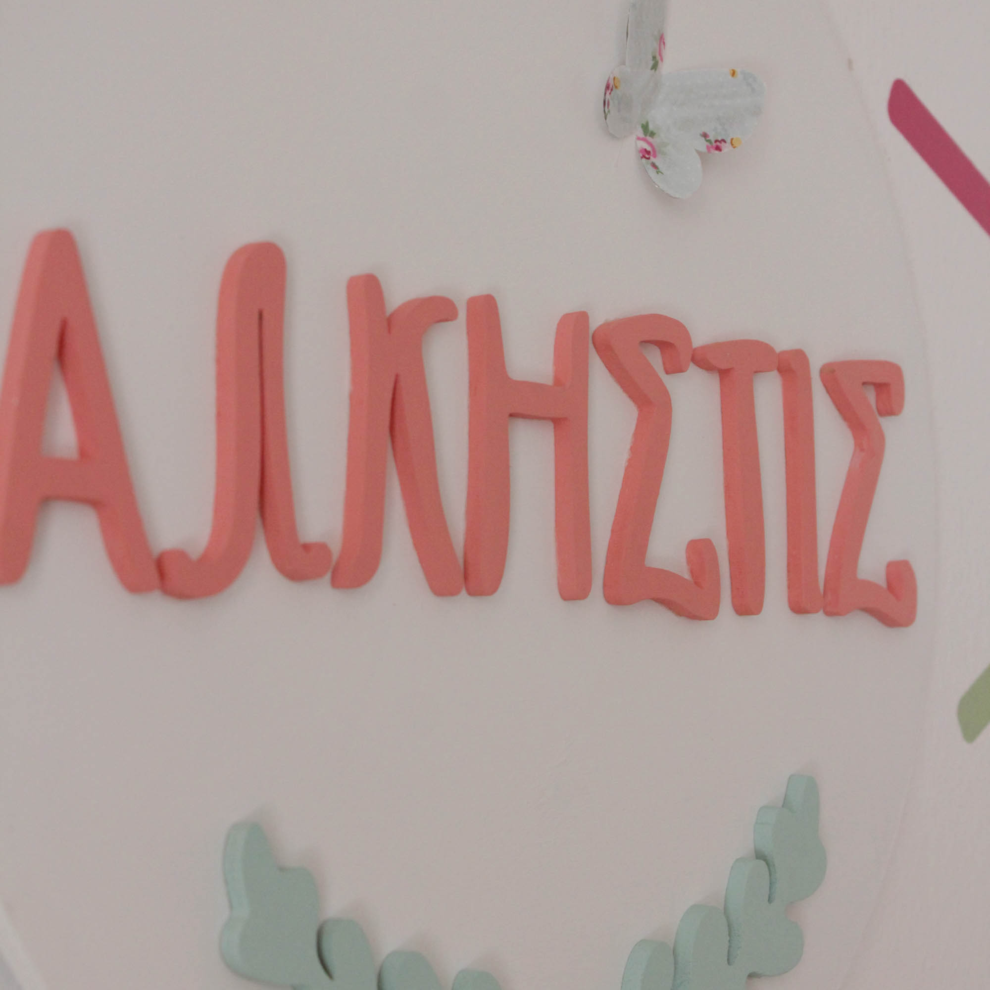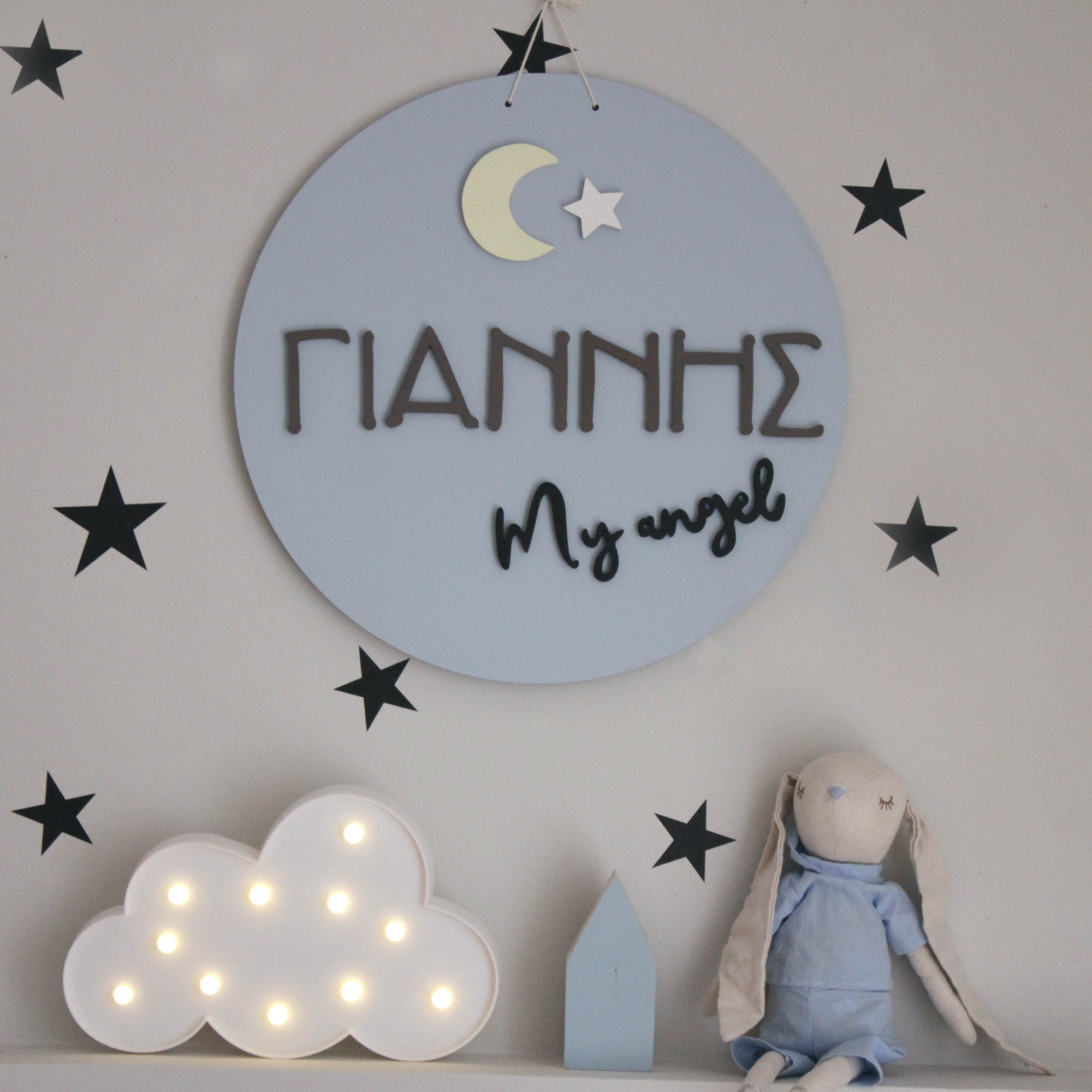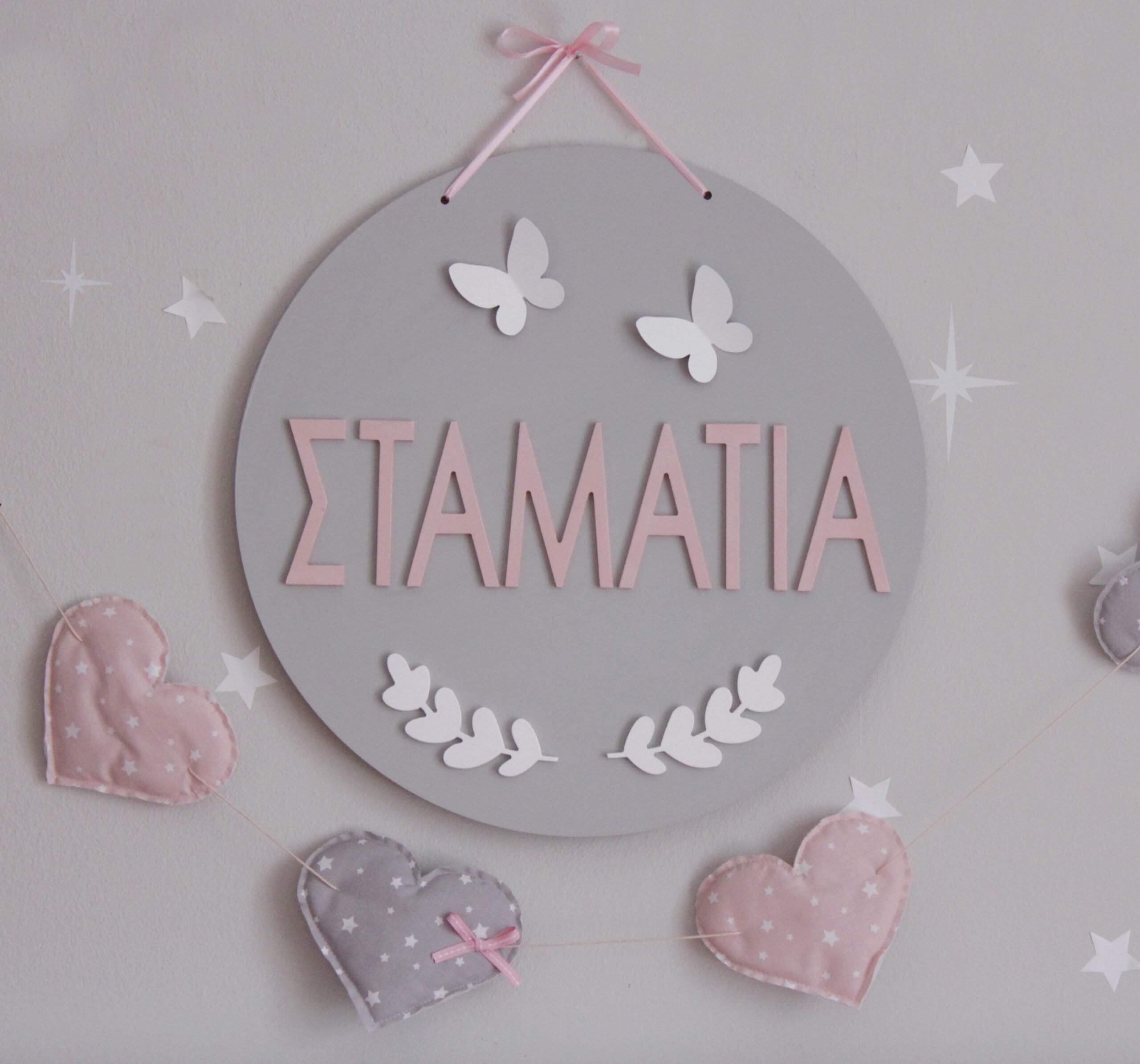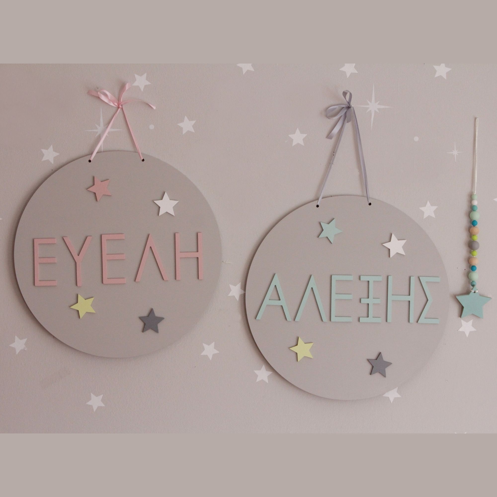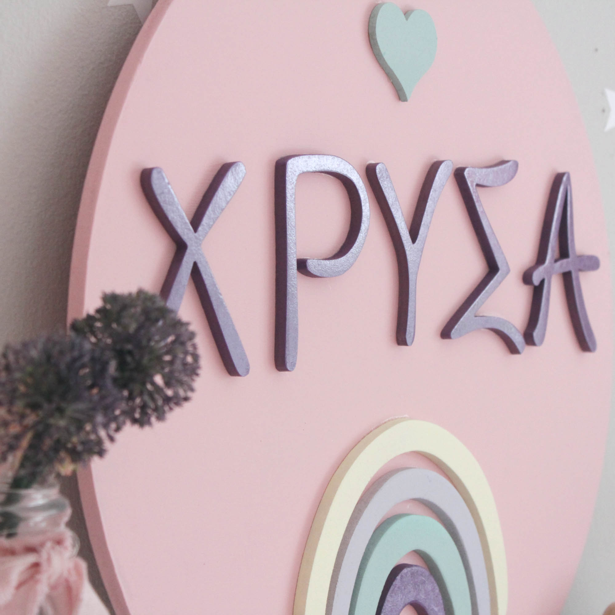 Γλυκό στρογγυλό ξύλινο διακοσμητικό τοίχου από MDF με το όνομα του παιδιού και διακοσμητικά της επιλογής σας. Μία ιδιαίτερη προσθήκη στο παιδικό δωμάτιο που θα κάνει τον χώρο μοναδικό!