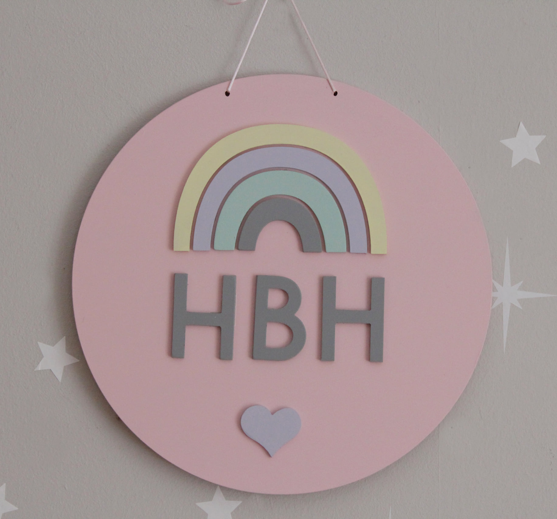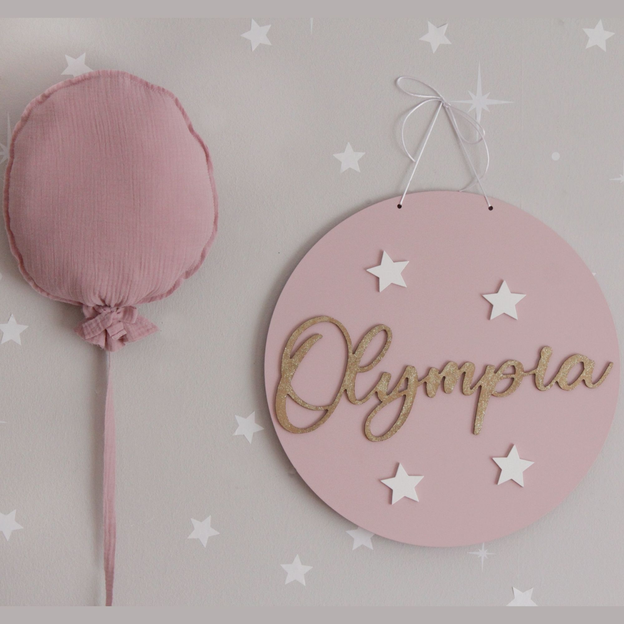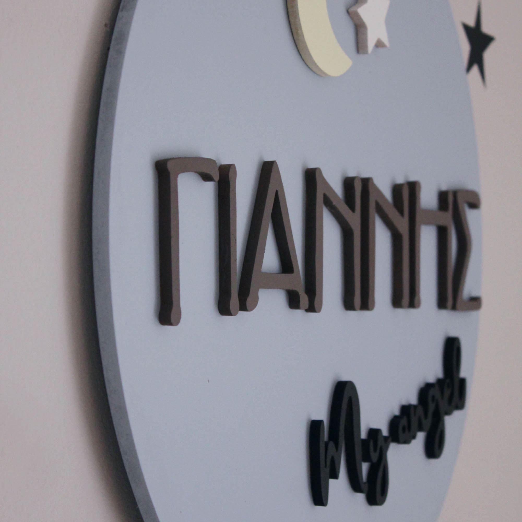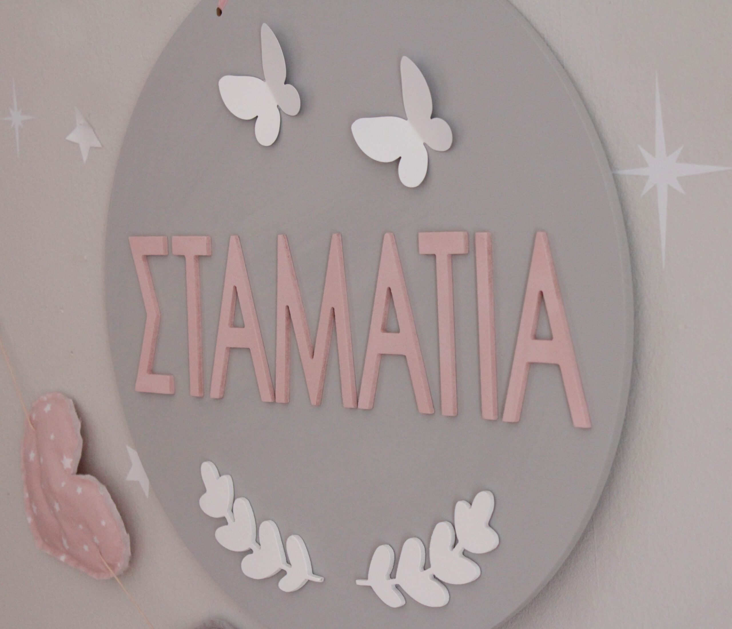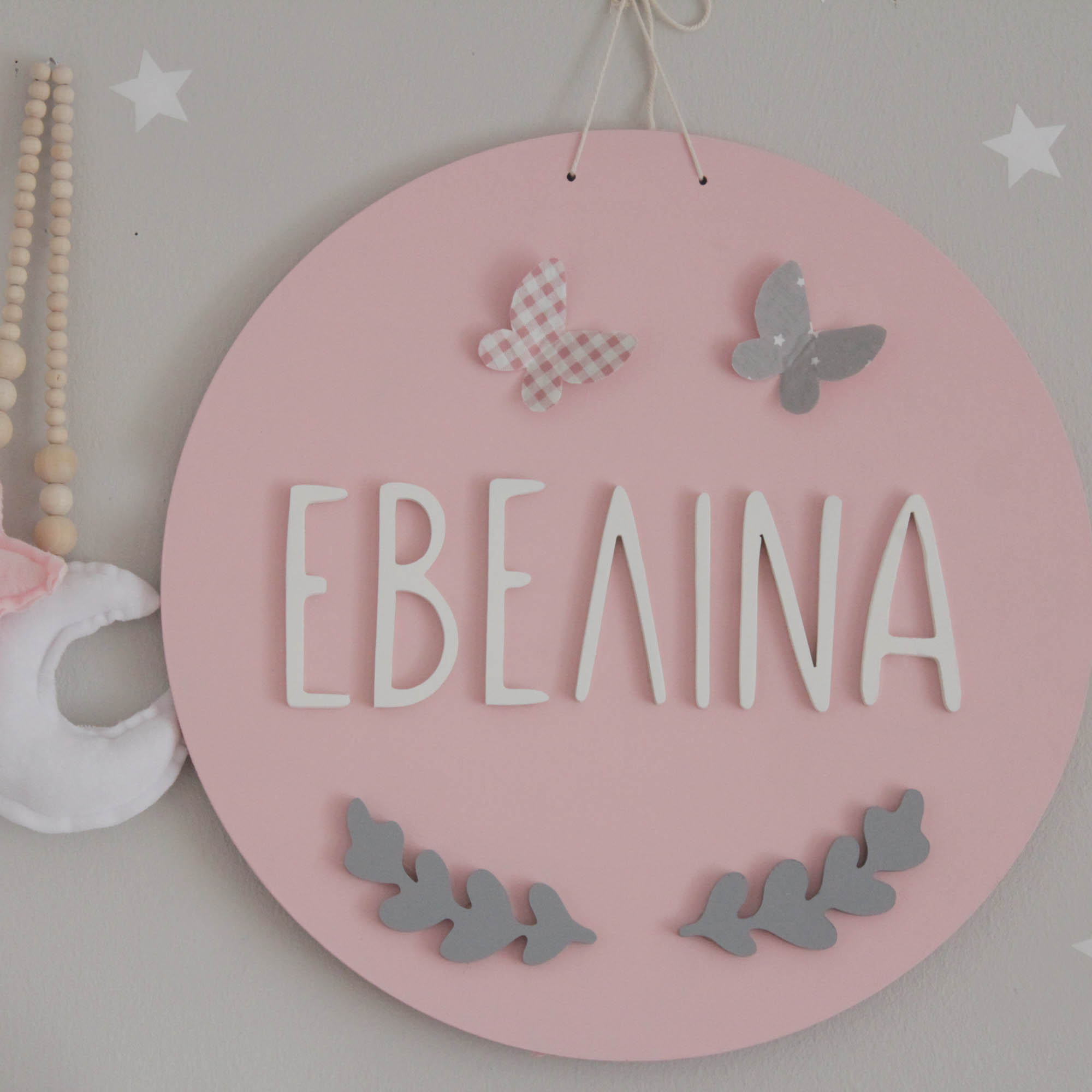 Γλυκό στρογγυλό ξύλινο διακοσμητικό τοίχου από MDF με το όνομα του παιδιού και διακοσμητικά της επιλογής σας. Μία ιδιαίτερη προσθήκη στο παιδικό δωμάτιο που θα κάνει τον χώρο μοναδικό!
