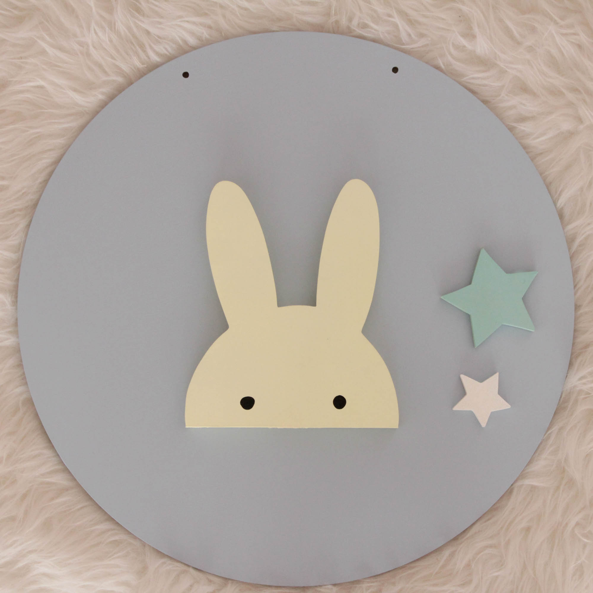 Γλυκό στρογγυλό ξύλινο διακοσμητικό τοίχου από MDF. Σε χρώμα θαλασσί με σχέδιο ξύλινο λαγό σε χρώμα κίτρινο απαλό και δύο αστεράκια μέντα και λευκό.