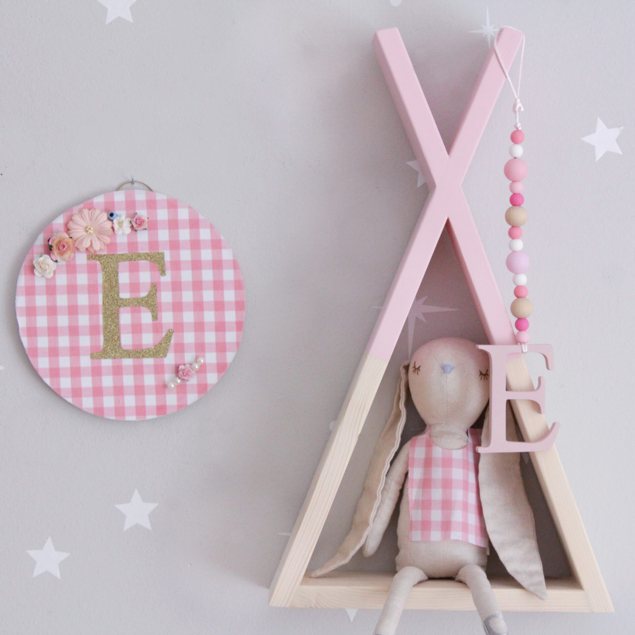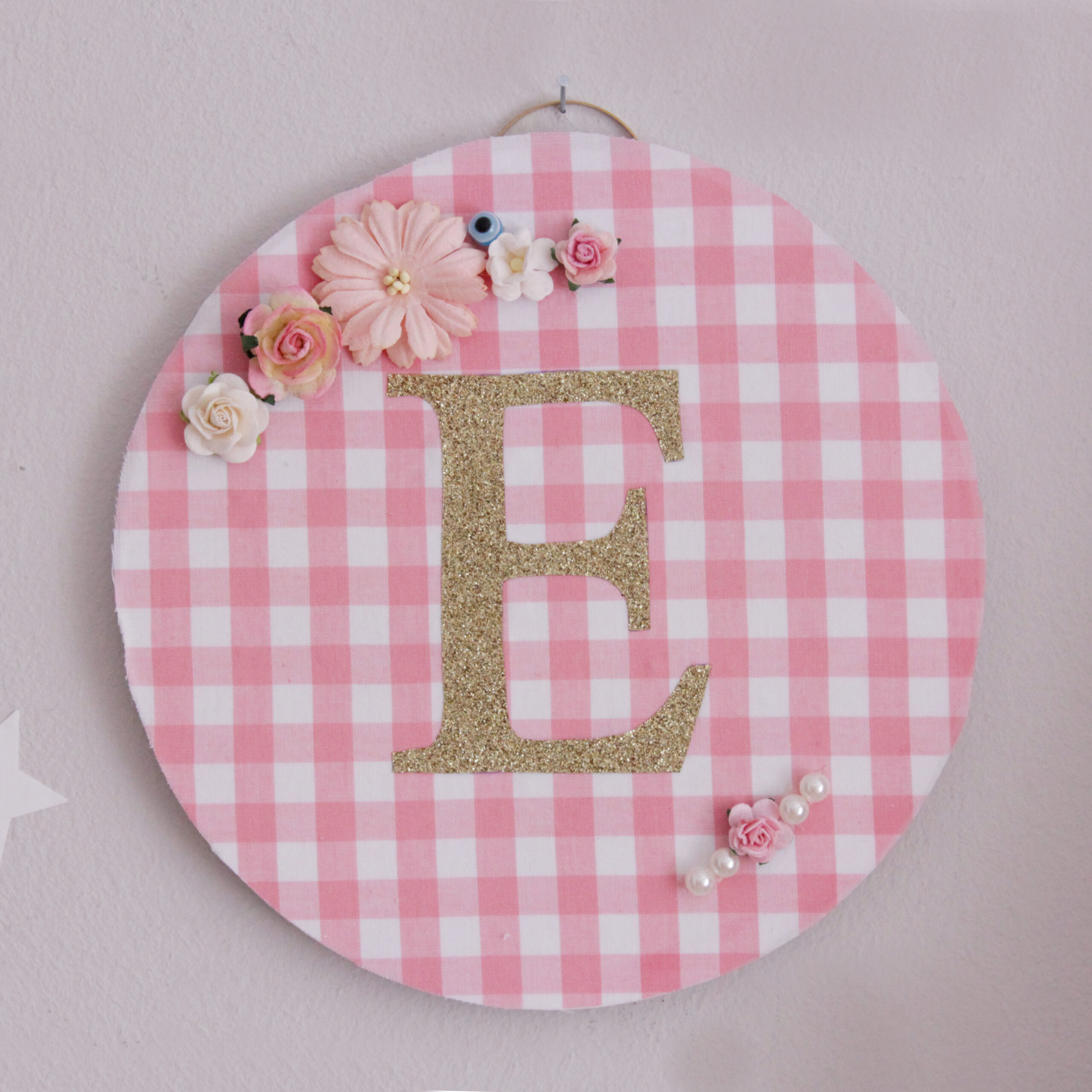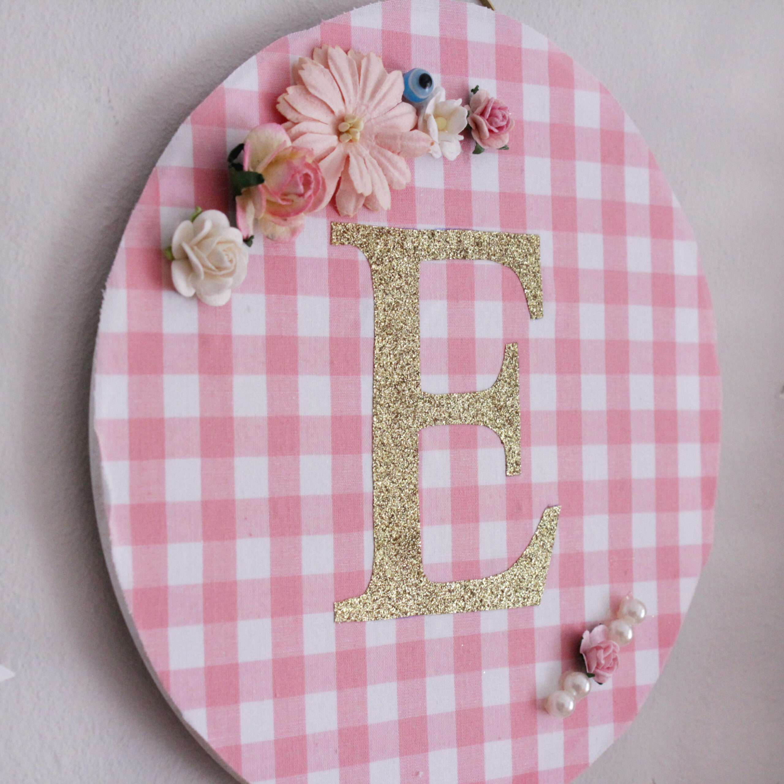 Πανέμορφο στρογγυλό ξύλινο διακοσμητικό τοίχου από MDF. Σε ροζ καρό ύφασμα με χρυσό glitter μονόγραμμα, διακοσμητικά λουλουδάκια,πέρλες και μάτι χαντρούλα.