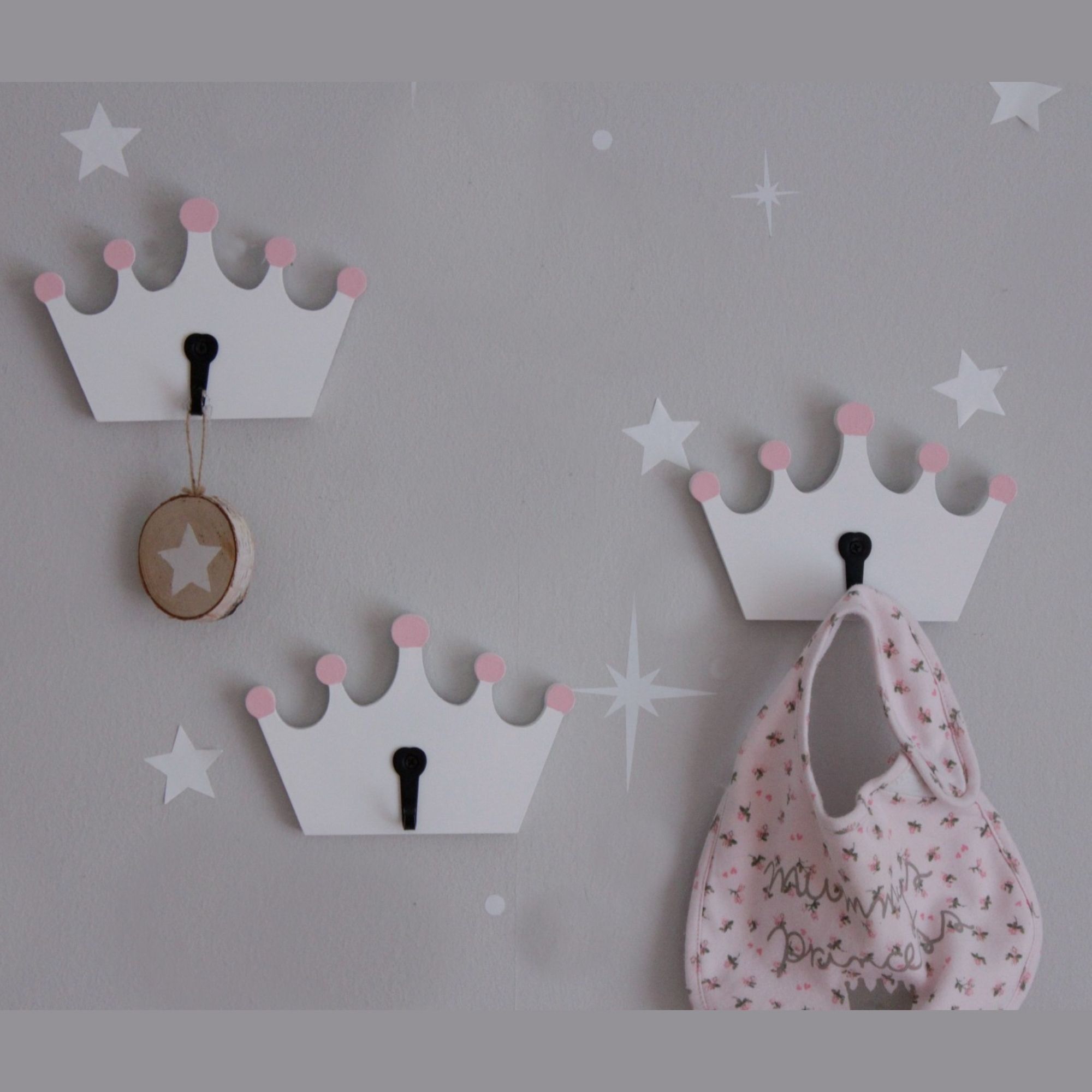 Κρεμάστρα τοίχου σε σε σχέδιο κορωνίτσα και χρώμα λευκό με ροζ μυτούλες. Είναι από mdf και έχει ένα κρεμασταράκι. Συνδυάστε τη με ένα ραφι σε σχέδιο αστέρι και κάντε τον δική σας μοναδική σύνθεση!