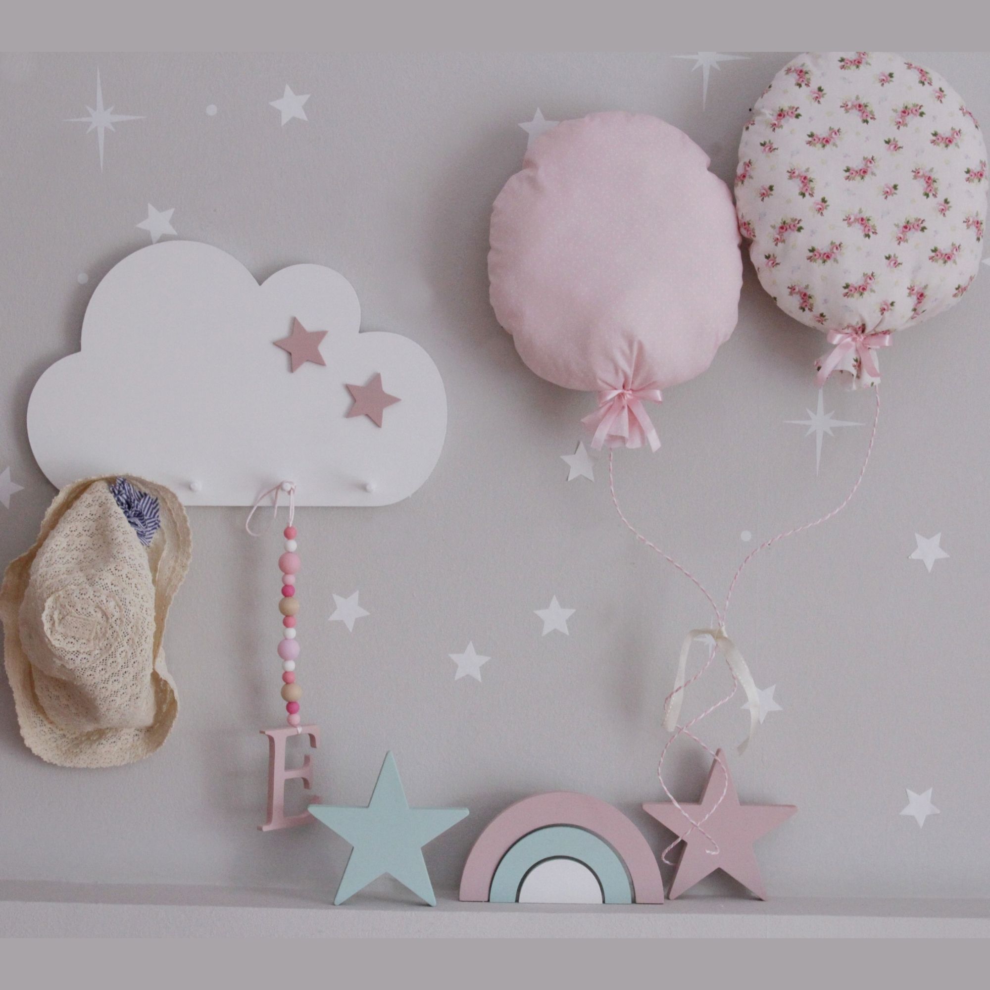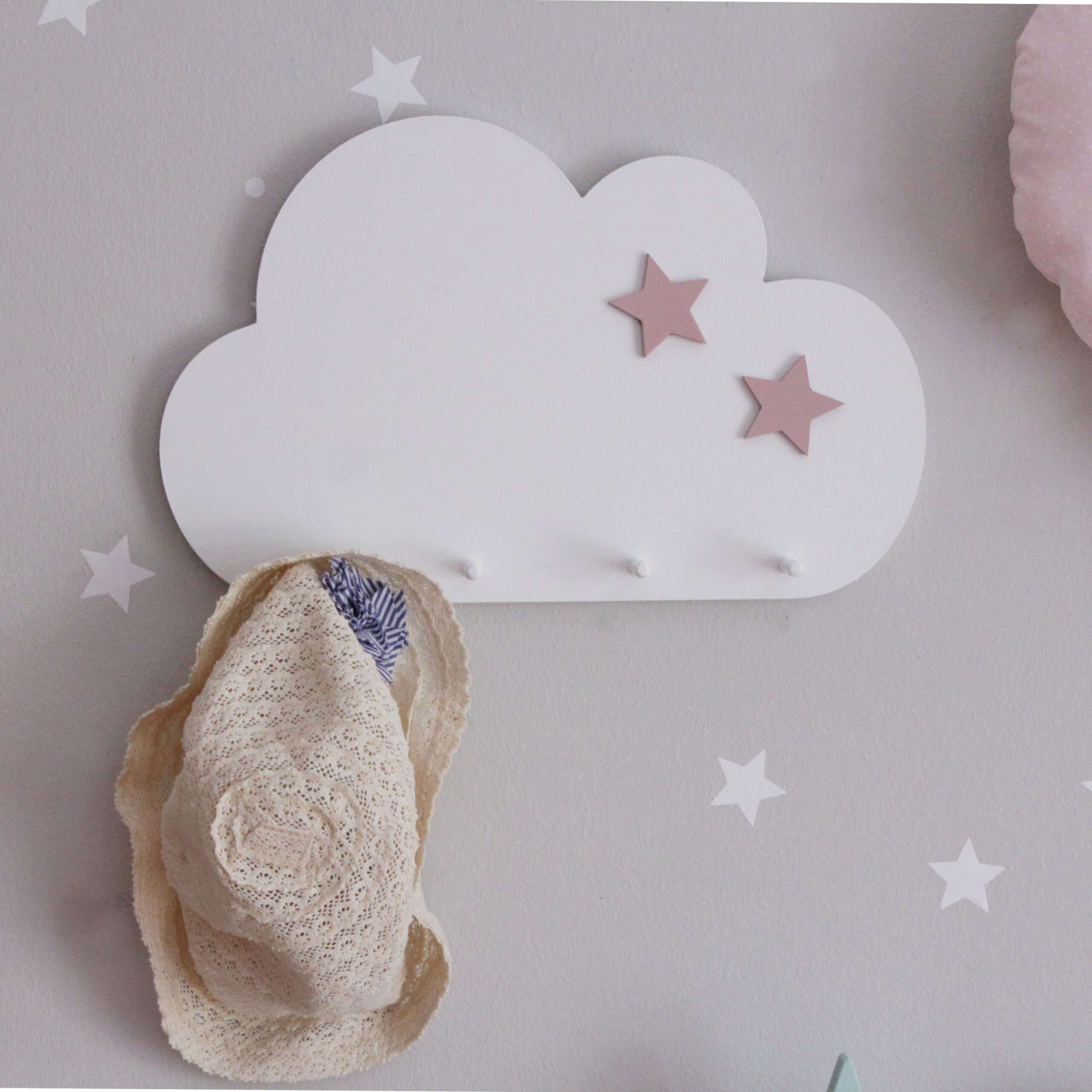 Κρεμάστρα τοίχου σε σχέδιο συννεφάκι σε λευκό χρώμα με δύο αστεράκια σε αποχρώσεις του ροζ. Είναι από mdf και έχει 4 κρεμασταράκια. Συνδυάστε το με ένα ραφάκι σε σχέδιο φεγγάρι και κάντε τον δικό σας μοναδικό συνδιασμό!