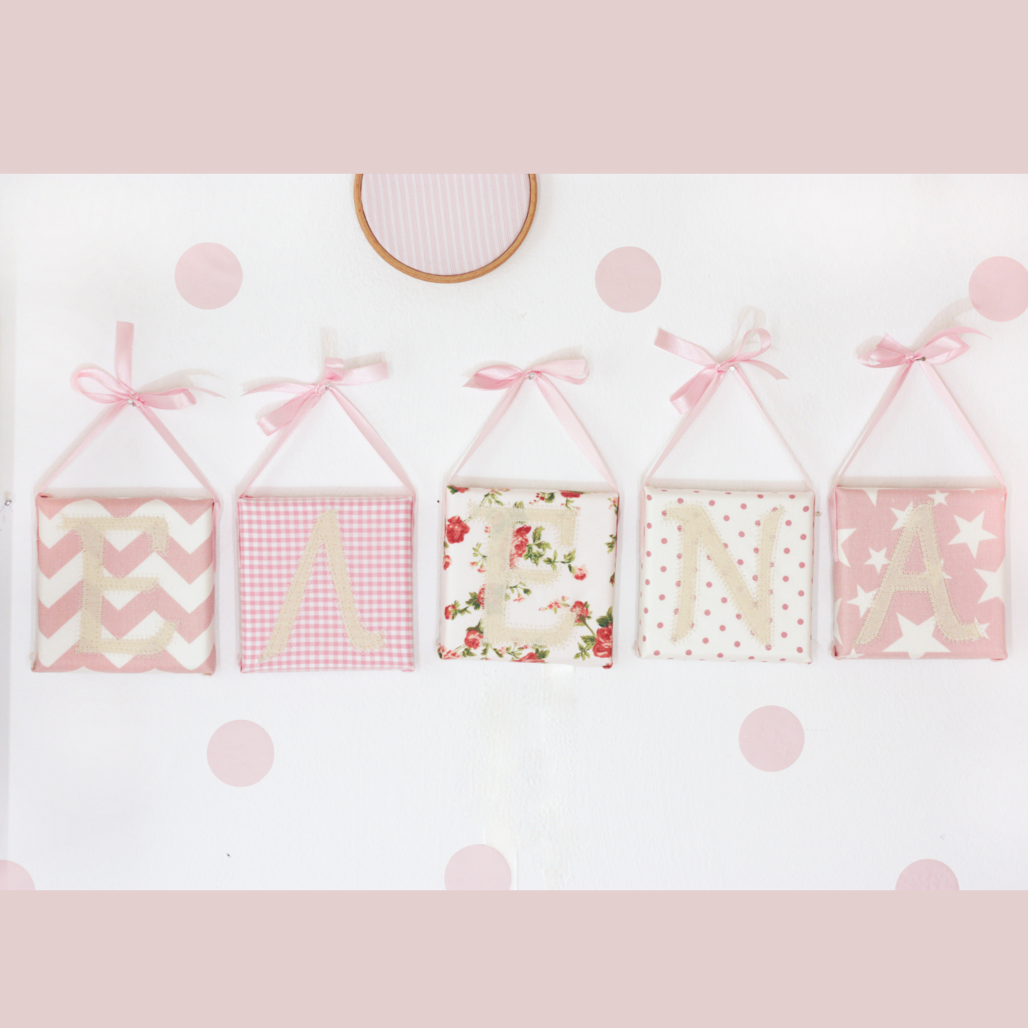 Η πιο ιδιαίτερη ιδέα για το όνομα του μωρού στο βρεφικό δωμάτιο! Καμβαδάκι 10×10εκ, με το κάθε γράμμα ξεχωριστά κεντημένο απλικέ σε αποχρώσεις του ροζ.Σε περίπτωση που θέλετε διαφορετικά χρώματα/υφάσματα επικοινωνήστε μαζί μας για να φτιάξετε τον δικό σας μοναδικό συνδιασμό! Οι υφες, τα υφάσματα και τα χρώματα που μπορείτε να χρησιμοποιήσετε, άπειρα! Κάθε καμβαδάκι κρεμιέται με σατέν κορδελάκι και τα υφάσματα που χρησιμοποιούμε είναι βαμβακερά.