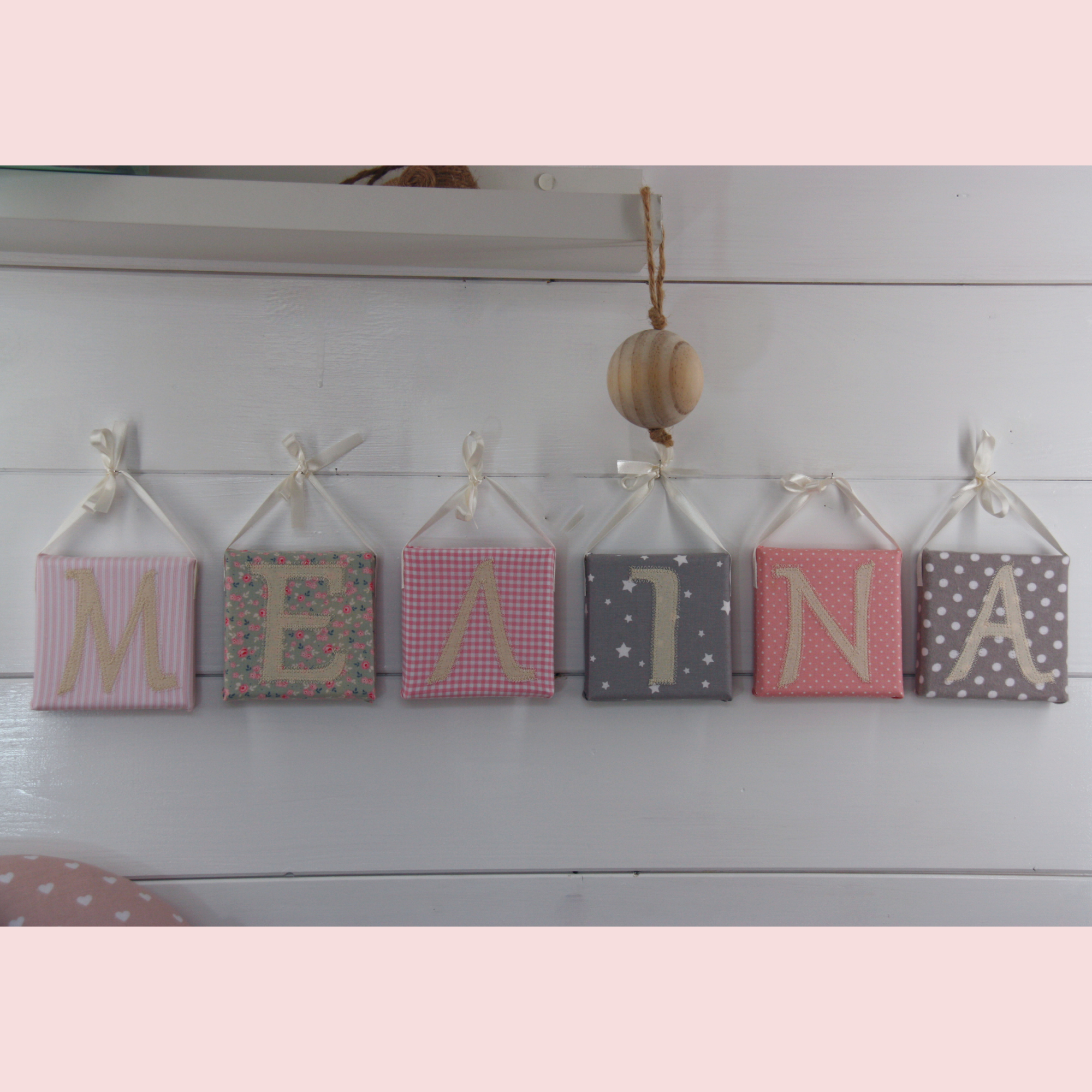 Η πιο ιδιαίτερη ιδέα για το όνομα του μωρού στο βρεφικό δωμάτιο! Καμβαδάκι 10×10εκ,  με το κάθε γράμμα ξεχωριστά κεντημένο απλικέ σε αποχρώσεις του ροζ.Σε περίπτωση που θέλετε διαφορετικά χρώματα/υφάσματα επικοινωνήστε μαζί μας για να φτιάξετε τον δικό σας μοναδικό συνδιασμό! Οι υφες, τα υφάσματα και τα χρώματα που μπορείτε να χρησιμοποιήσετε, άπειρα! Κάθε καμβαδάκι κρεμιέται με σατέν κορδελάκι και τα υφάσματα που χρησιμοποιούμε είναι βαμβακερά.