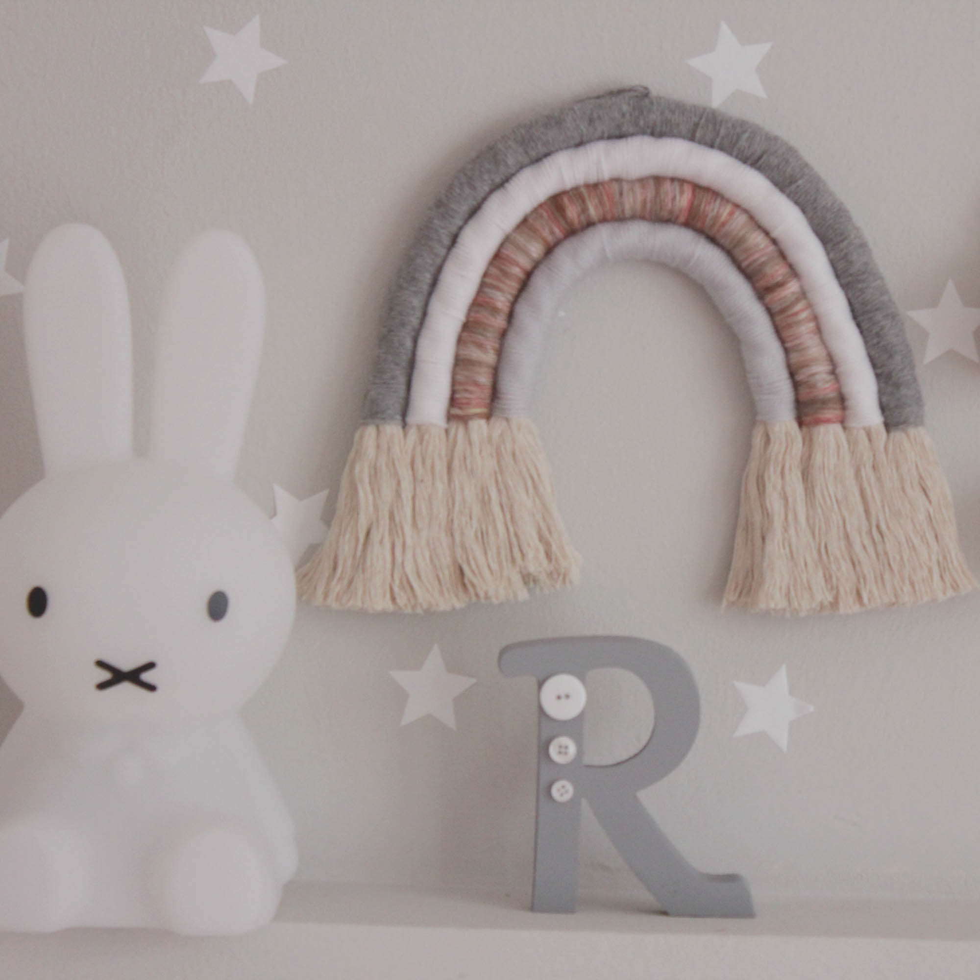 Χειροποίητο ουράνιο τόξο μακραμέ από νήμα και χοντρό κορδόνι. Ενα μοντέρνο διακοσμητικό που τοποθετείται στον τοίχο με καρφάκι σε χρώμα γκρι σκούρο, λευκό, ροζ/καφέ, γκρι απαλό. Σε περίπτωση που θέλετε διαφορετικό χρώμα νήματος μπορείτε να δημιουργήσετε τον δικό σας μοναδικό συνδυασμό !
