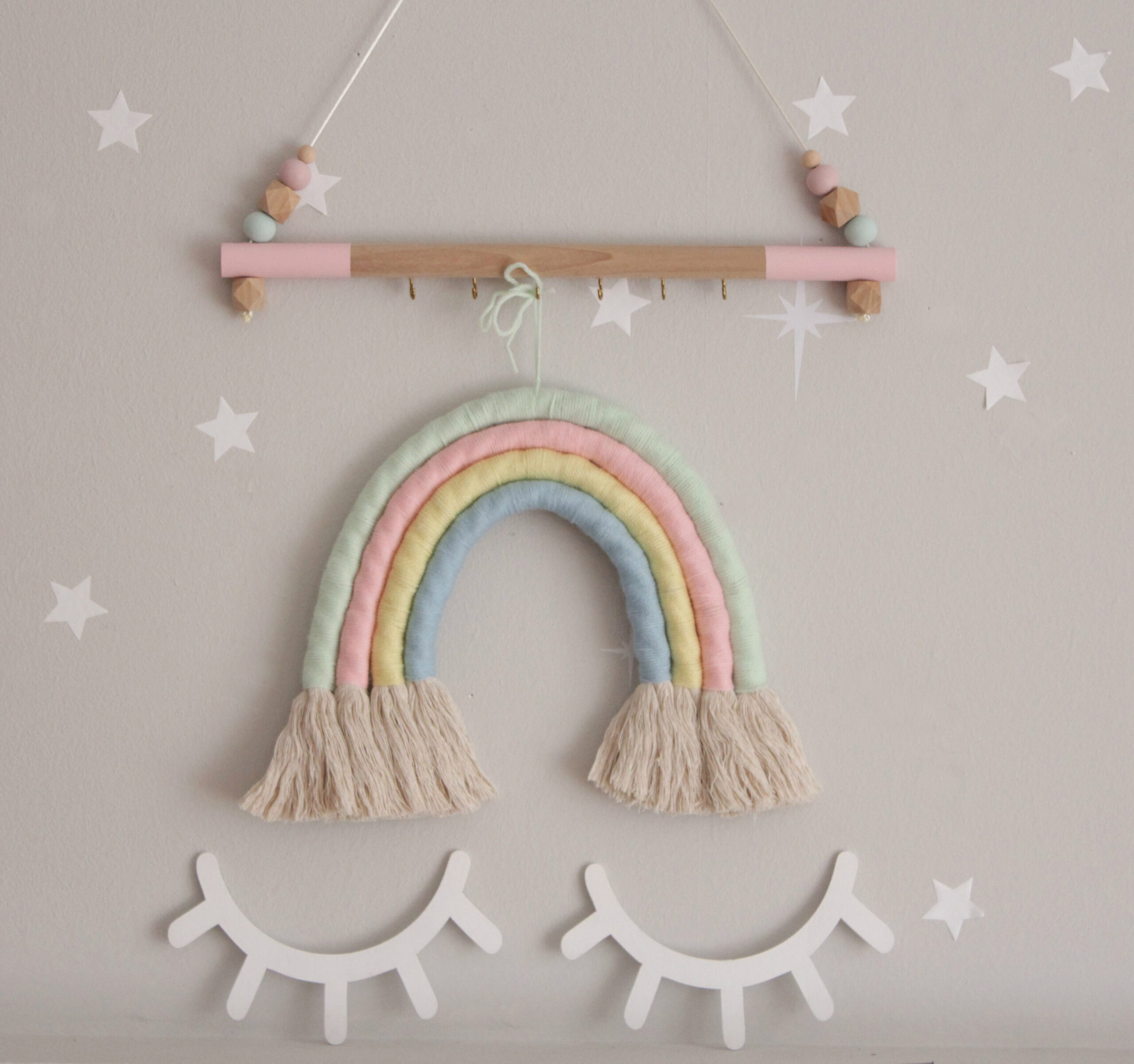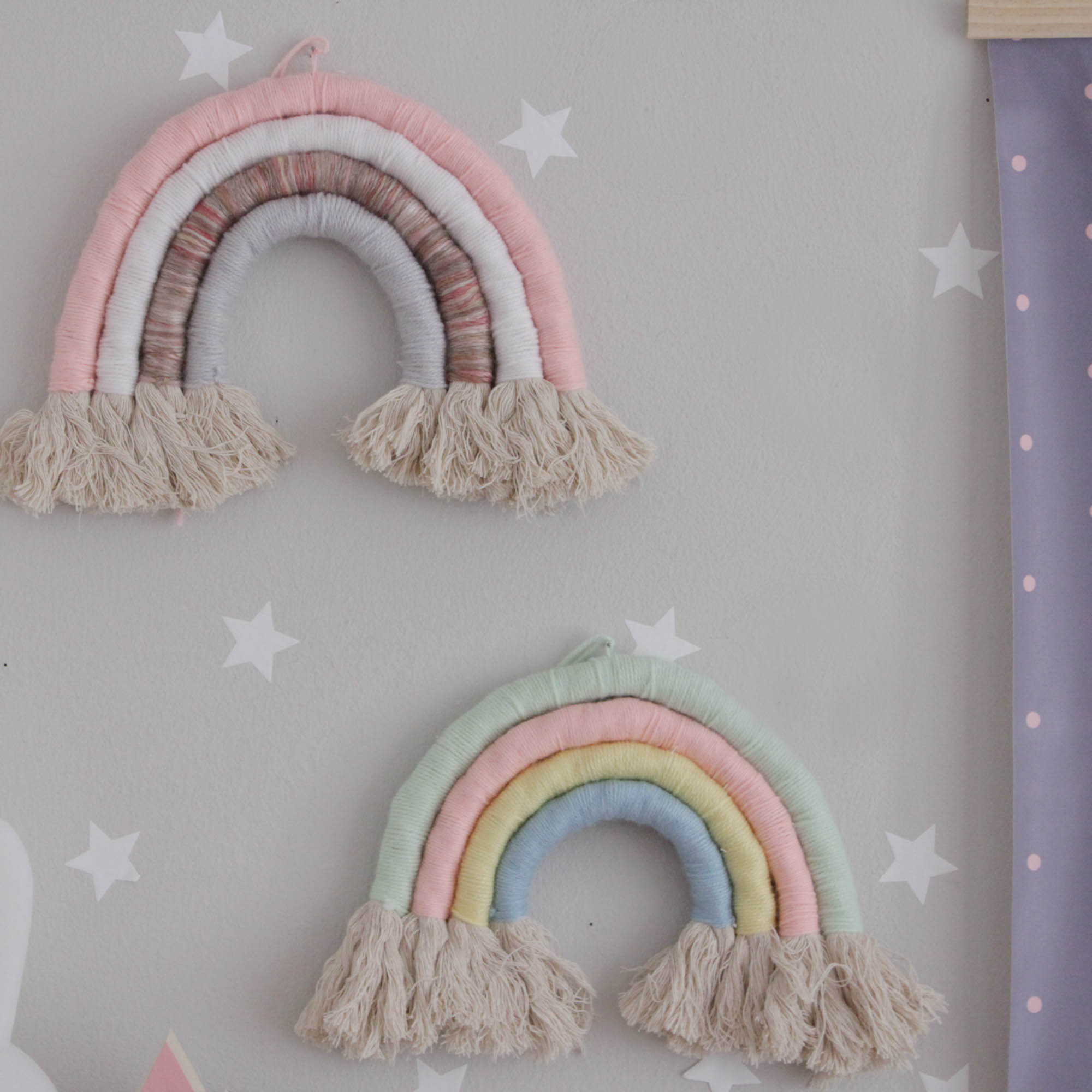 Χειροποίητο ουράνιο τόξο μακραμέ από νήμα και χοντρό κορδόνι. Ενα μοντέρνο διακοσμητικό που τοποθετείται στον τοίχο με καρφάκι σε χρώμα μέντα, ροζ,κίτρινο απαλό και θαλασσί. Σε περίπτωση που θέλετε διαφορετικά χρώματα νήματος μπορείτε να δημιουργήσετε τον δικό σας μοναδικό συνδυασμό !