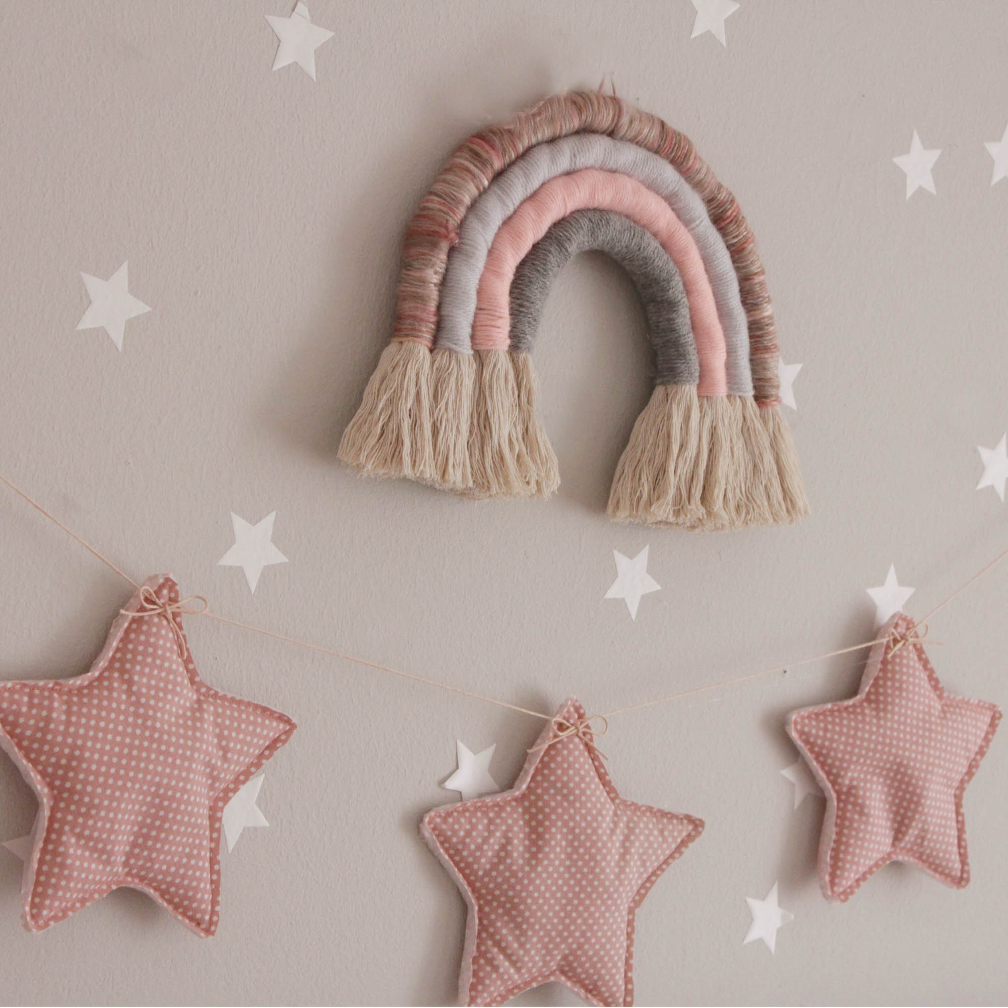 Χειροποίητο ουράνιο τόξο μακραμέ από νήμα και χοντρό κορδόνι. Ενα μοντέρνο διακοσμητικό που τοποθετείται στον τοίχο με καρφάκι σε χρώμα ροζ/καφέ,γκρι απαλό, ροζ, γκρι σκούρο. Σε περίπτωση που θέλετε διαφορετικό χρώμα νήματος μπορείτε να δημιουργήσετε τον δικό σας μοναδικό συνδυασμό !