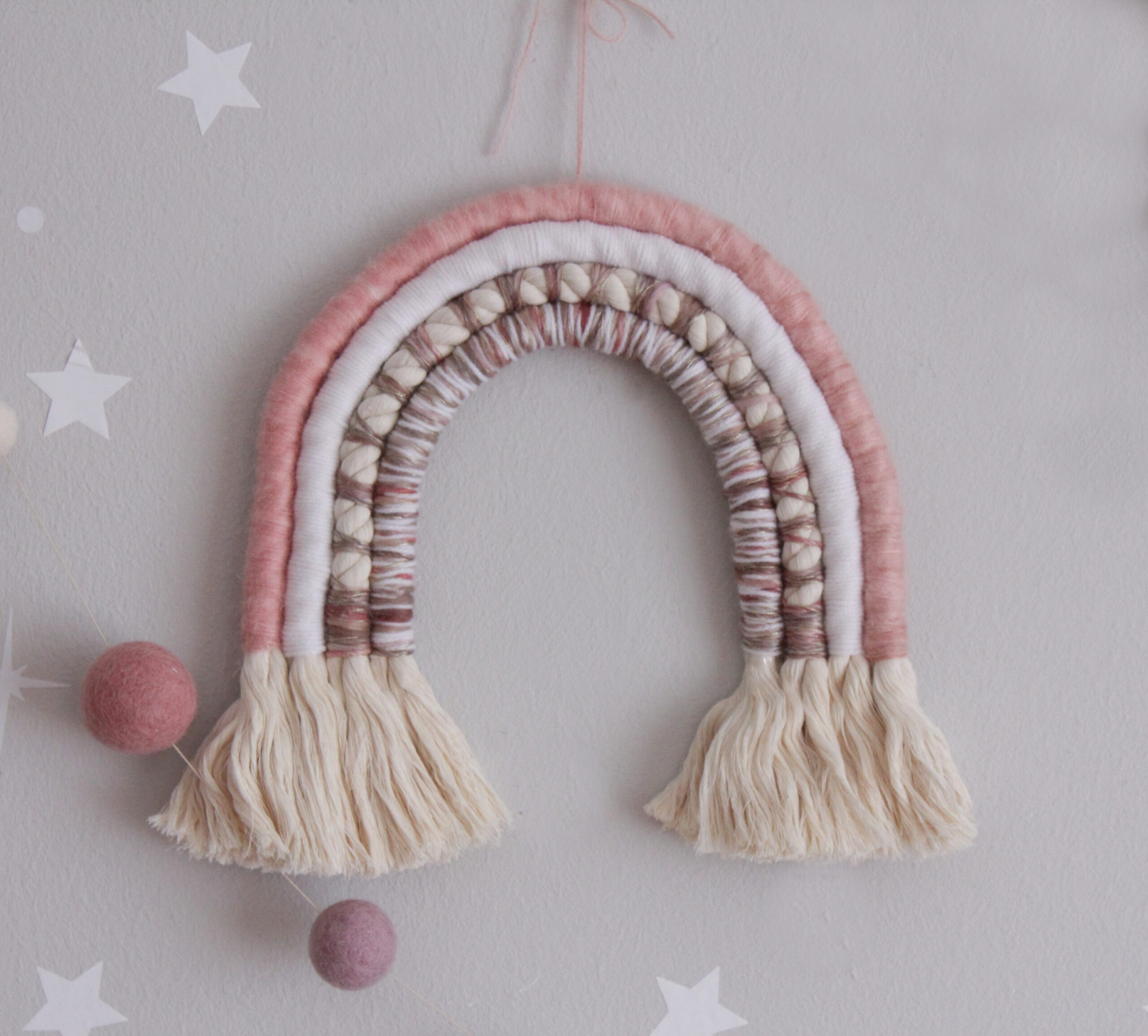 Χειροποίητο ουράνιο τόξο μακραμέ από νήμα και χοντρό κορδόνι. Ενα μοντέρνο διακοσμητικό που τοποθετείται στον τοίχο με καρφάκι σε χρώμα ροζ και λευκό. Σε περίπτωση που θέλετε διαφορετικό χρώμα νήματος μπορείτε να δημιουργήσετε τον δικό σας μοναδικό συνδυασμό !