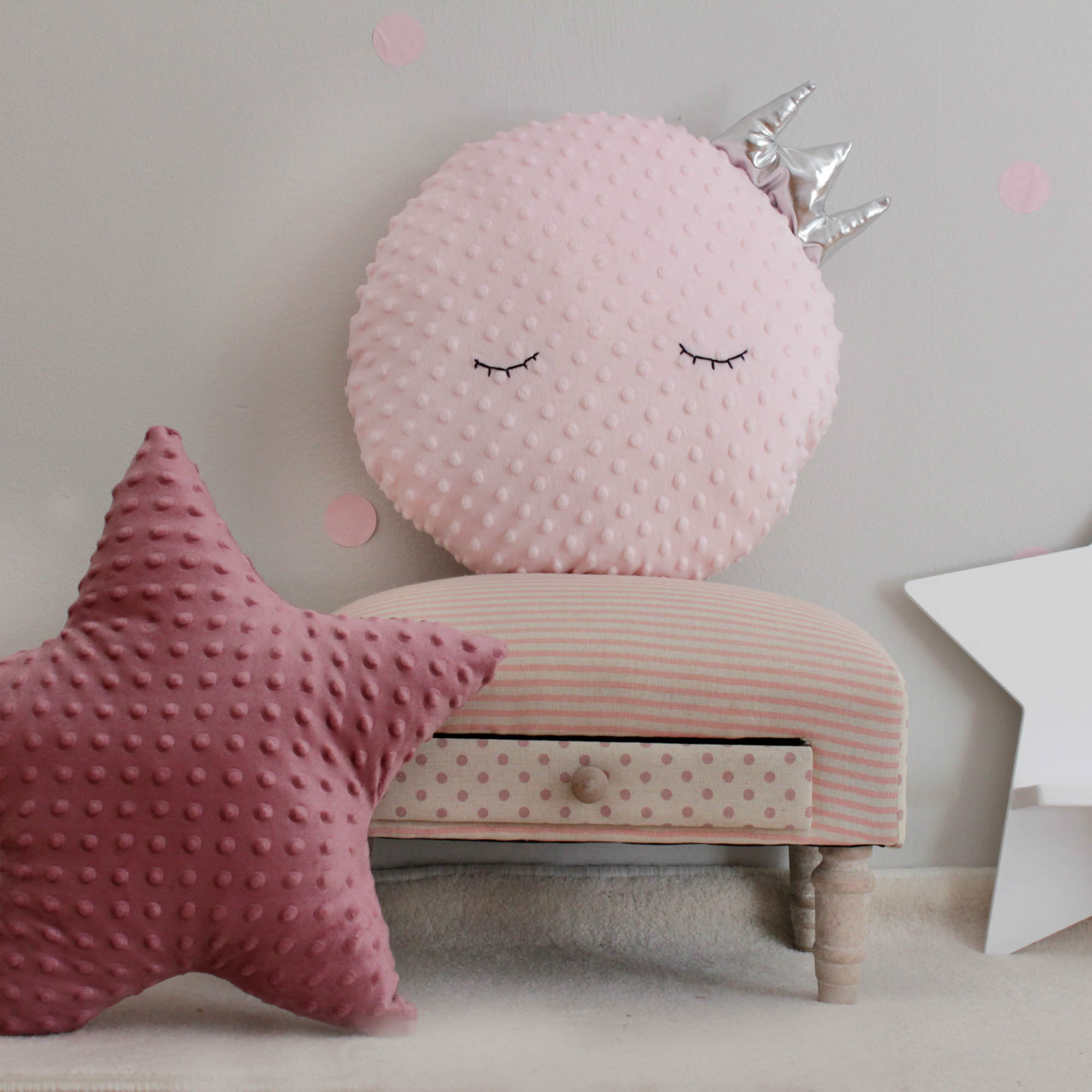 Μαξιλαράκι σε σχέδιο φεγγάρι σε χρώμα ροζ απαλό με ασημί κορωνίτσα. Έχει υπέροχη υφή, είναι εξαιρετικά απαλό και μαλακό με πέλος τύπου βελουτέ.Έχει υποαλλεργική γέμιση και είναι χωρίς φερμουάρ κατάλληλο για βρέφη.