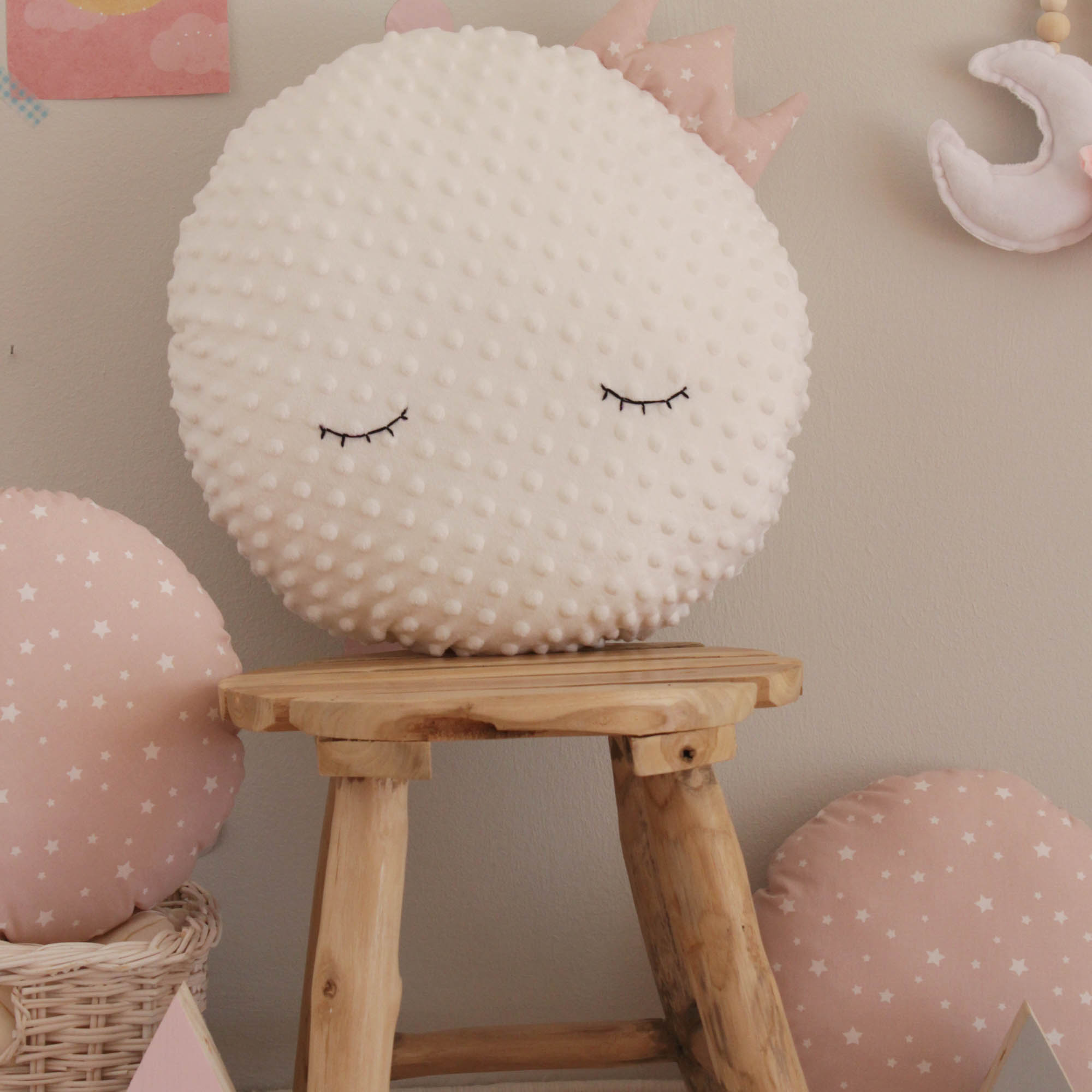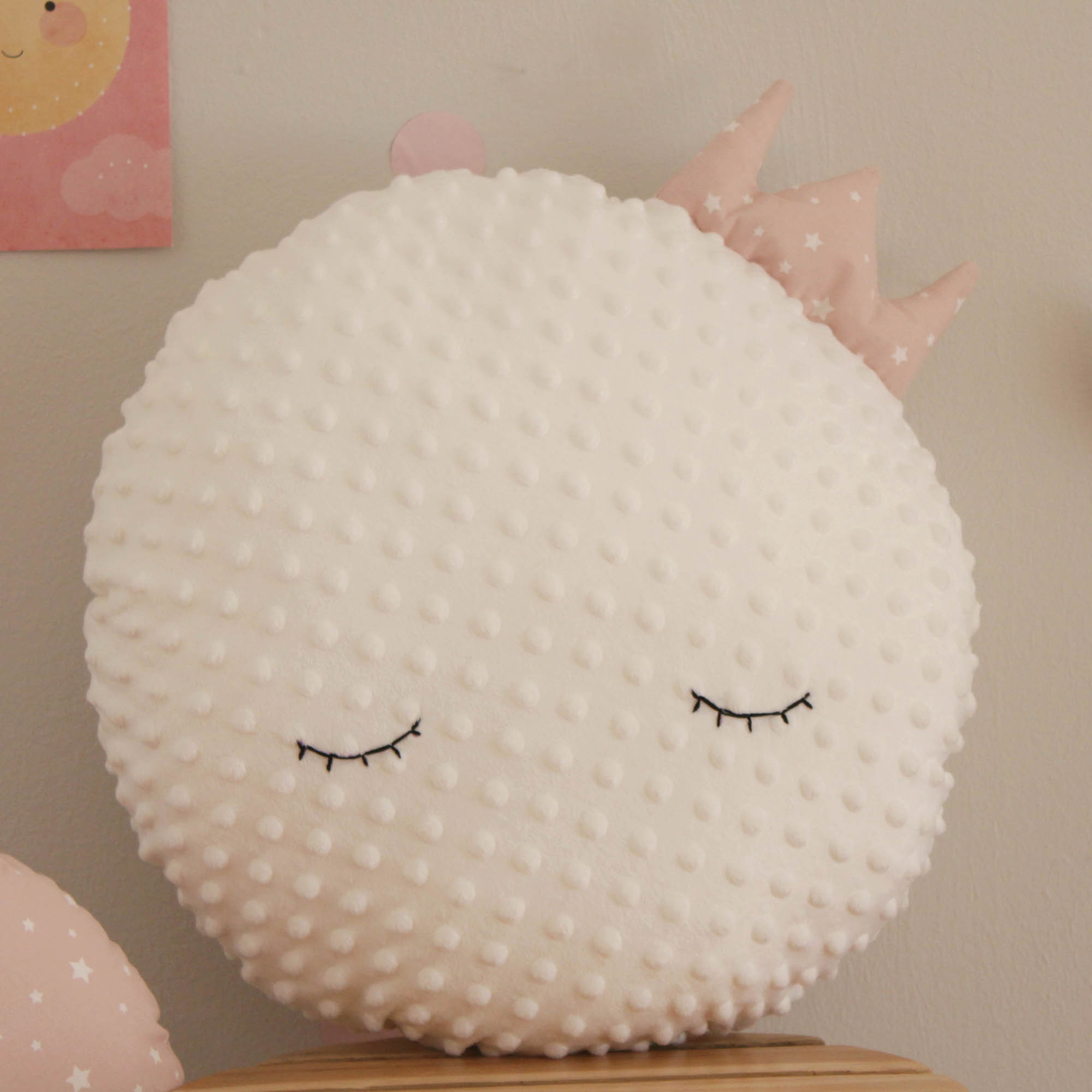 Μαξιλαράκι σε σχέδιο φεγγάρι σε χρώμα λευκό με dusty ροζ κορωνίτσα. Έχει υπέροχη υφή, είναι εξαιρετικά απαλό και μαλακό με πέλος τύπου βελουτέ.Έχει υποαλλεργική γέμιση και είναι χωρίς φερμουάρ κατάλληλο για βρέφη.