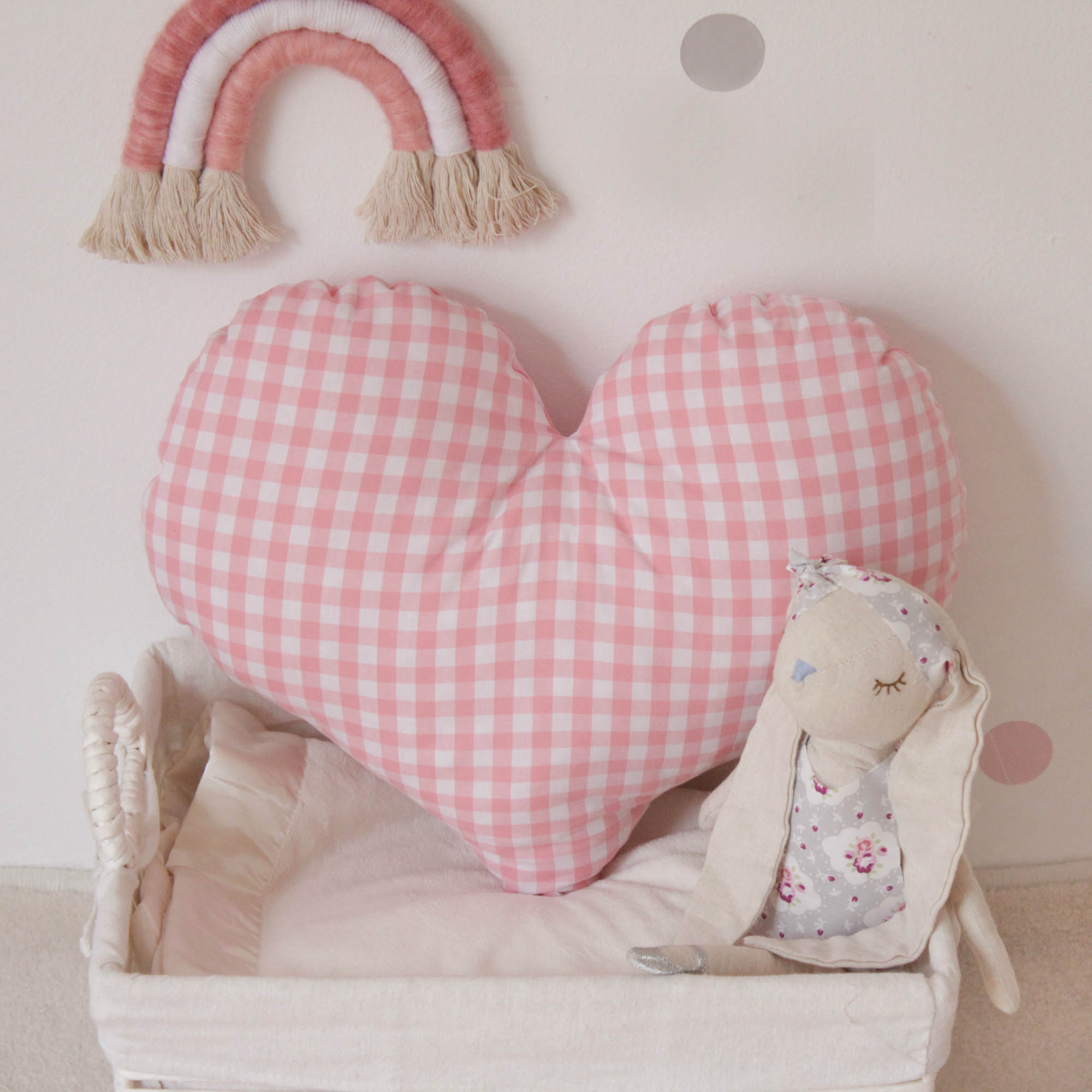 Μαξιλαράκι σε σχέδιο καρδιά σε χρώμα ροζ λευκό καρό. Έχει υπέροχη υφή και είναι εξαιρετικά μαλακό.Έχει υποαλλεργική γέμιση και είναι χωρίς φερμουάρ κατάλληλο για βρέφη.