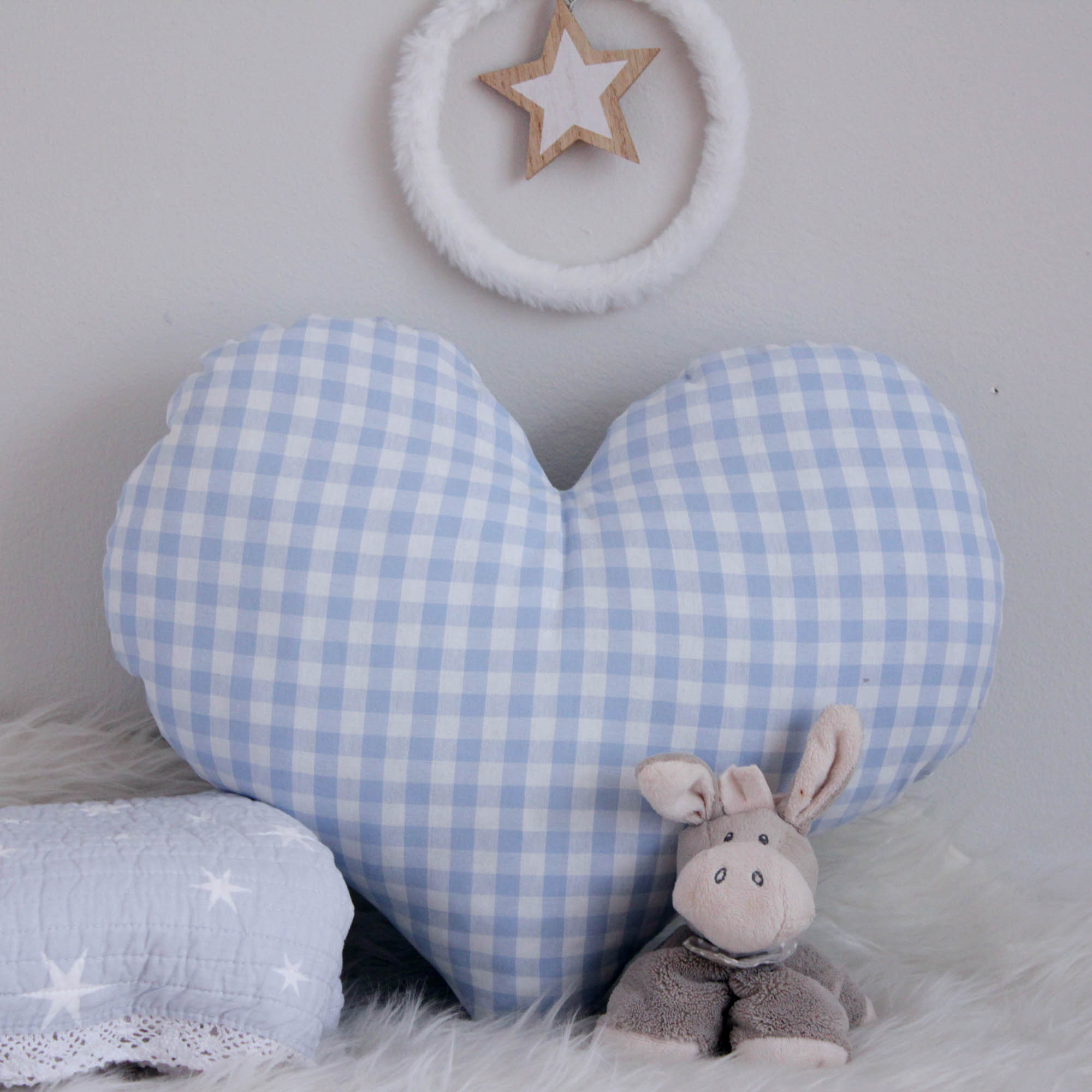 Μαξιλαράκι σε σχέδιο καρδιά σε χρώμα θαλασσί λευκό καρό. Έχει υπέροχη υφή και είναι εξαιρετικά μαλακό.Έχει υποαλλεργική γέμιση και είναι χωρίς φερμουάρ κατάλληλο για βρέφη.