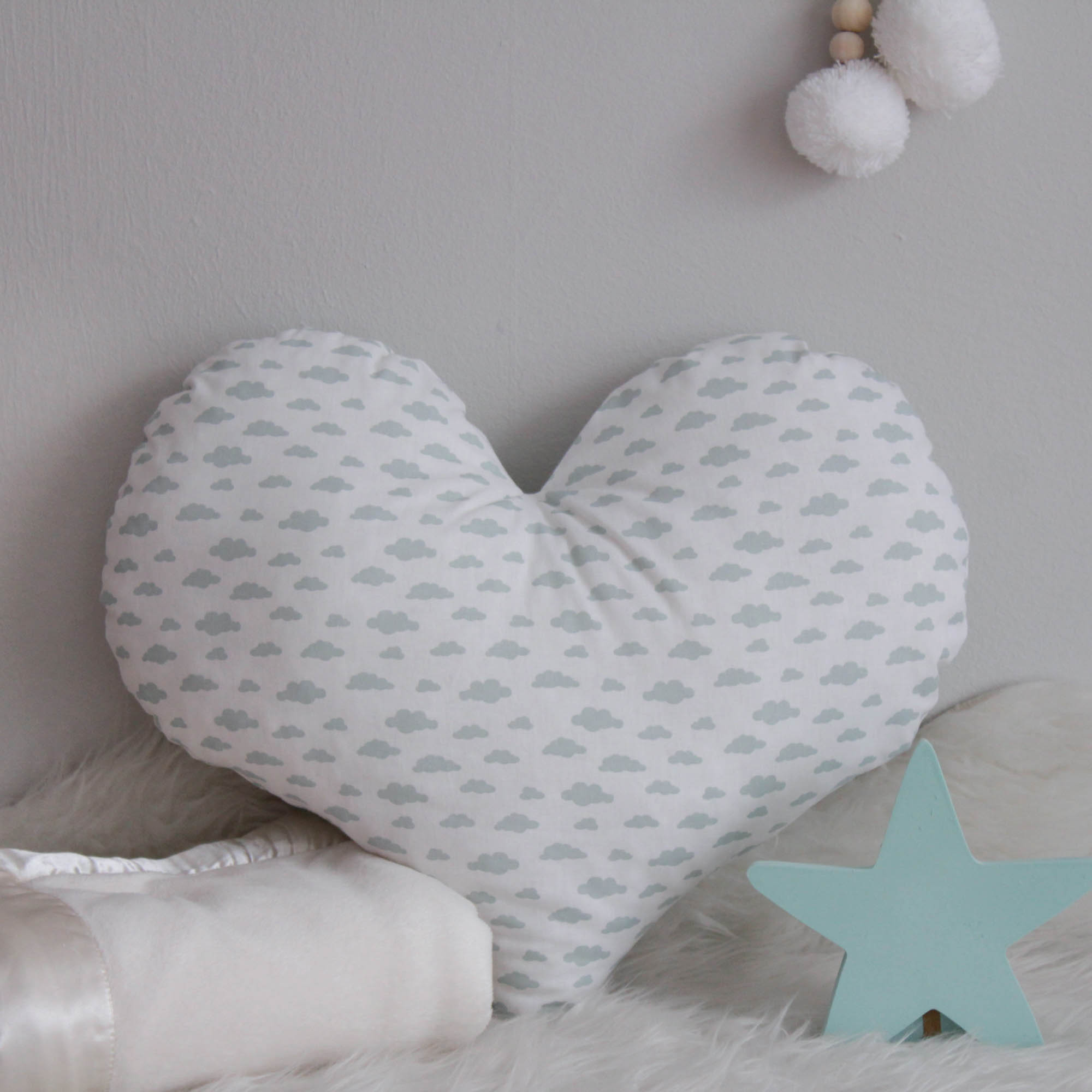 Μαξιλαράκι σε σχέδιο καρδιά σε χρώμα λευκό με mint συννεφάκια. Έχει υπέροχη υφή και είναι εξαιρετικά μαλακό.Έχει υποαλλεργική γέμιση και είναι χωρίς φερμουάρ κατάλληλο για βρέφη.