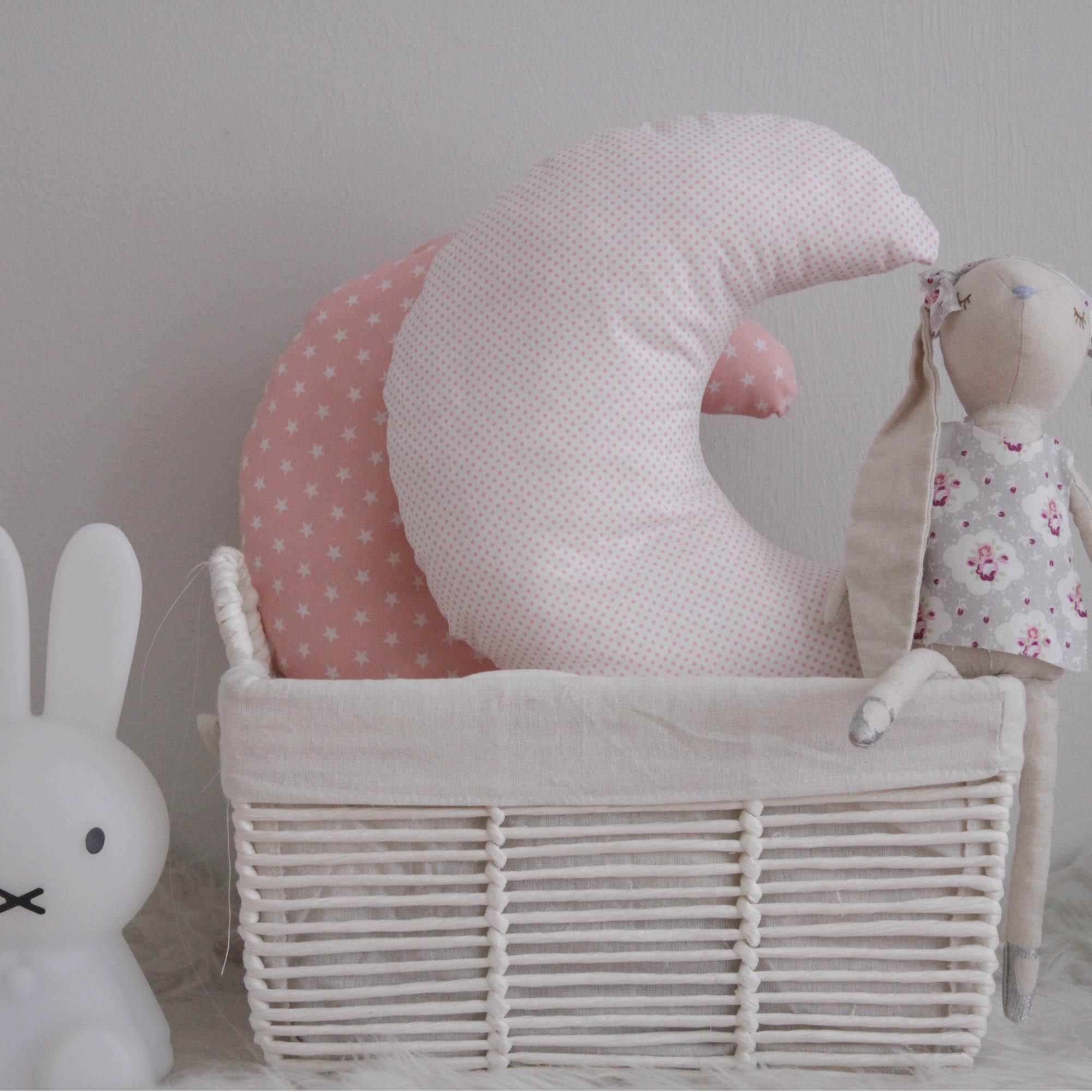 Μαξιλαράκι σε σχέδιο μισοφέγγαρο σε χρώμα λευκό με ροζ πουά. Έχει υπέροχη υφή και είναι εξαιρετικά μαλακό. Έχει υποαλλεργική γέμιση και είναι χωρίς φερμουάρ κατάλληλο για βρέφη.