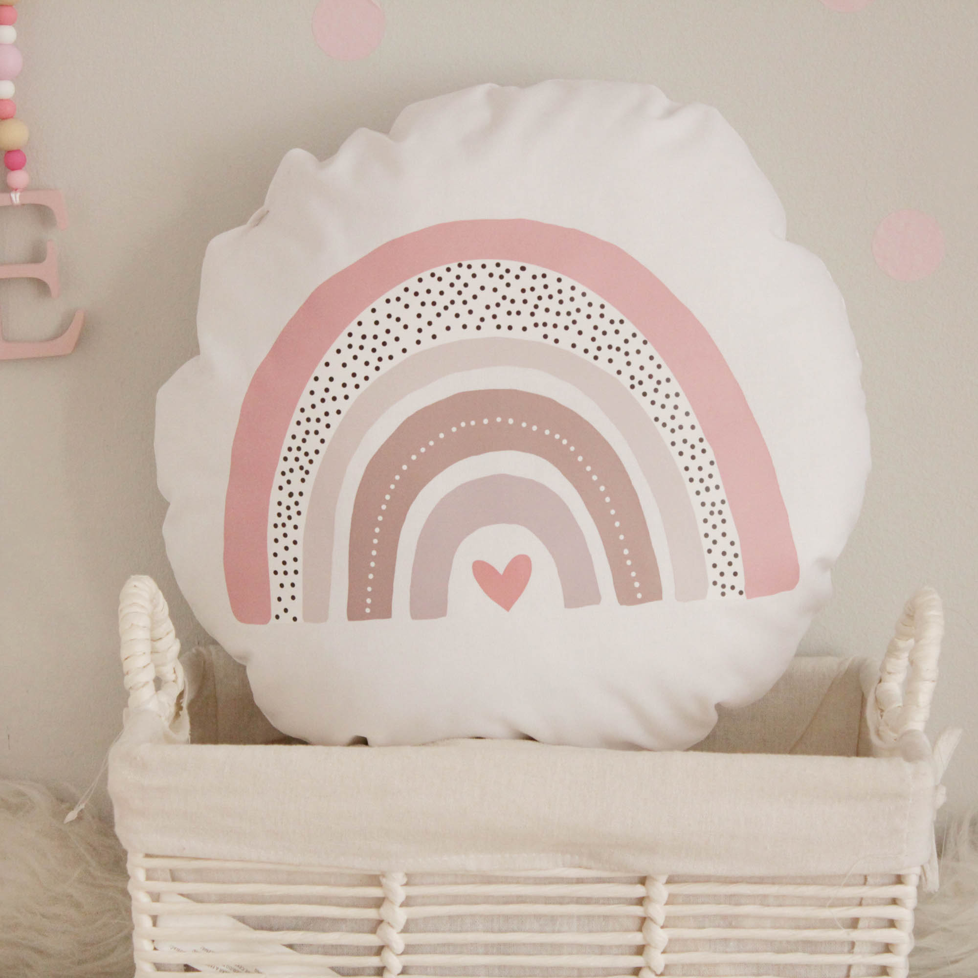 Μαλακό μαξιλαράκι με τύπωμα ουράνιο τόξο σε ροζ αποχρώσεις Το μαξιλαράκι έχει υποαλλεργική γέμιση και βαμβακερό ύφασμα.