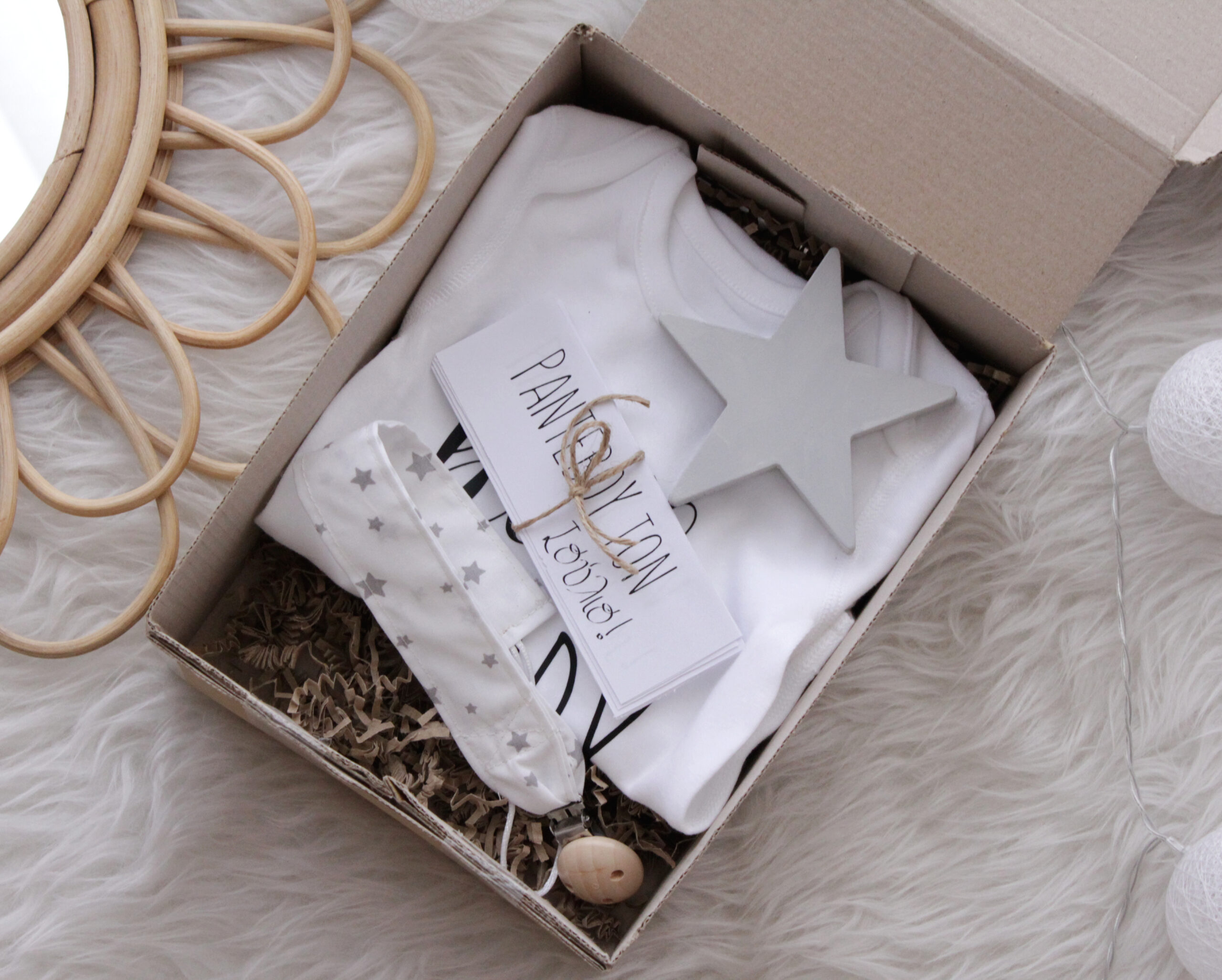 Το κουτί δώρο έκπληξη περιλαμβάνει ένα φορμάκι ενθύμιο με λογότυπο από 100% βαμβάκι , ένα κλιπ πιπίλας από 100% βαμβάκι , καρτελάκια με τους 12 μήνες για να επιλέξετε τον δικό σας μήνα ορόσημο και ένα ξύλινο γκρι αστεράκι.