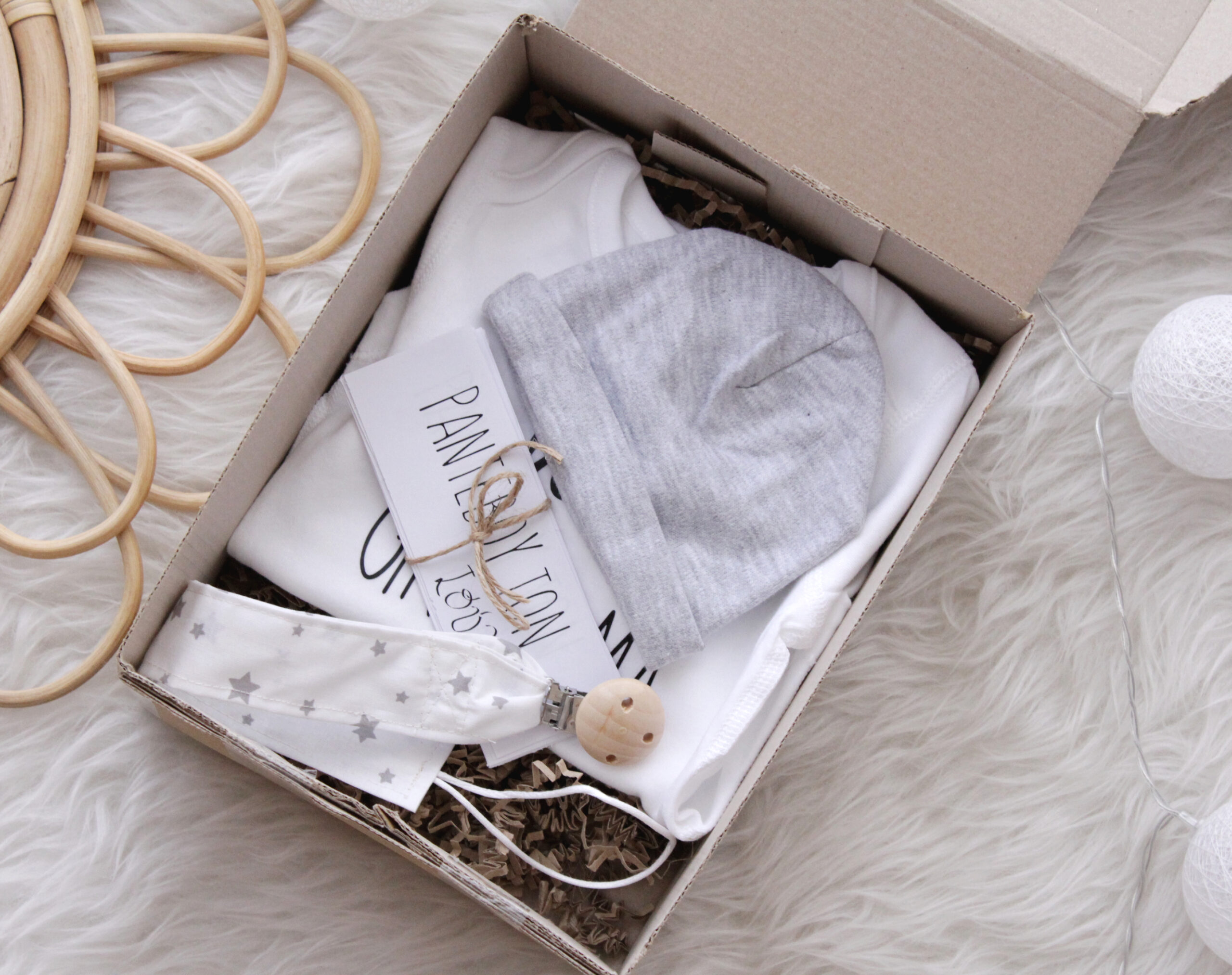 Το κουτί δώρο έκπληξη περιλαμβάνει ένα φορμάκι ενθύμιο με λογότυπο από 100% βαμβάκι , ένα κλιπ πιπίλας από 100% βαμβάκι , καρτελάκια με τους 12 μήνες για να επιλέξετε τον δικό σας μήνα ορόσημο και ένα βαμβακερό σκουφάκι για το νεογέννητο.