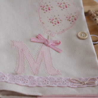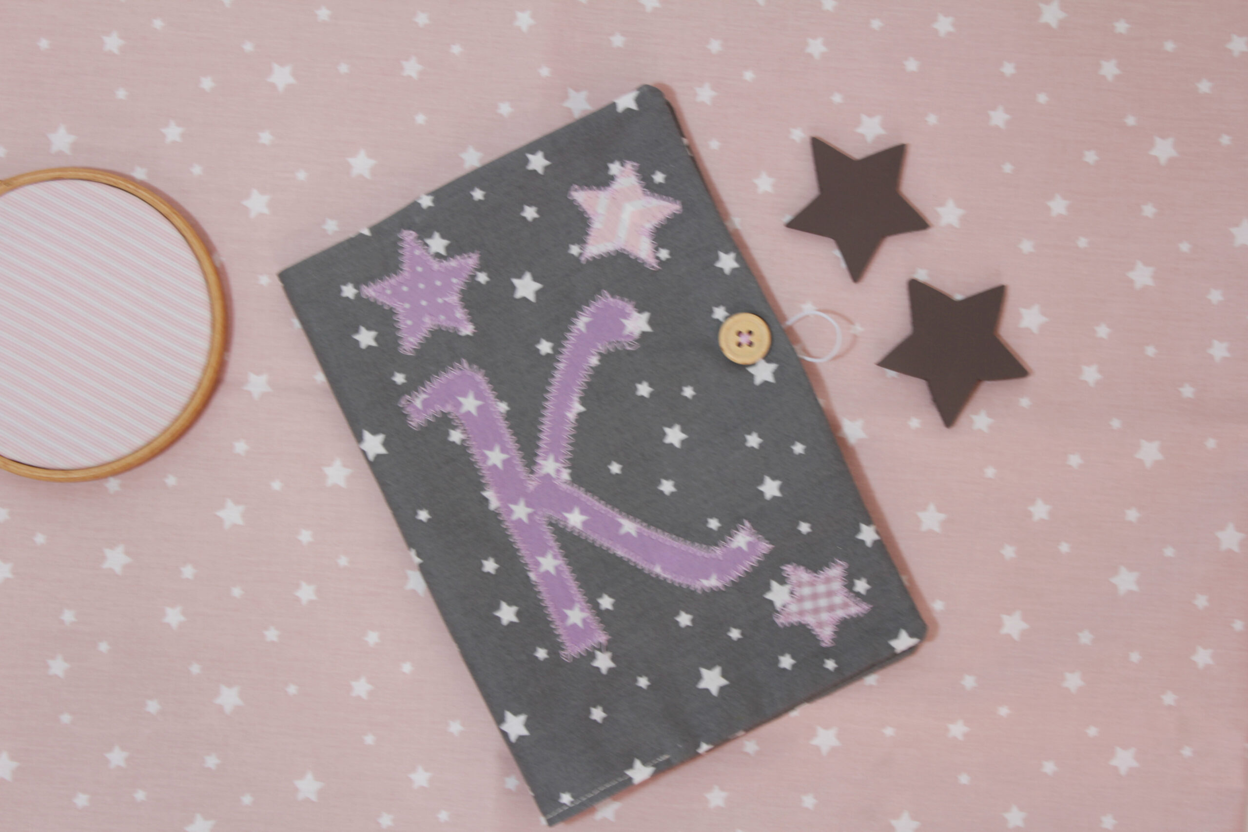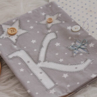 Ιδιαίτερη , χειροποίητη θήκη βιβλιαρίου υγείας σε γκρι και μωβ αποχρώσεις από βαμβακερά υφάσματα.
