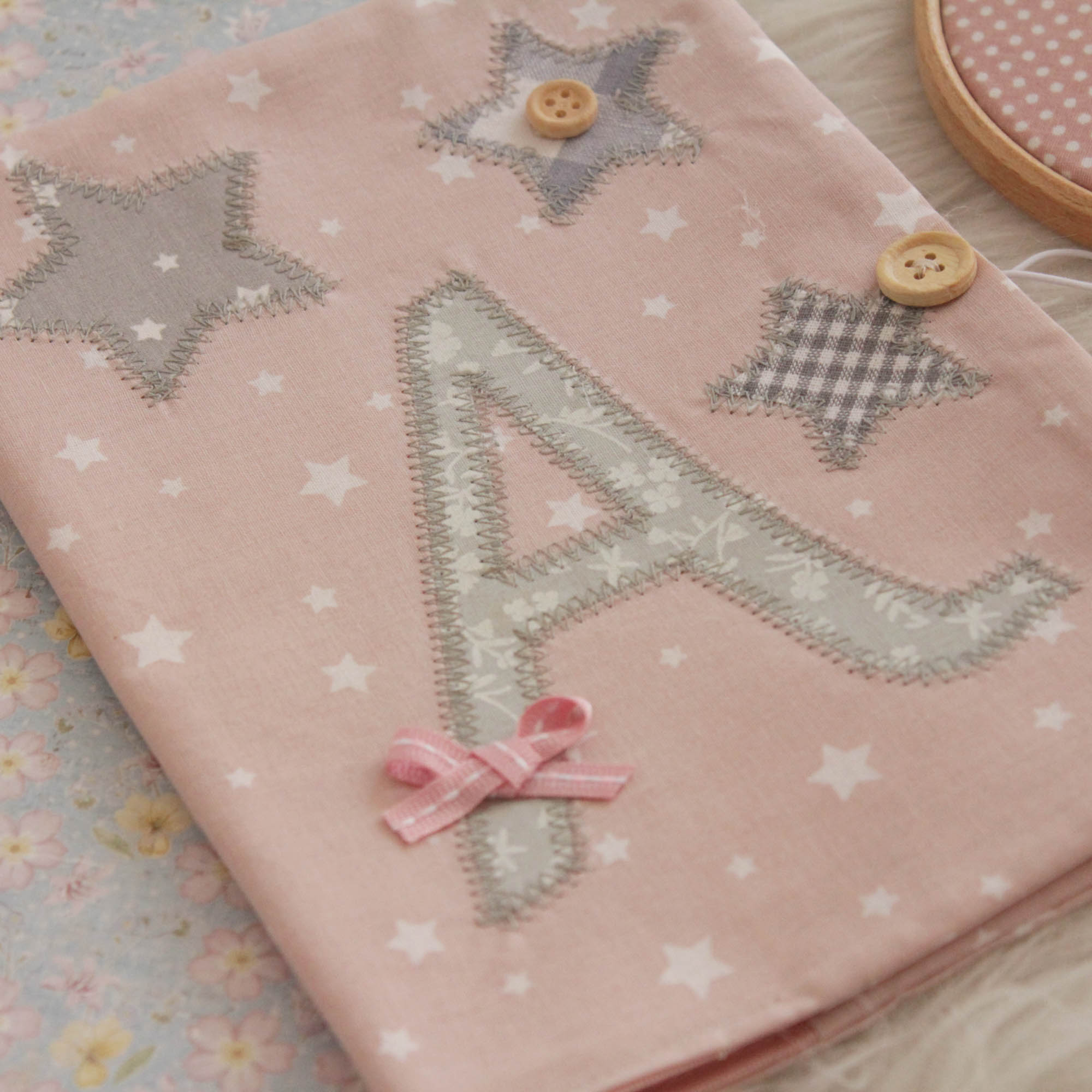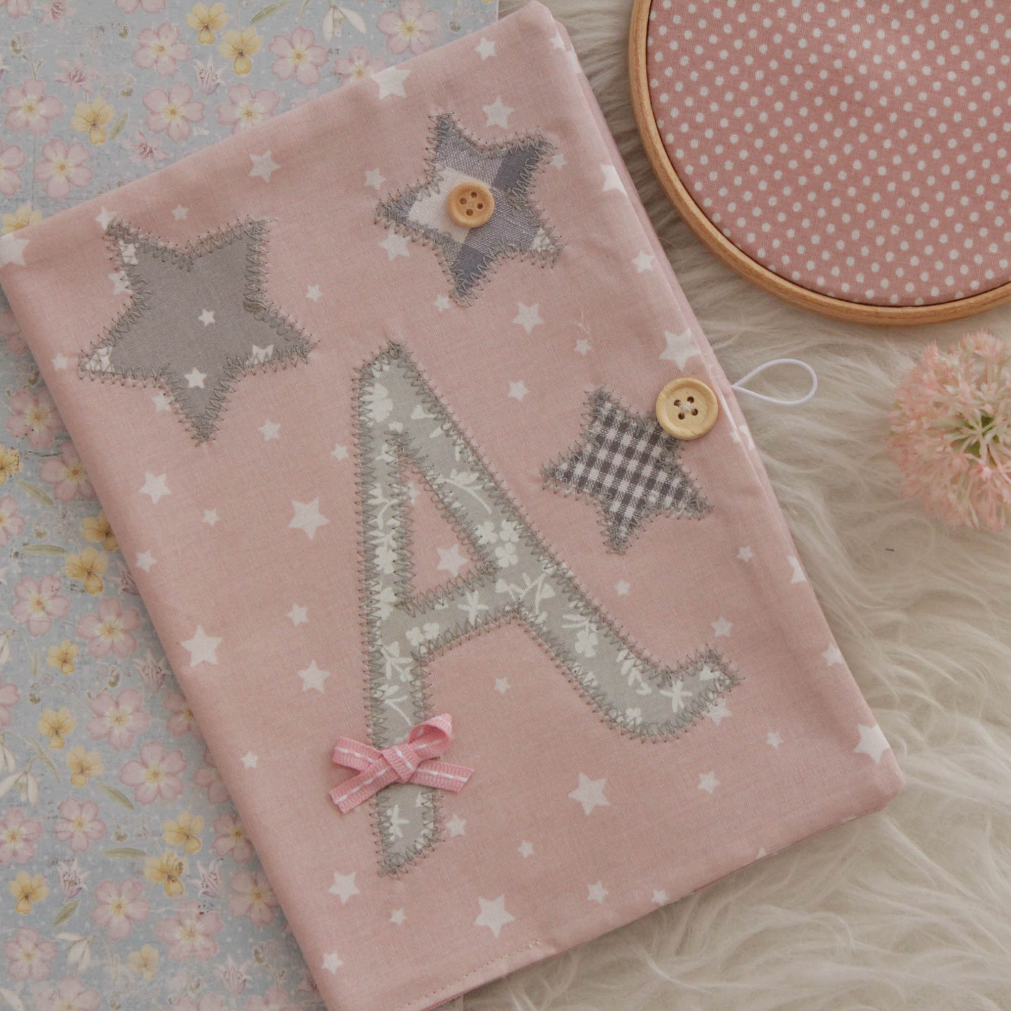 Ιδιαίτερη , χειροποίητη θήκη βιβλιαρίου υγείας σε γκρι και ροζ αποχρώσεις από βαμβακερά υφάσματα.