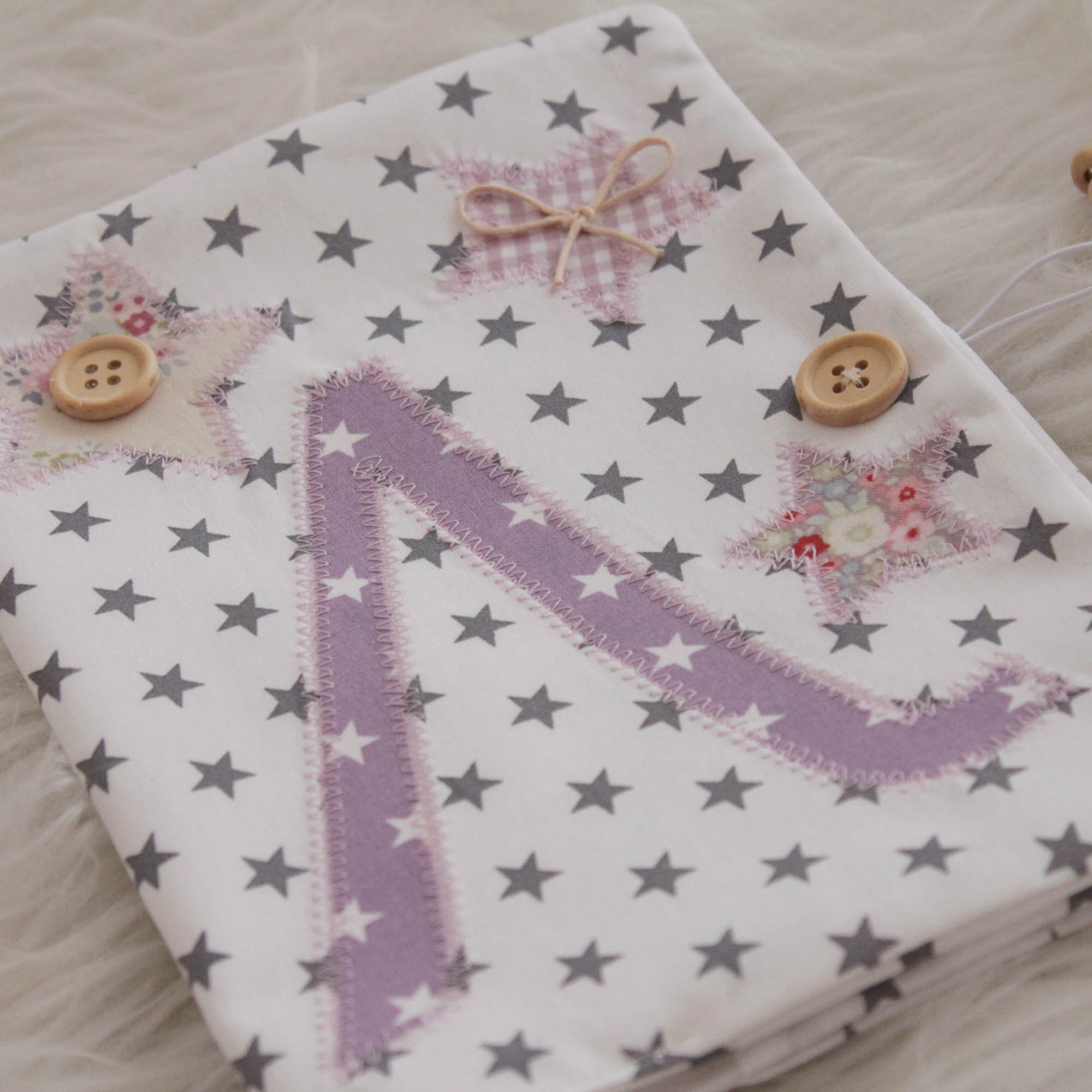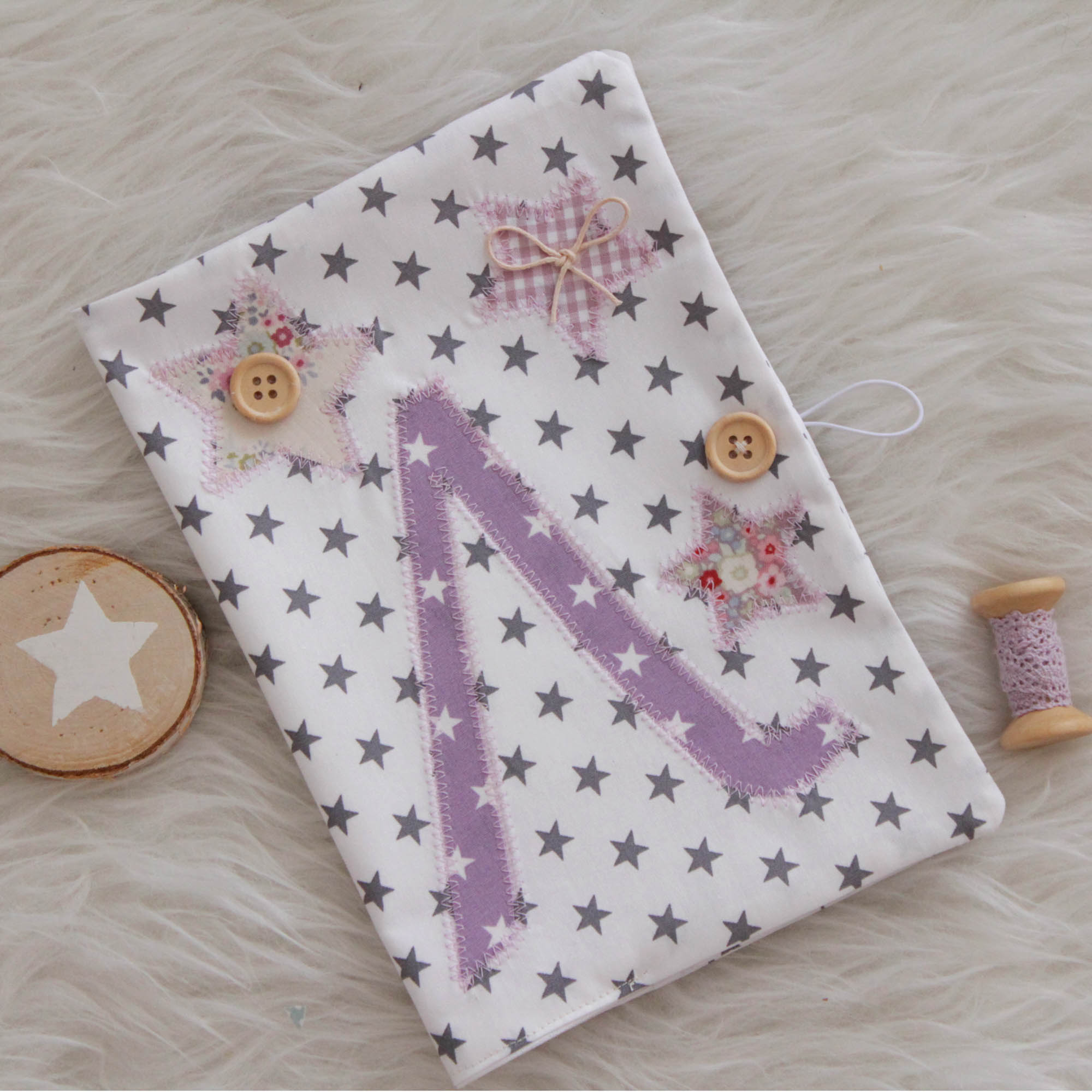 Ιδιαίτερη , χειροποίητη θήκη βιβλιαρίου υγείας σε λευκό, γκρι και μωβ αποχρώσεις από βαμβακερά υφάσματα.