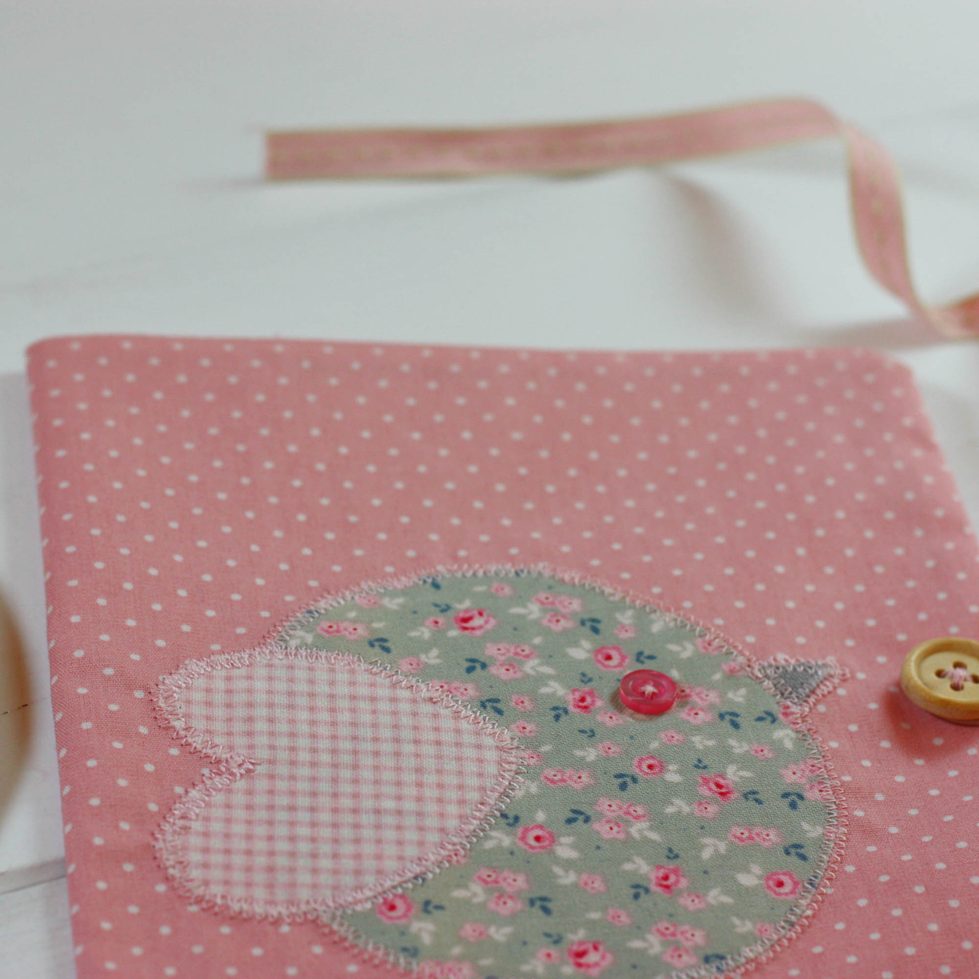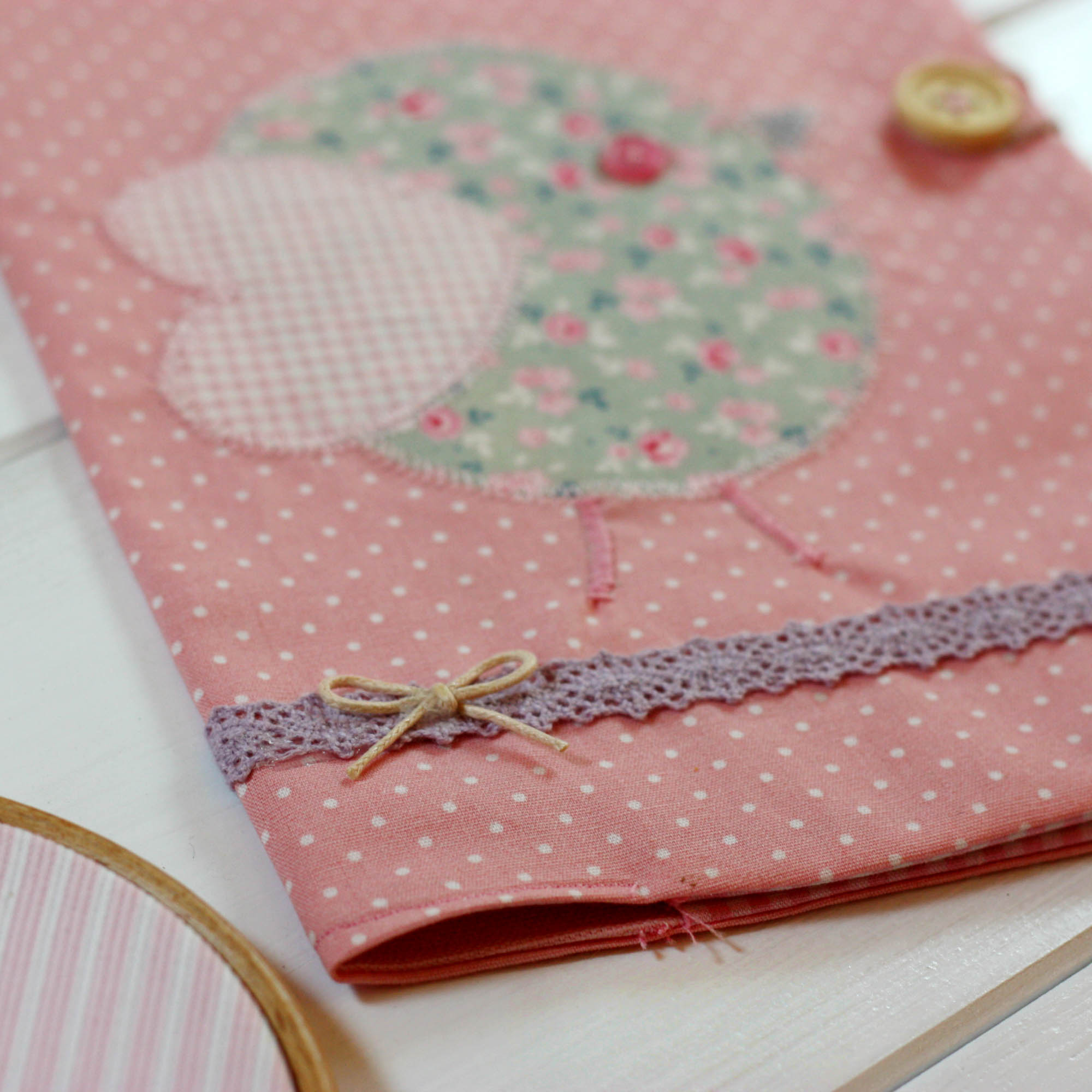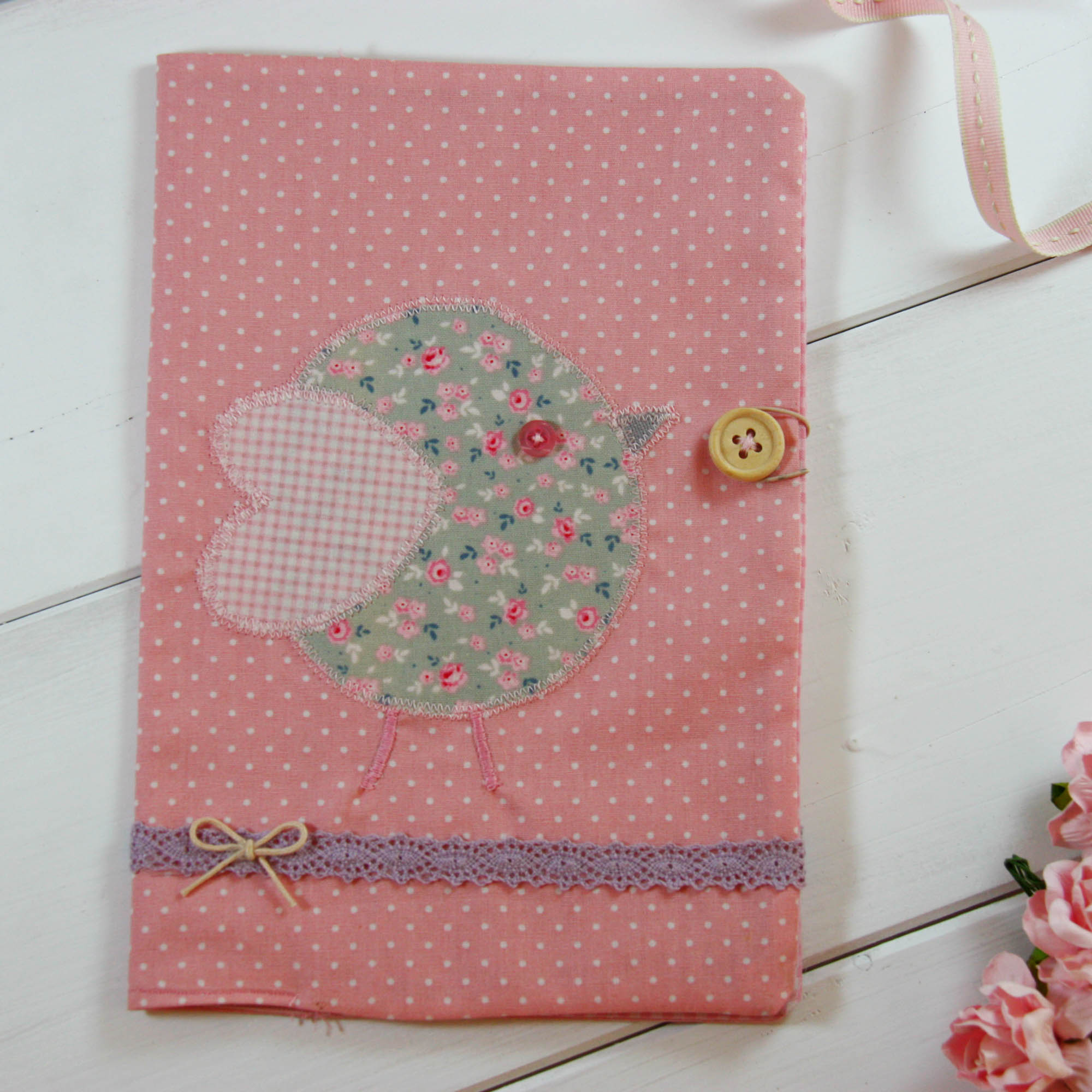 Ιδιαίτερη , χειροποίητη θήκη βιβλιαρίου υγείας σε ροζ και γκρι αποχρώσεις από βαμβακερά υφάσματα με σχέδιο πουλάκι.