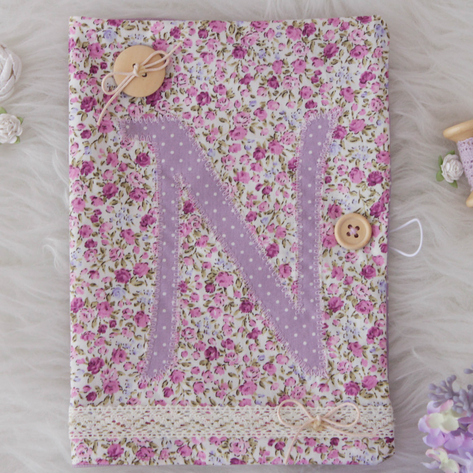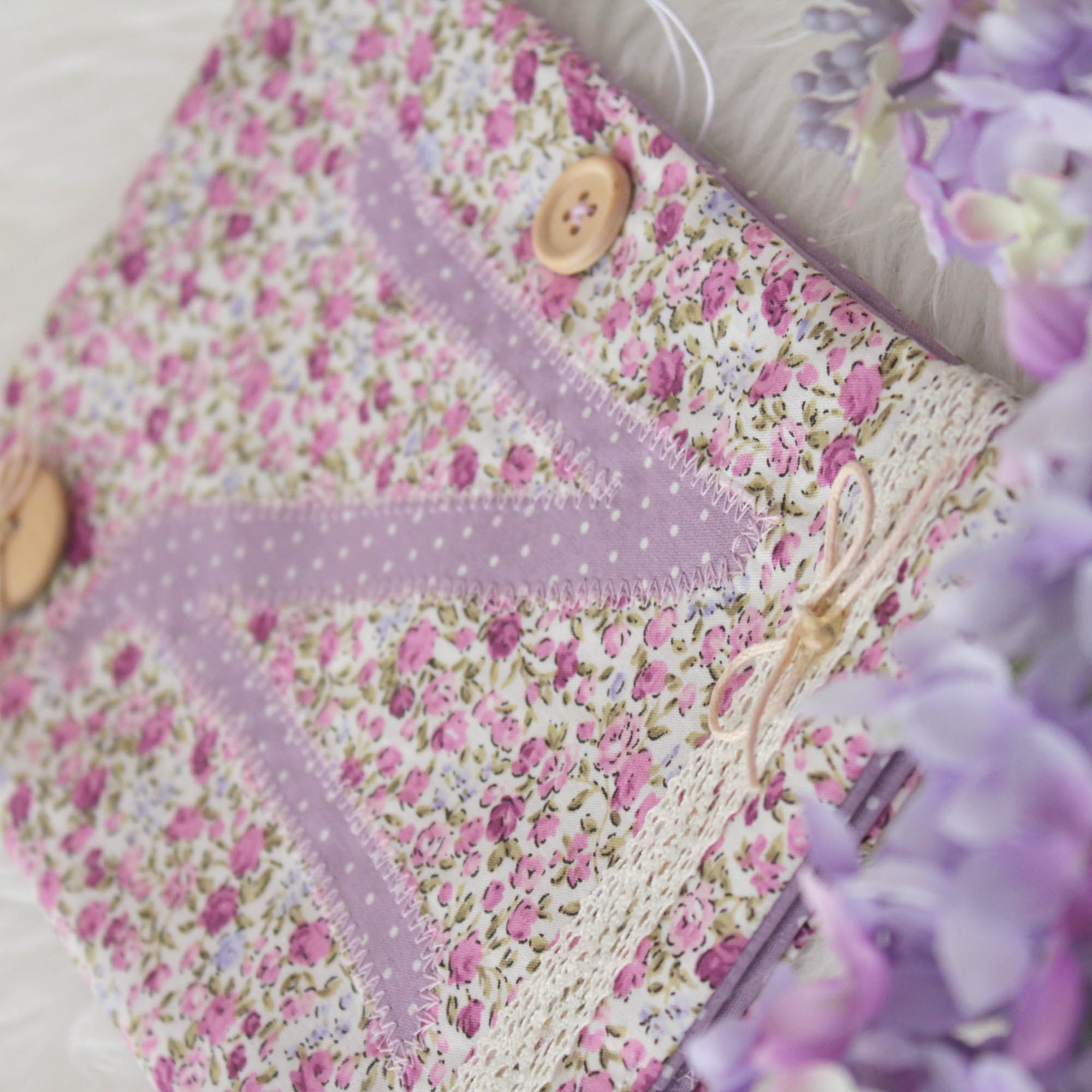 Ιδιαίτερη , χειροποίητη θήκη βιβλιαρίου υγείας σε φλοραλ μωβ αποχρώσεις από βαμβακερά υφάσματα.