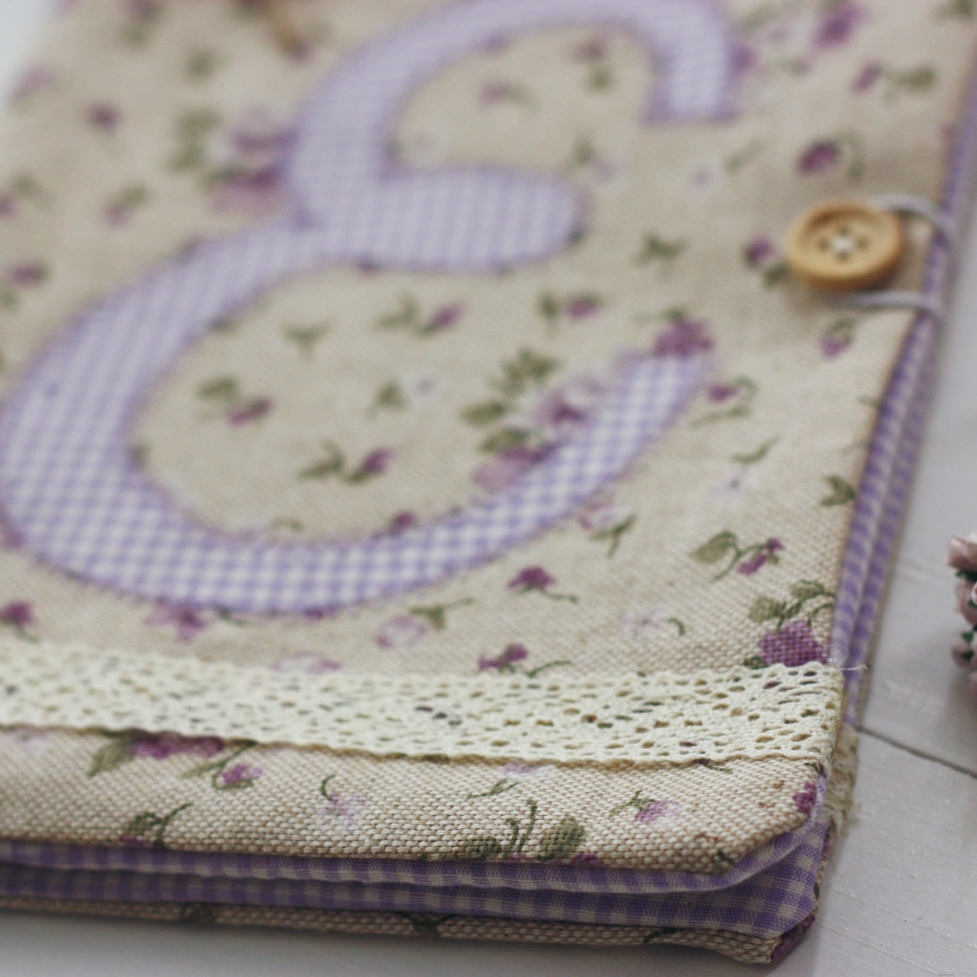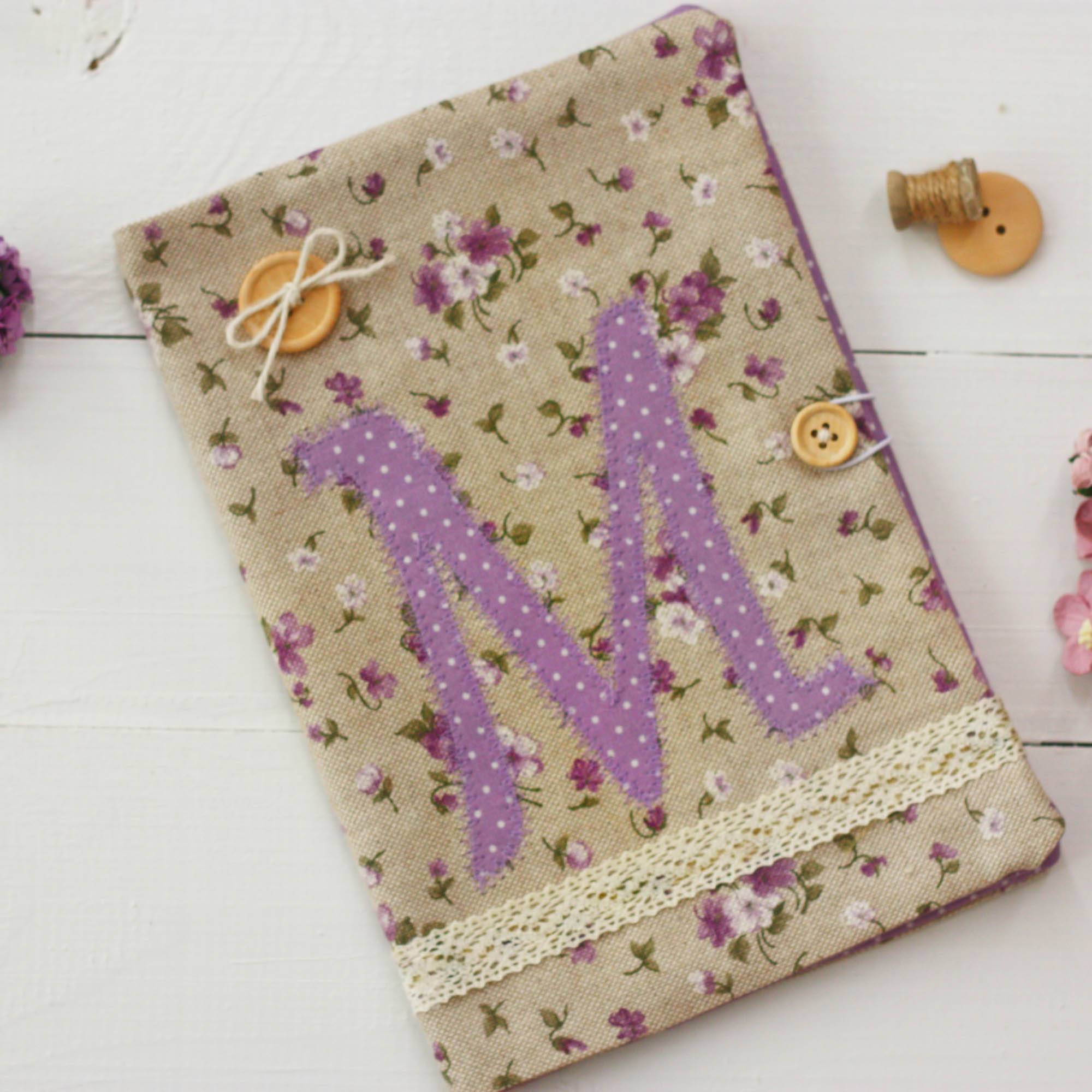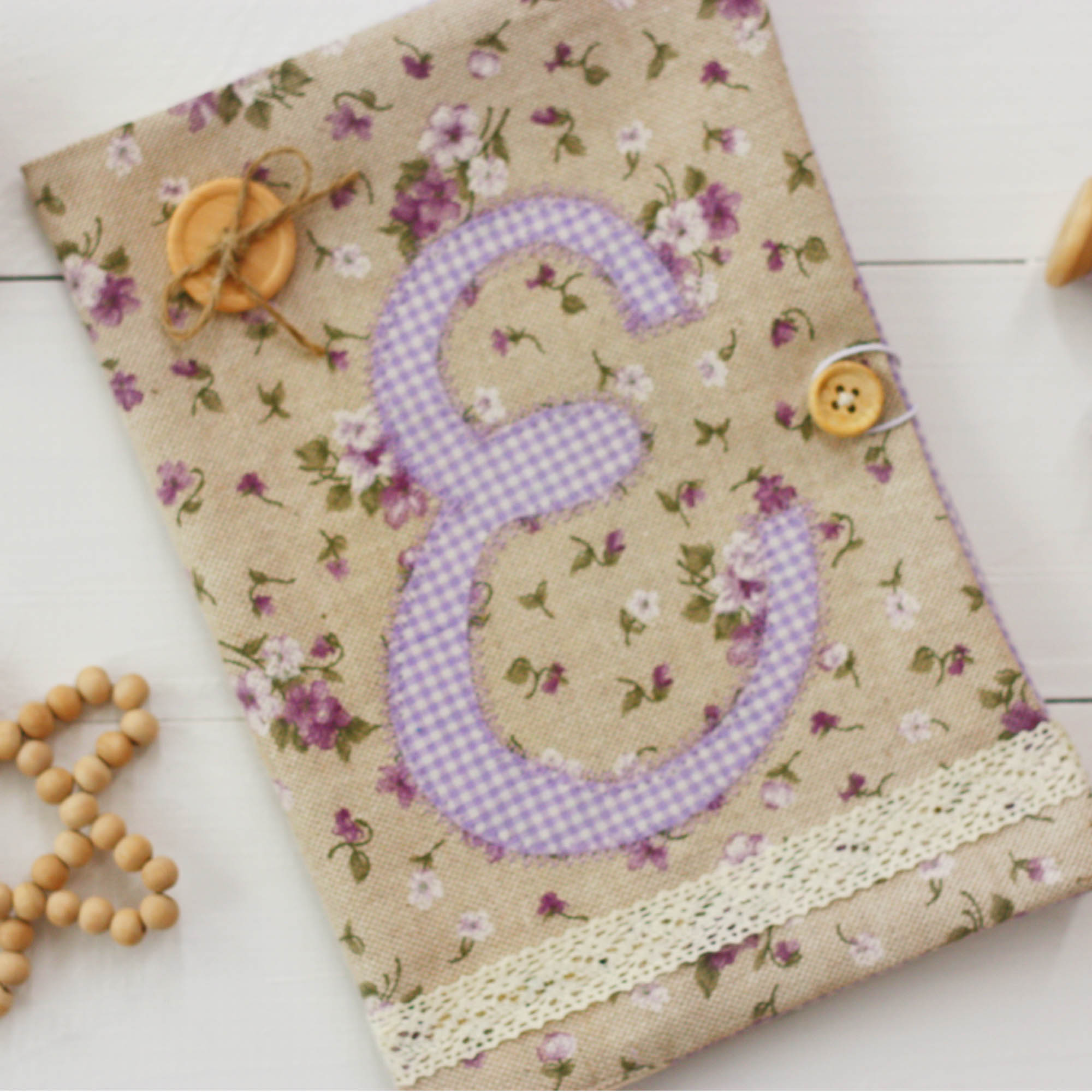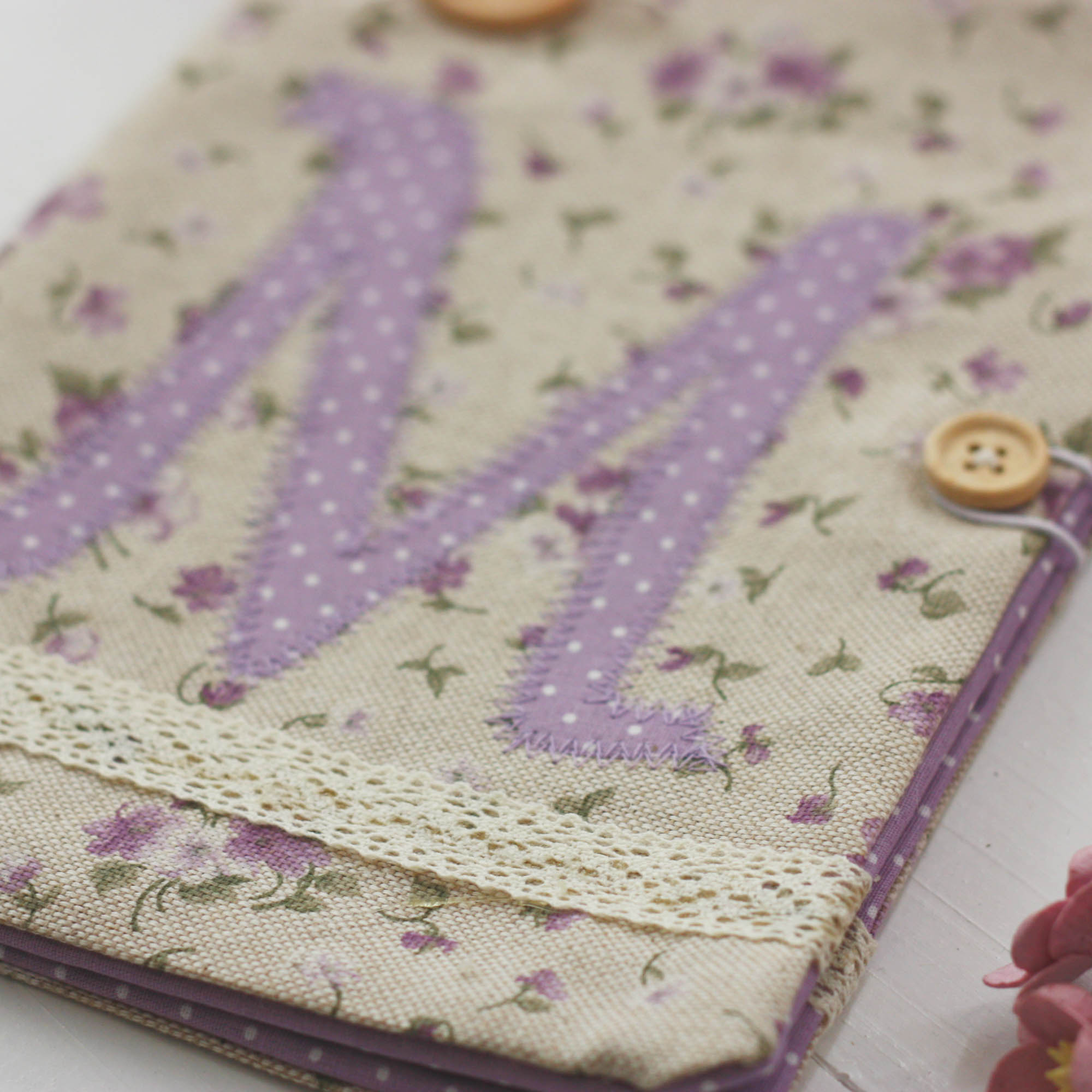 Ιδιαίτερη , χειροποίητη θήκη βιβλιαρίου υγείας σε φλοράλ μωβ αποχρώσεις από βαμβακερά υφάσματα.