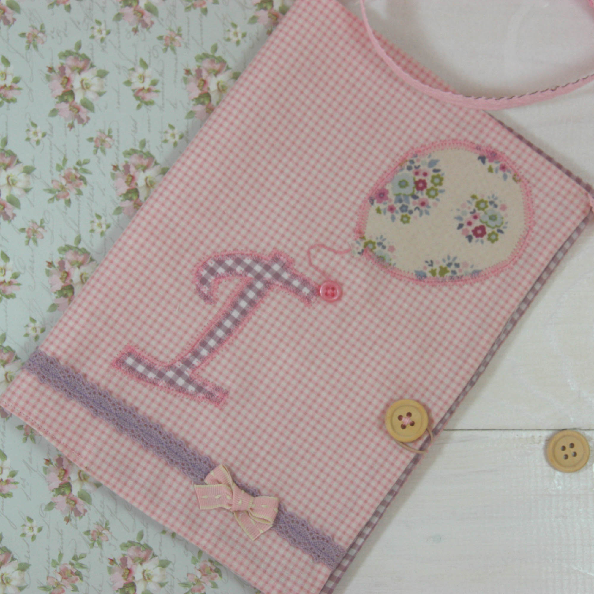 Ιδιαίτερη , χειροποίητη θήκη βιβλιαρίου υγείας σε ροζ και μωβ αποχρώσεις από βαμβακερά υφάσματα.