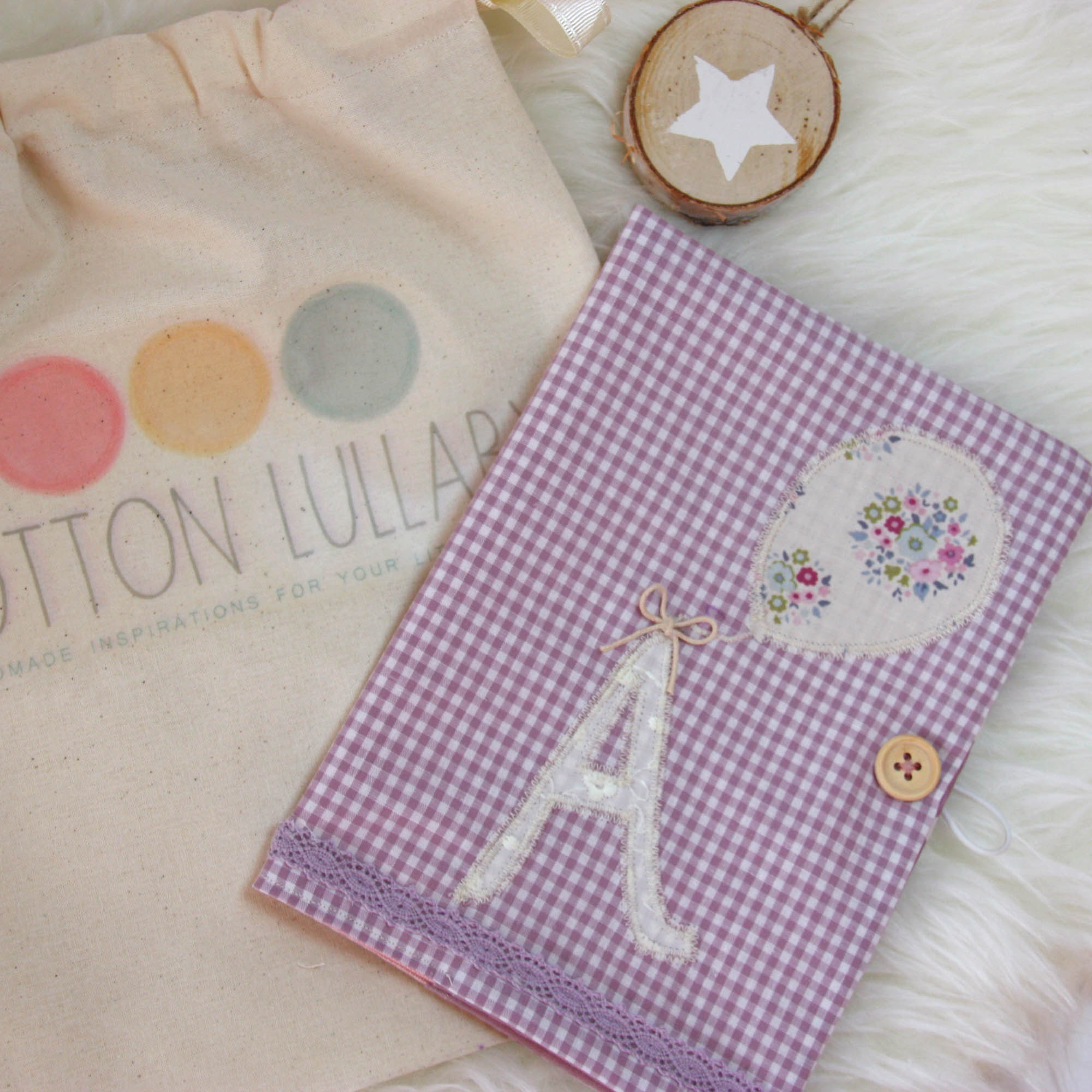 Ιδιαίτερη , χειροποίητη θήκη βιβλιαρίου υγείας σε μωβ αποχρώσεις από βαμβακερά υφάσματα.