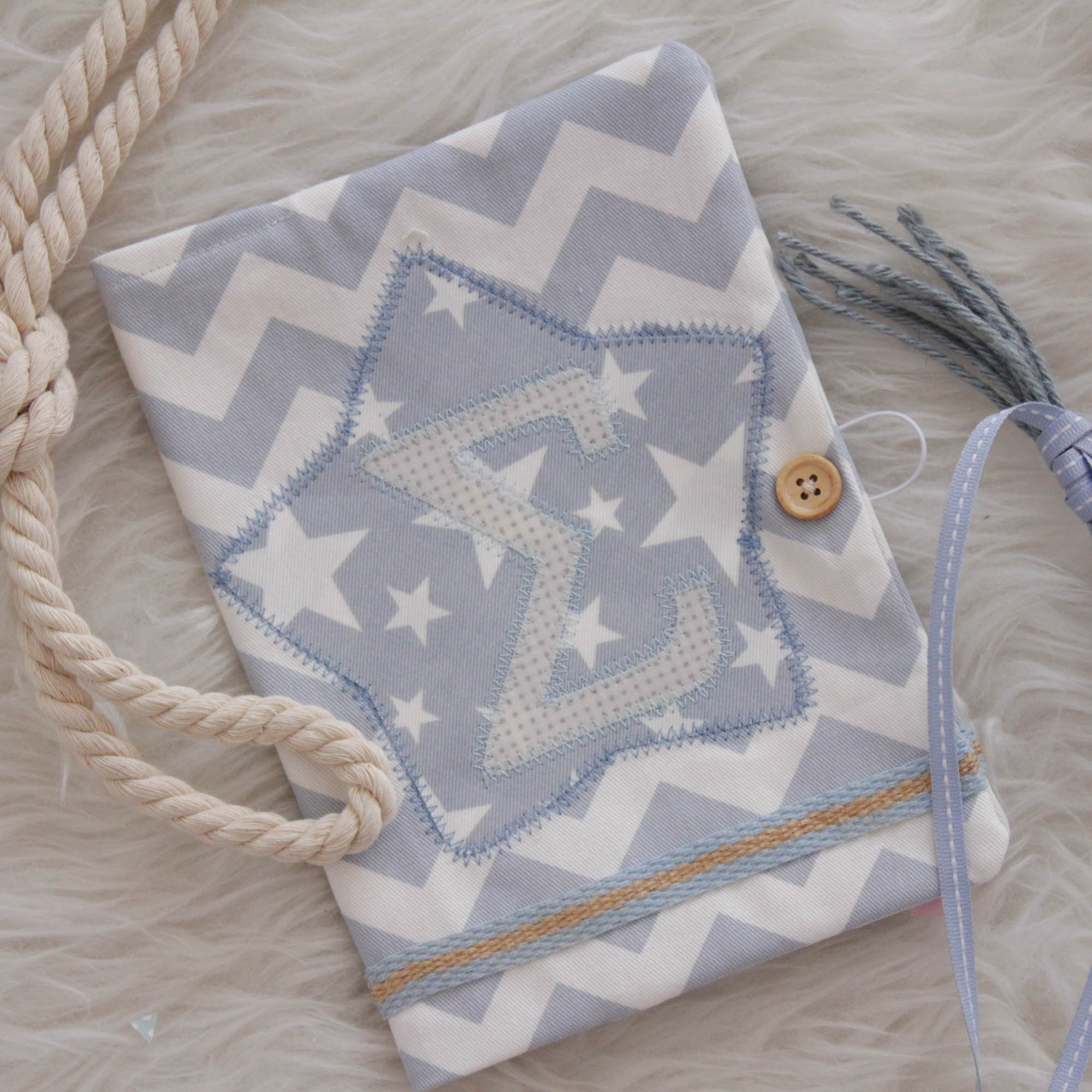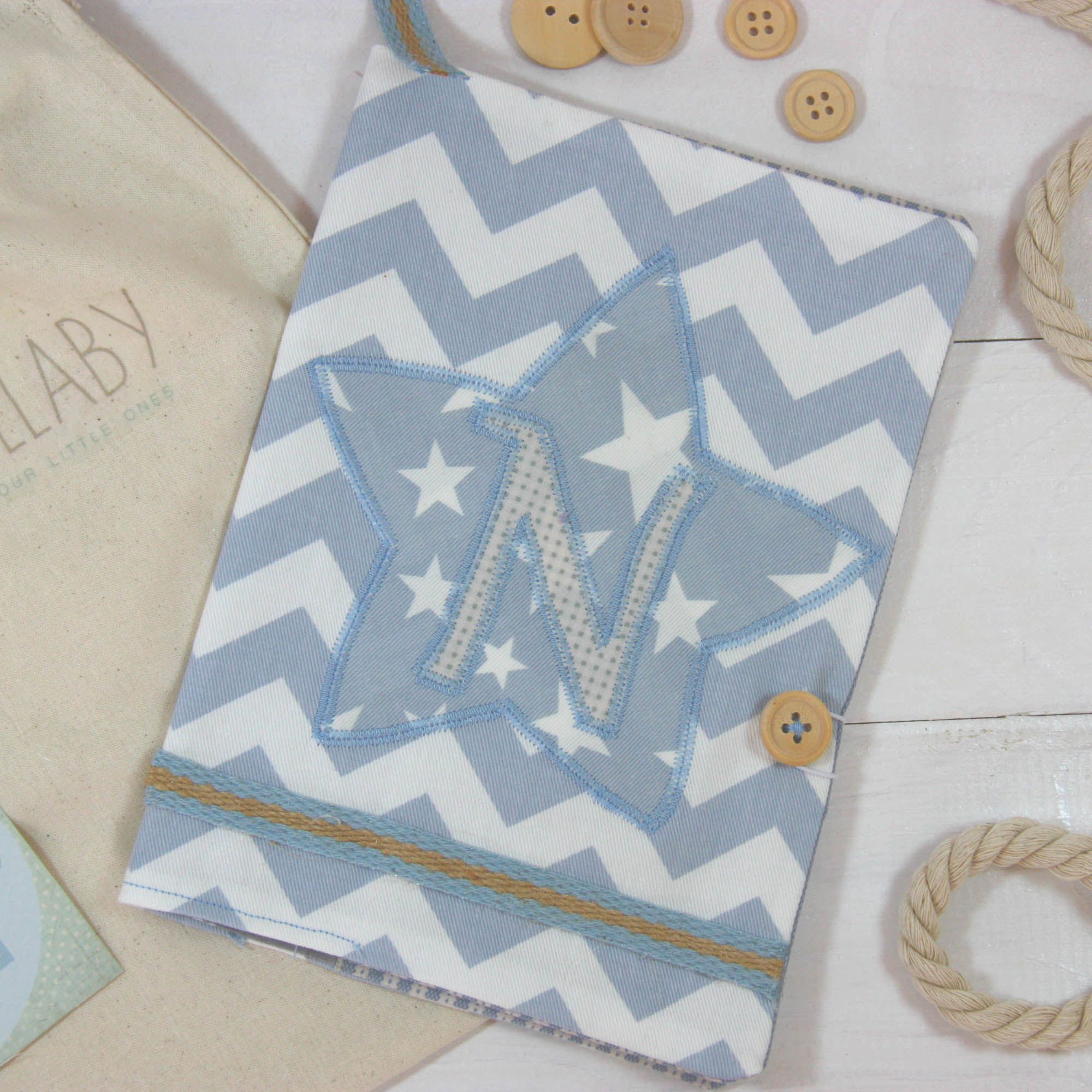 Ιδιαίτερη , χειροποίητη θήκη βιβλιαρίου υγείας σε θαλασσί αποχρώσεις από βαμβακερά υφάσματα.
