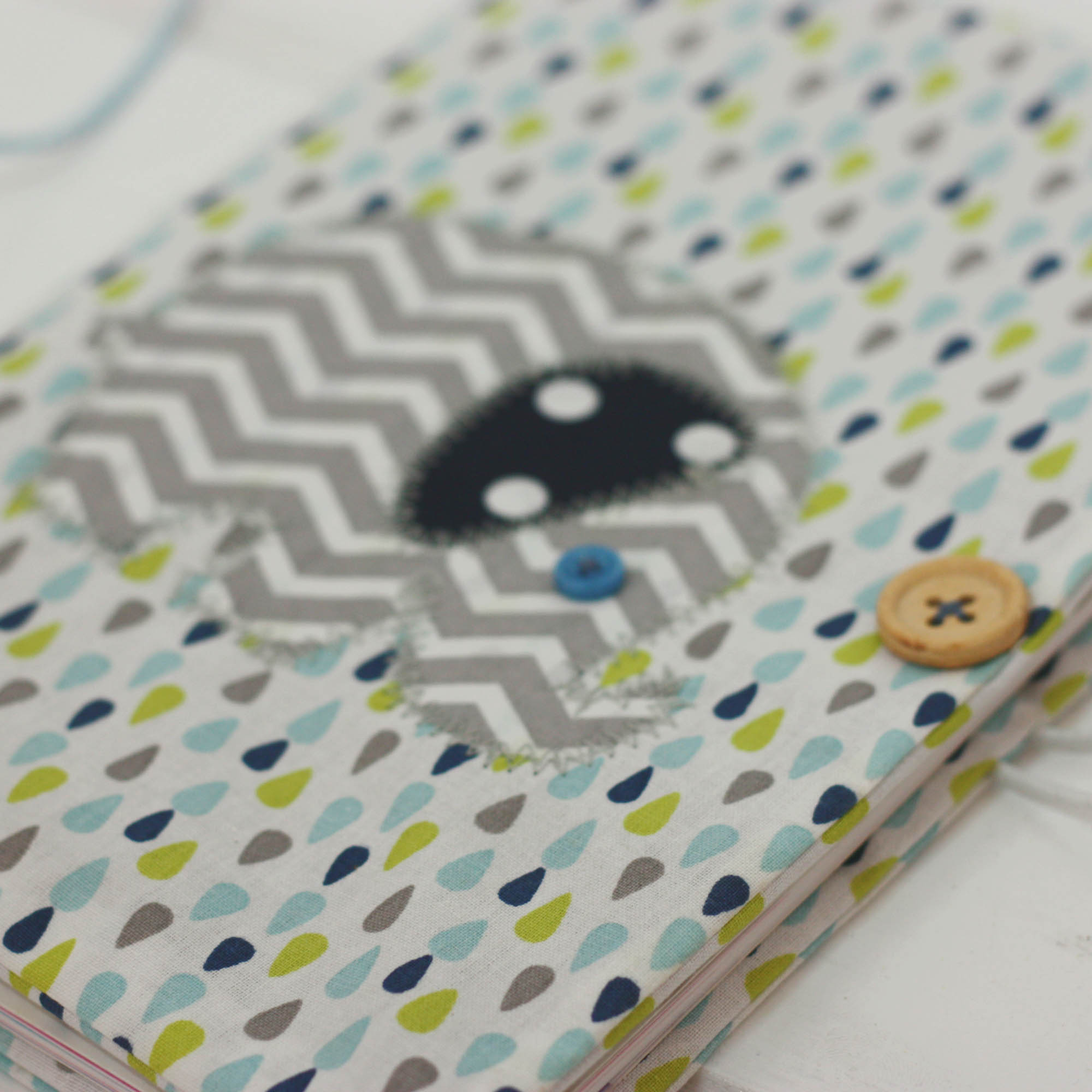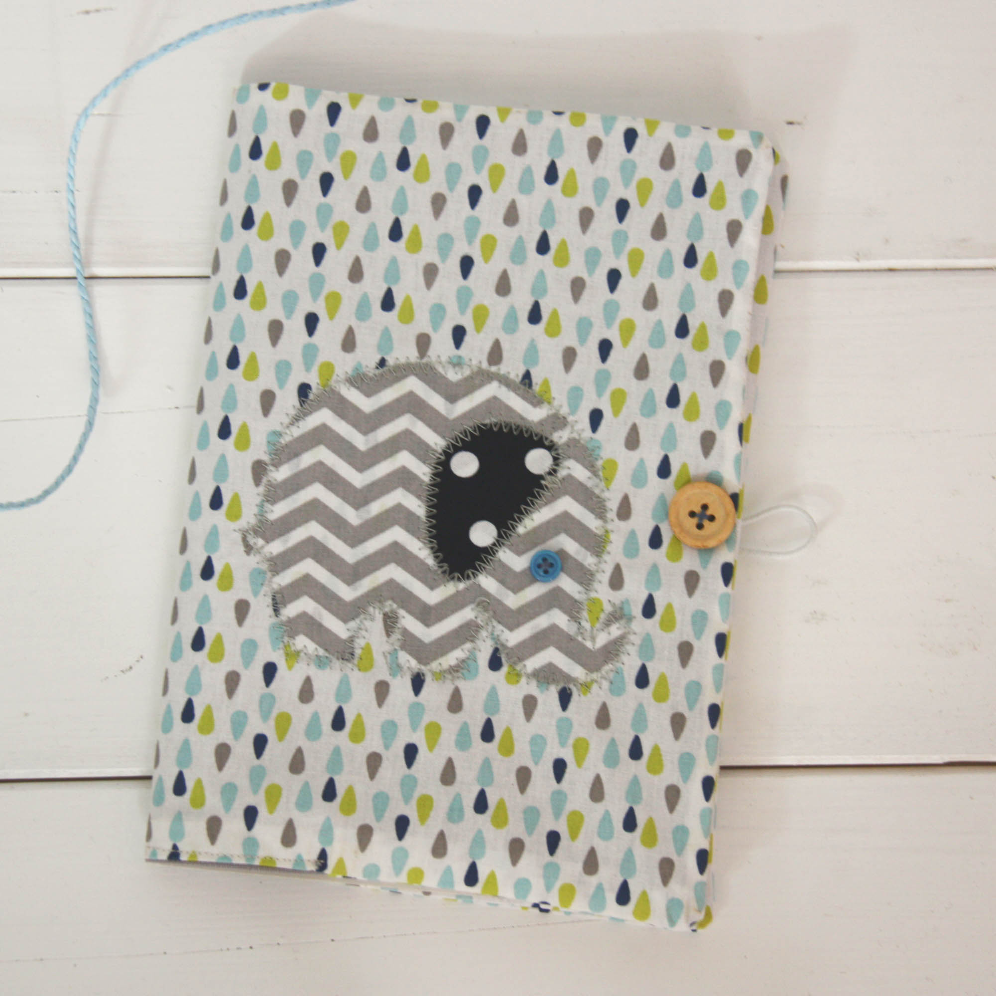 Ιδιαίτερη , χειροποίητη θήκη βιβλιαρίου υγείας σε αποχρώσεις γκρι, μπλε και πράσινες από βαμβακερά υφάσματα σε σχέδιο ελεφαντάκι.
