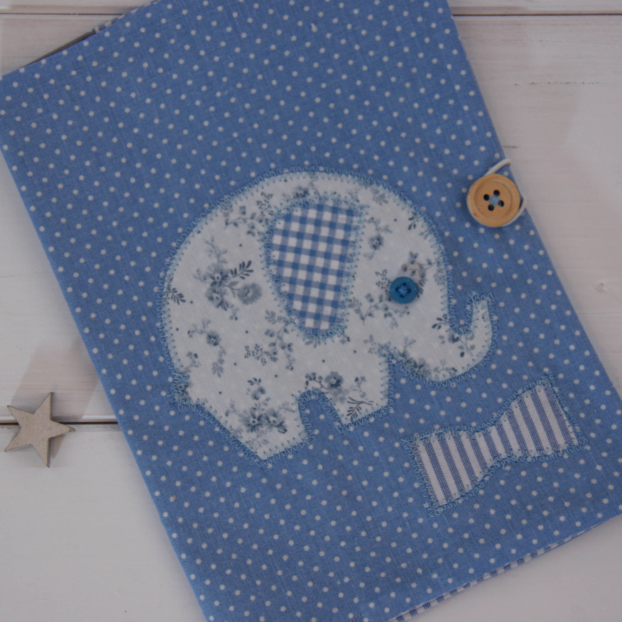 Ιδιαίτερη , χειροποίητη θήκη βιβλιαρίου υγείας σε θαλασσί αποχρώσεις από βαμβακερά υφάσματα με σχέδιο ελεφαντάκι.