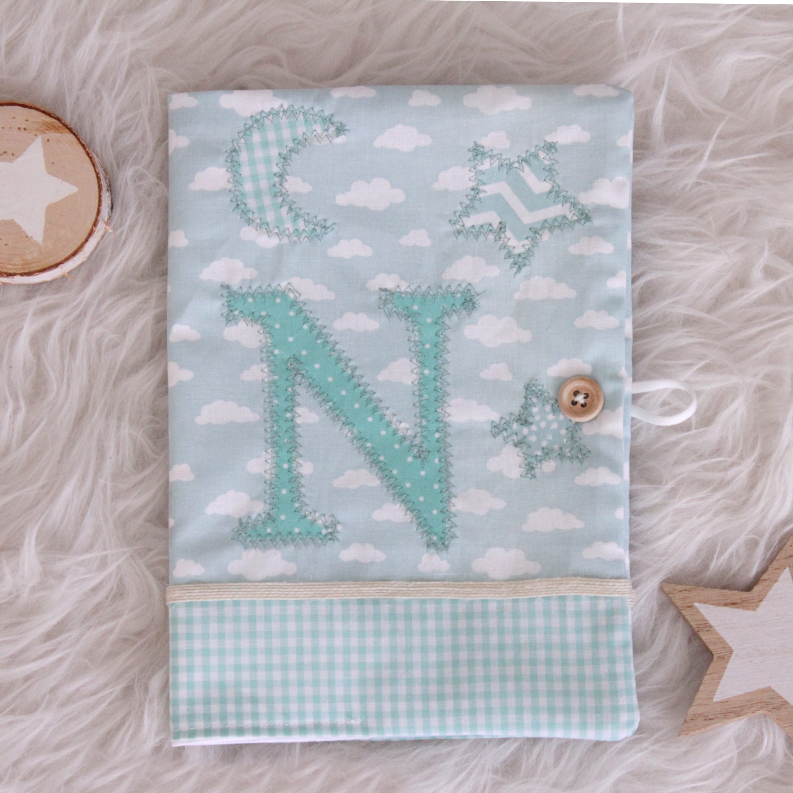 Ιδιαίτερη , χειροποίητη θήκη βιβλιαρίου υγείας σε μέντα αποχρώσεις από βαμβακερά υφάσματα.