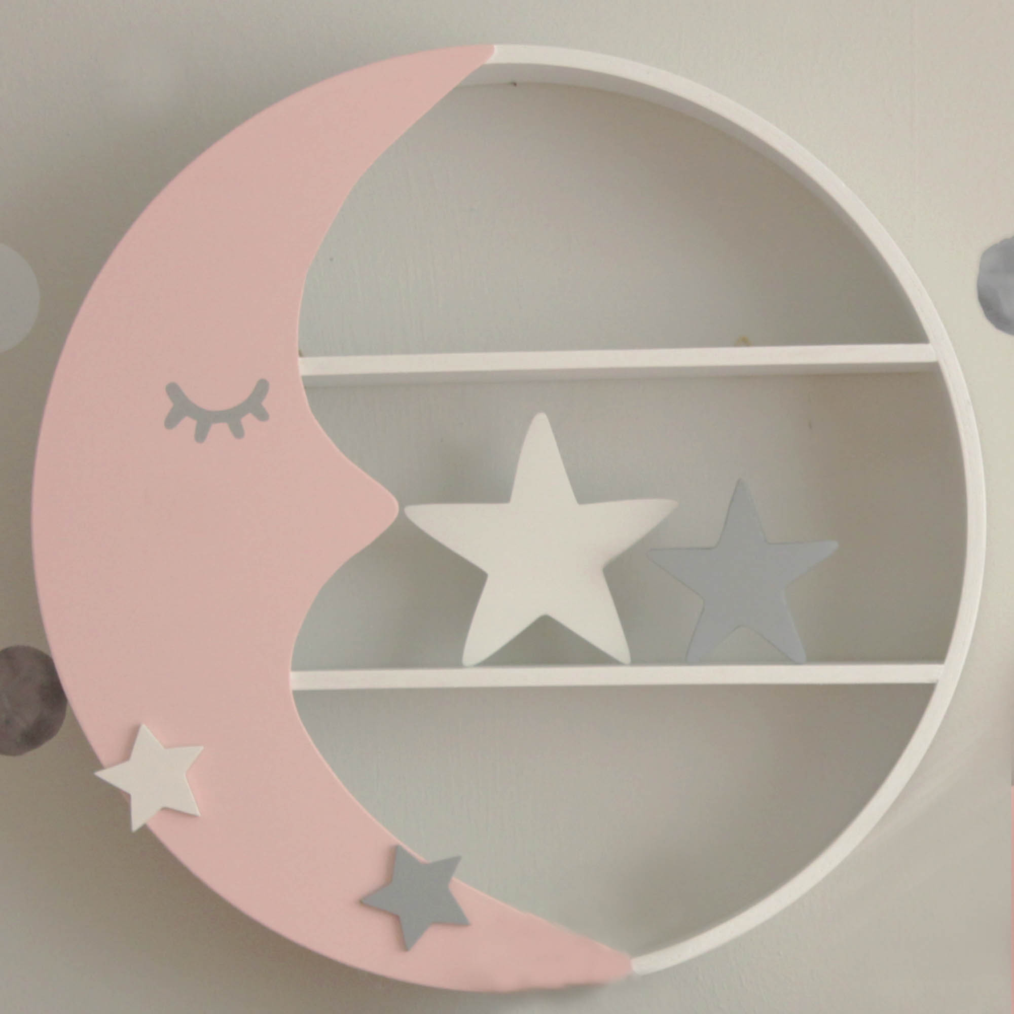 Παραμυθένιο στρογγυλό ραφάκι σε σχέδιο φεγγάρι που έχετε λατρέψει και αποτελεί το ιδανικό διακοσμητικό για το παιδικό δωμάτιο. Είναι σε χρώμα λευκό με ροζ φεγγάρι και δύο διακοσμητικά αστεράκια χρώματος λευκό και γκρι.