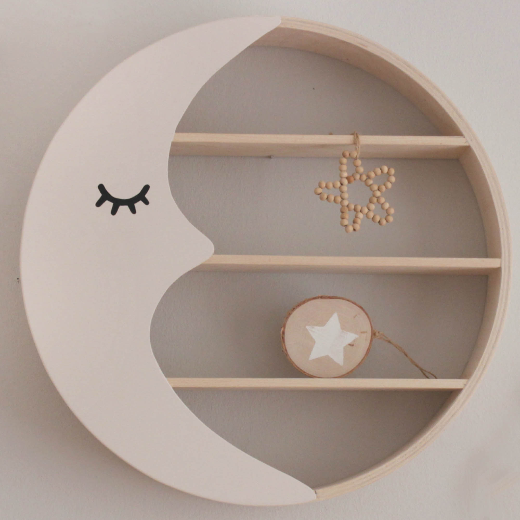 Παραμυθένιο στρογγυλό ραφάκι σε σχέδιο φεγγάρι που έχετε λατρέψει και αποτελεί το ιδανικό διακοσμητικό για το παιδικό δωμάτιο. Είναι σε χρώμα φυσικό με εκρού/μπεζ φεγγαράκι.