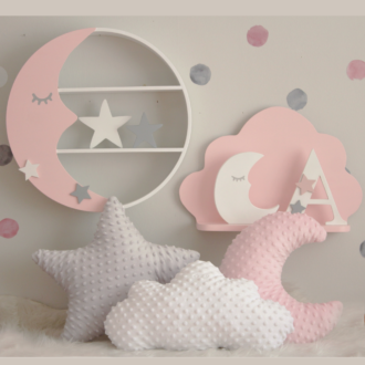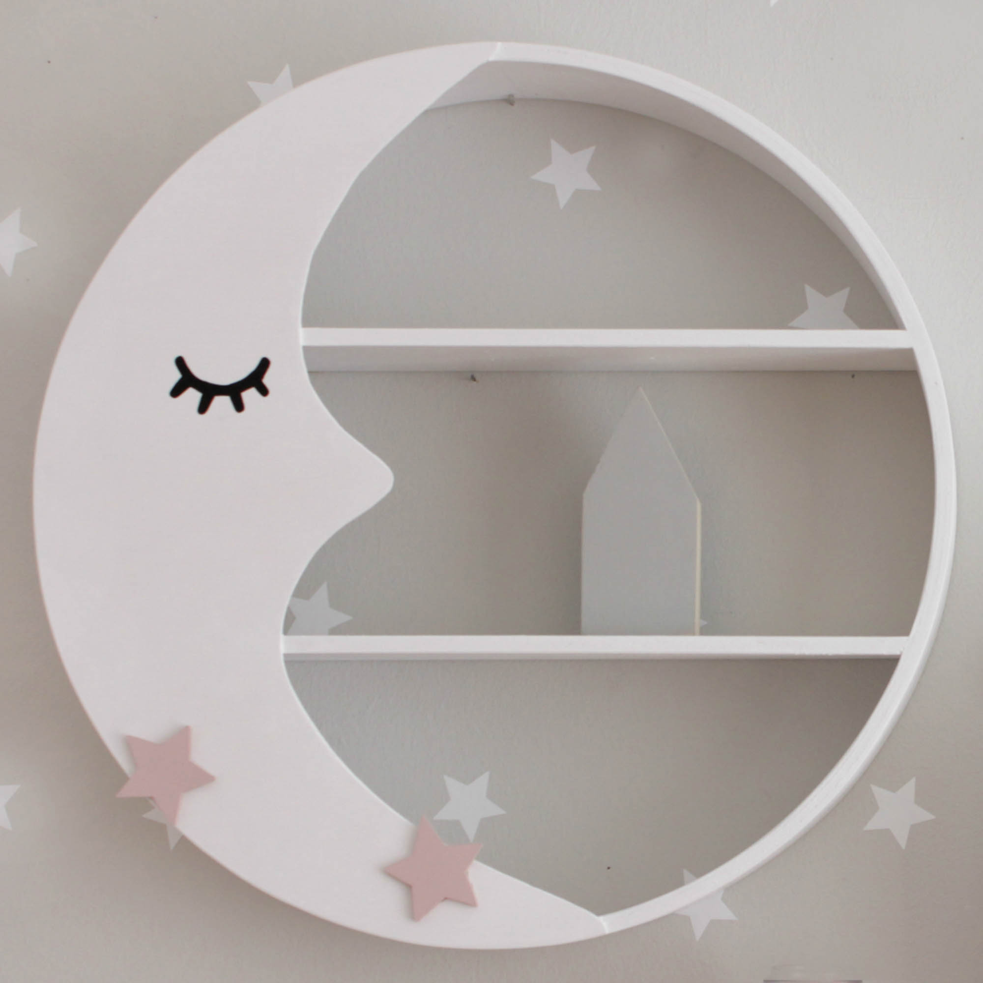 Παραμυθένιο στρογγυλό ραφάκι σε σχέδιο φεγγάρι που έχετε λατρέψει και αποτελεί το ιδανικό διακοσμητικό για το παιδικό δωμάτιο. Είναι σε χρώμα λευκό με δύο αστεράκια ροζ.