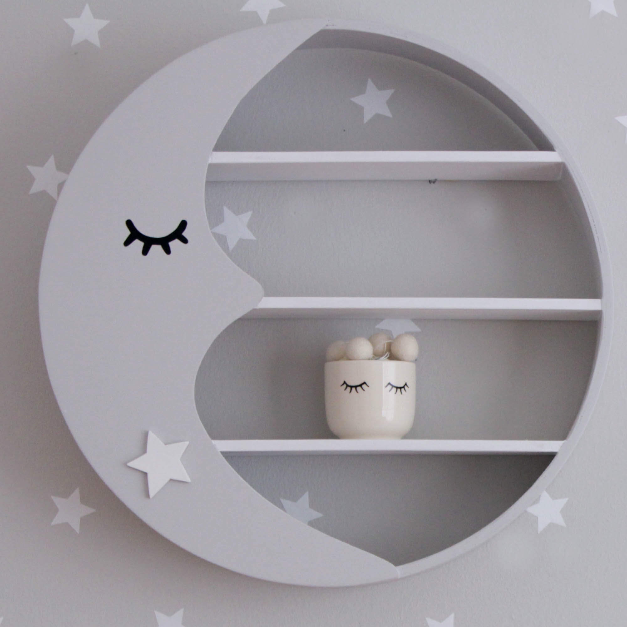Παραμυθένιο στρογγυλό ραφάκι σε σχέδιο φεγγάρι που έχετε λατρέψει και αποτελεί το ιδανικό διακοσμητικό για το παιδικό δωμάτιο. Είναι σε χρώμα γκρι απαλό όλο το ράφι με λευκά μόνο ραφάκια και ένα αστεράκι λευκό.