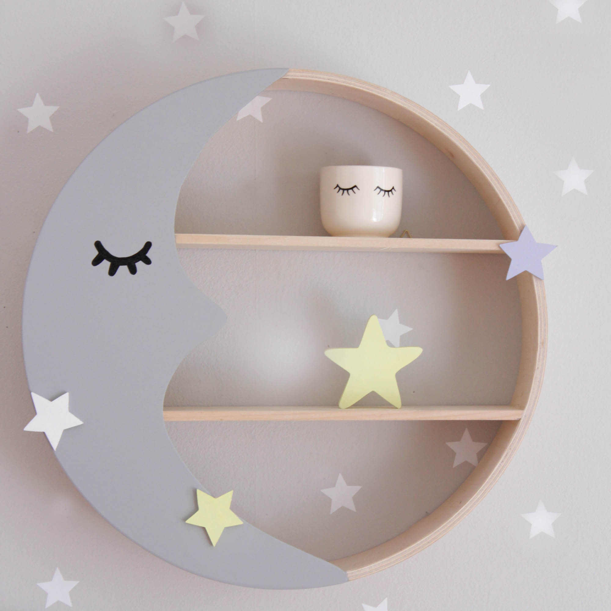 Παραμυθένιο στρογγυλό ραφάκι σε σχέδιο φεγγάρι που έχετε λατρέψει και αποτελεί το ιδανικό διακοσμητικό για το παιδικό δωμάτιο. Είναι σε χρώμα φυσικό με γκρι φεγγάρι και τρία αστεράκια λευκό,κίτρινο και θαλασσί.
